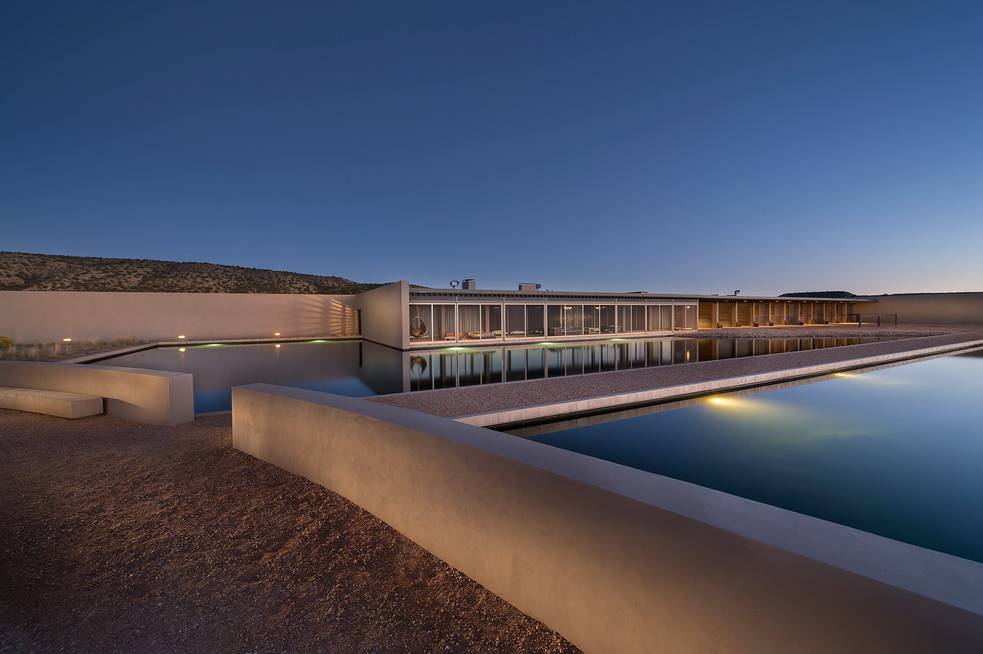 Designs often incorporate sustainable materials, passive solar techniques, and a seamless indoor-outdoor living experience, appealing to buyers looking for both luxury and efficiency. Different schools of thought influence contemporary homes in Santa Fe, from minimalist modernism to organic architecture that integrates homes into the desert surroundings. Architects like Antoine Predock are known for sculptural forms that echo the terrain, while Ricardo Legorreta introduced bold geometric shapes and vibrant colors influenced by Mexican modernism. Some contemporary homes take inspiration from mid-century modern principles, featuring flat roofs, open spaces, and an emphasis on natural materials like stone, steel, and wood. Others lean toward high-tech minimalism, with smart-home features, polished concrete floors, and floor-to-ceiling glass that dissolves the boundary between home and nature.