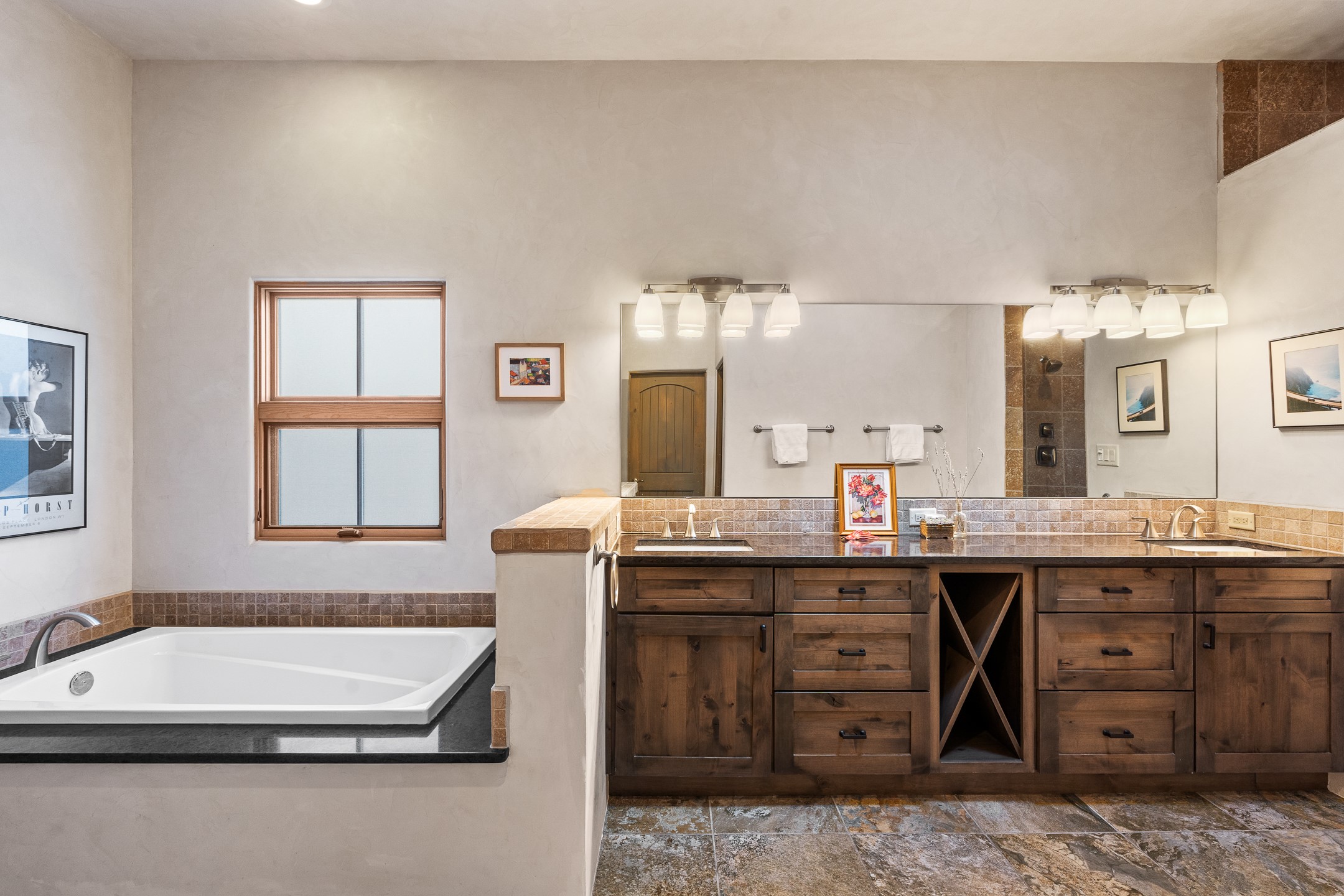 The well-designed floor plan provides excellent separation of spaces. A generous guest bedroom features an en-suite bath, while a versatile office or third bedroom includes a private exterior entrance—perfect for guests, creative pursuits, or a home office. Stone flooring throughout creates a clean, modern aesthetic, complemented by forced air heating and air conditioning for year-round comfort.