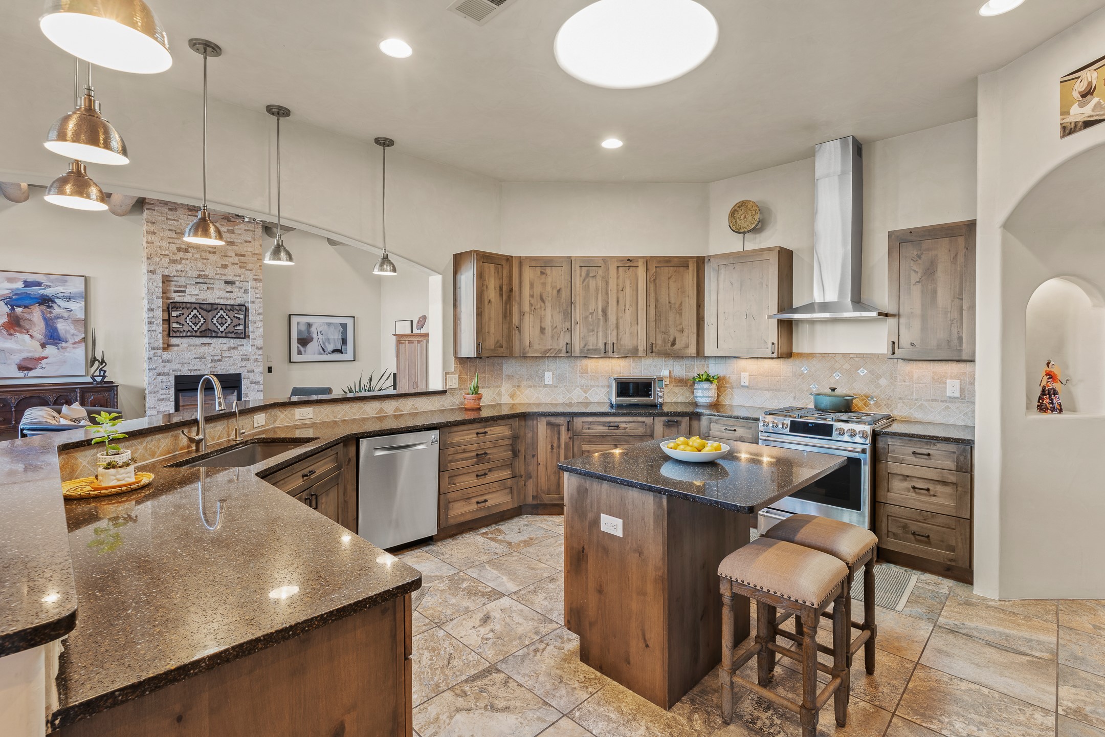The open-concept living, dining, and kitchen areas offer a seamless yet well-defined flow. The living room is highlighted by exposed beams, a gas fireplace, and tall windows that flood the space with natural light. The spacious kitchen is appointed with knotty alder cabinetry, extensive solid-surface countertops for food preparation, a stainless-steel range with exterior venting, a center island, and a built-in desk area—ideal for everyday living and entertaining.