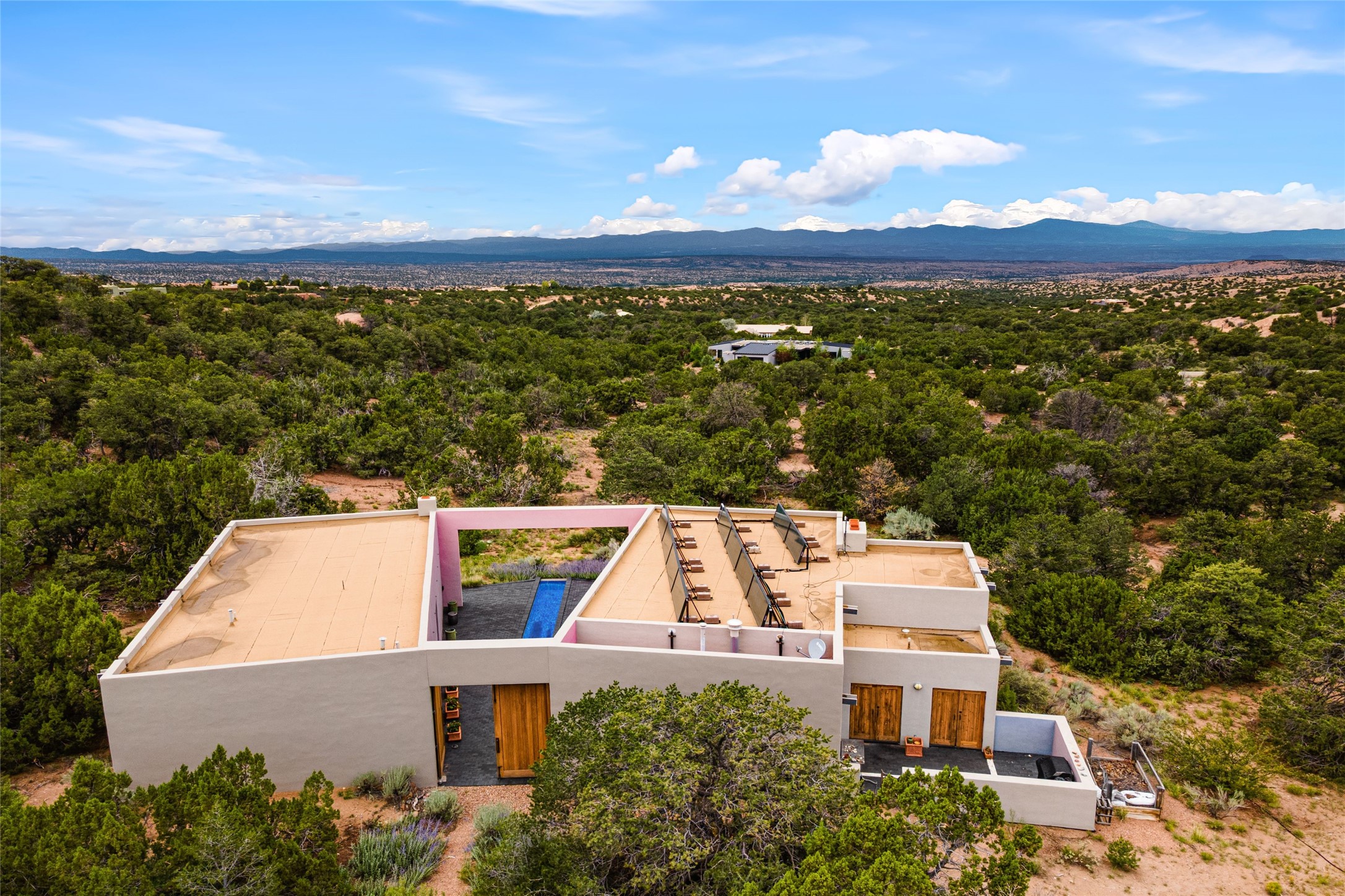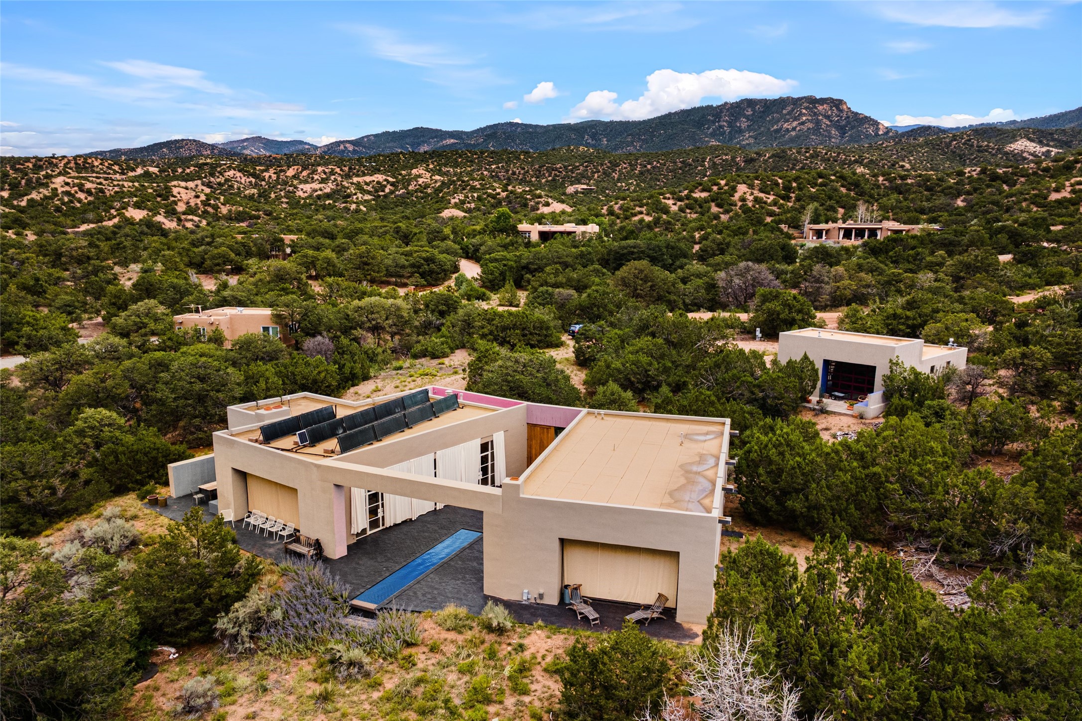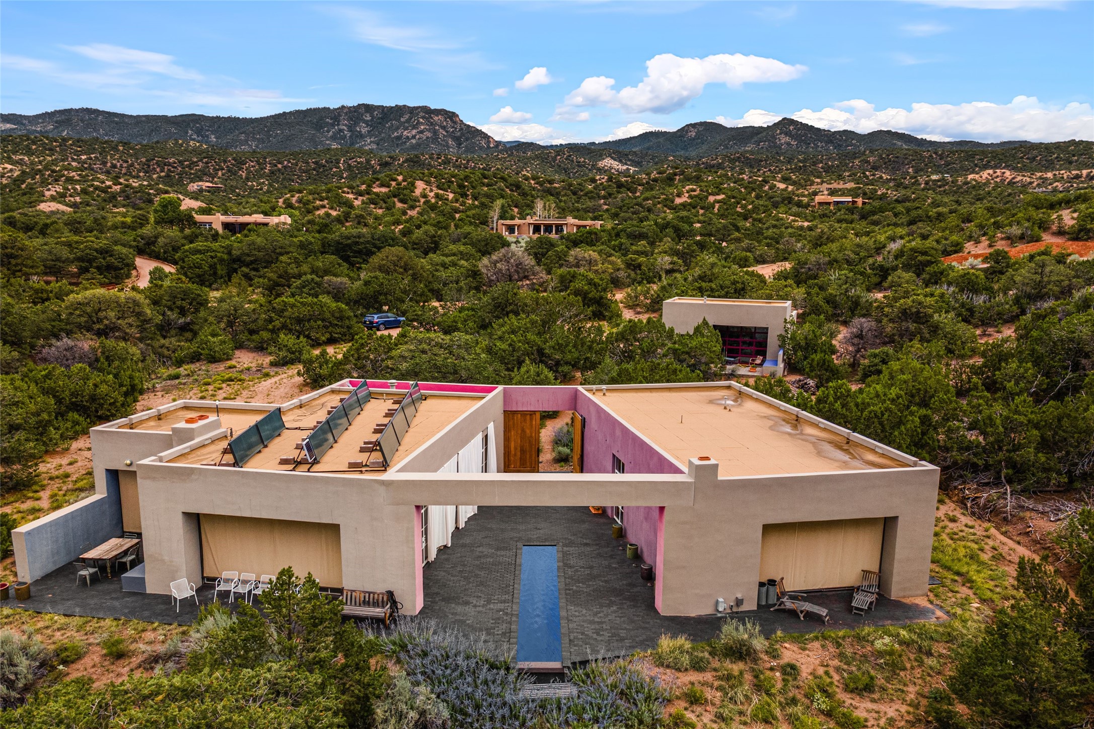 Stunning Modernist artist retreat in Tesuque located on a heavily wooded 7+/- acre view lot. Conceived by the owner as a private residence including a spectacular professional studio high on a ridge above the residence, the living quarters are divided into two structures separated by a spacious bricked patio.