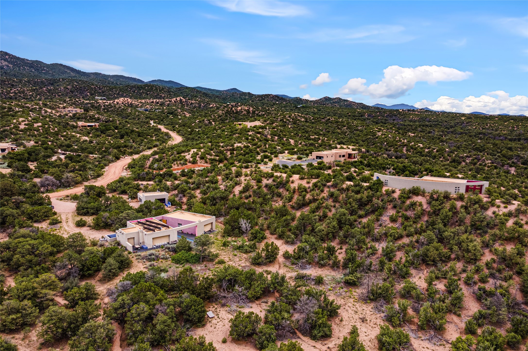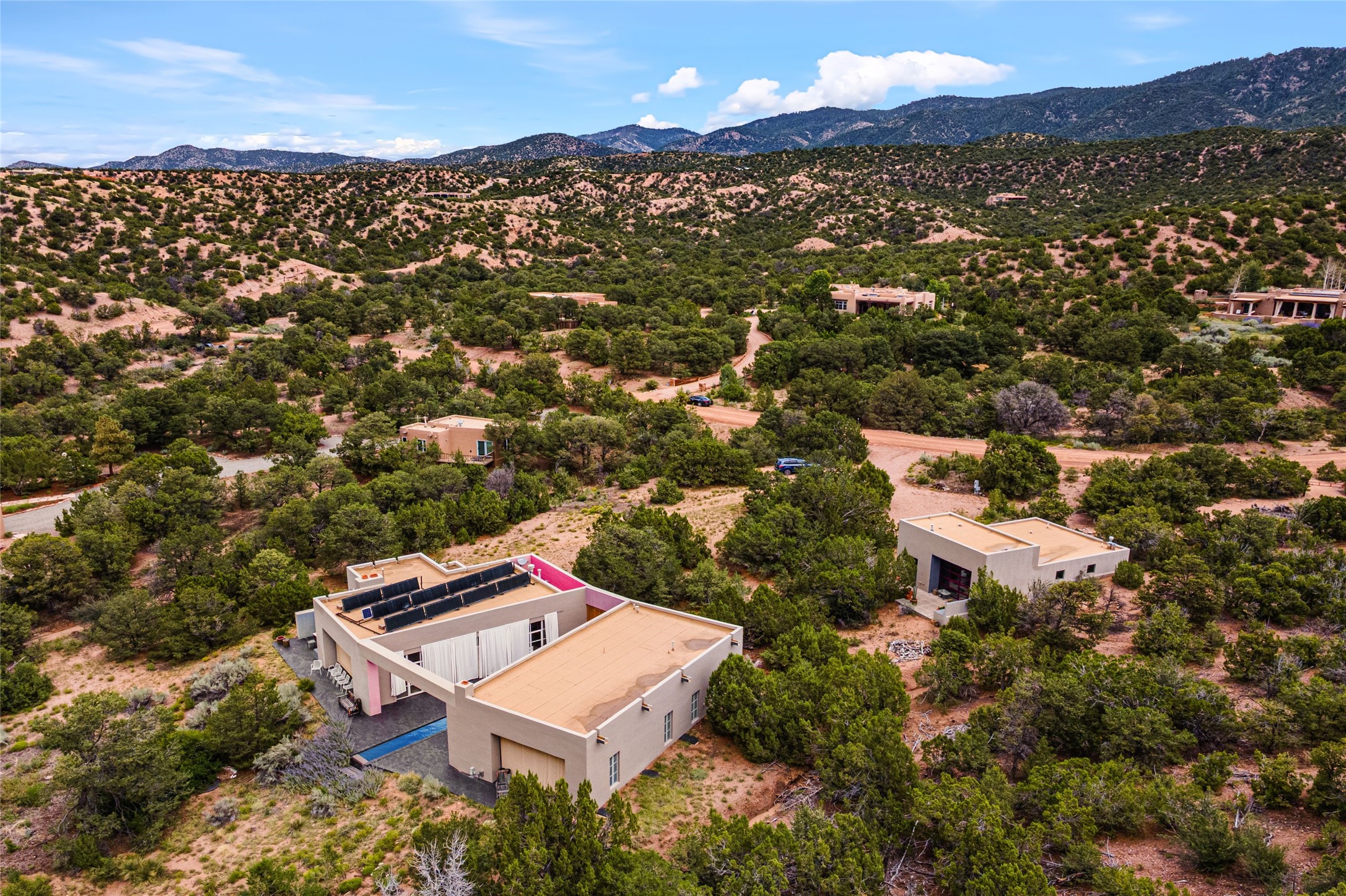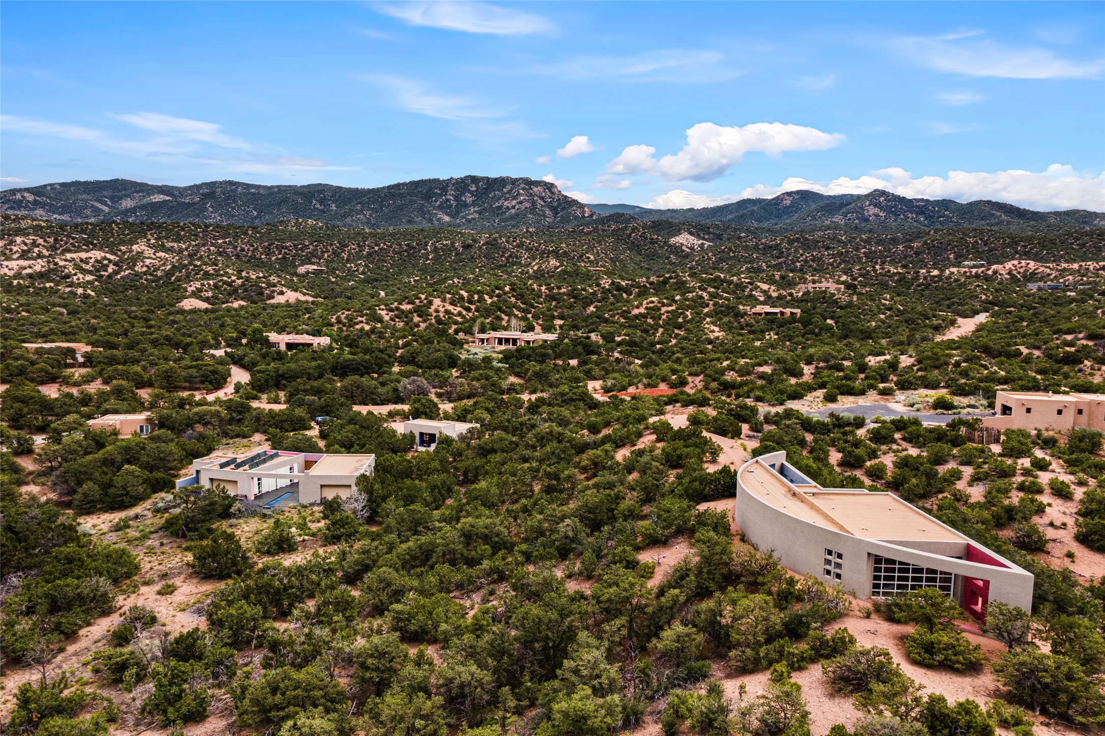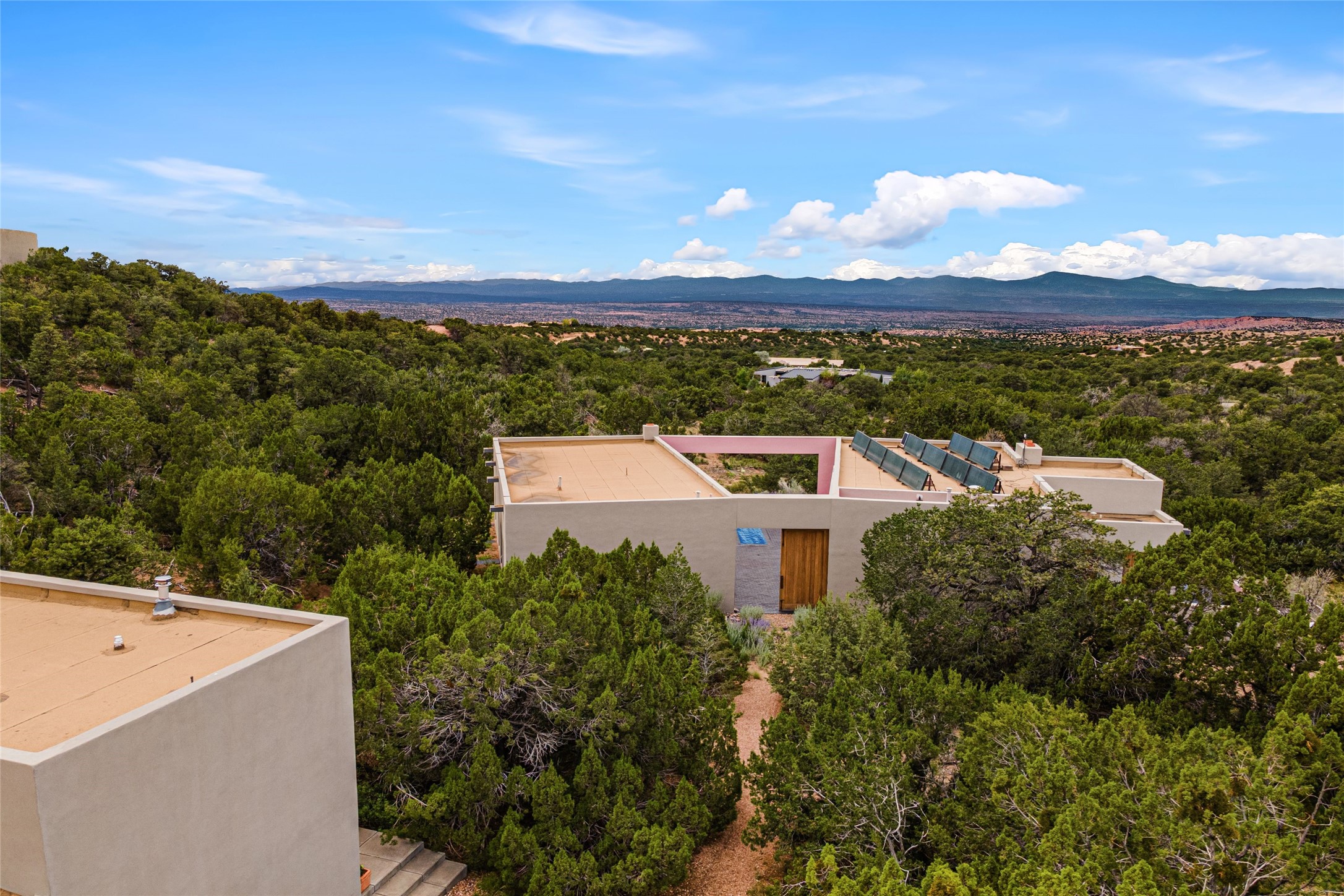 Stunning Modernist artist retreat in Tesuque located on a heavily wooded 7+/- acre view lot. Conceived by the owner as a private residence including a spectacular professional studio high on a ridge above the residence, the living quarters are divided into two structures separated by a spacious bricked patio.
