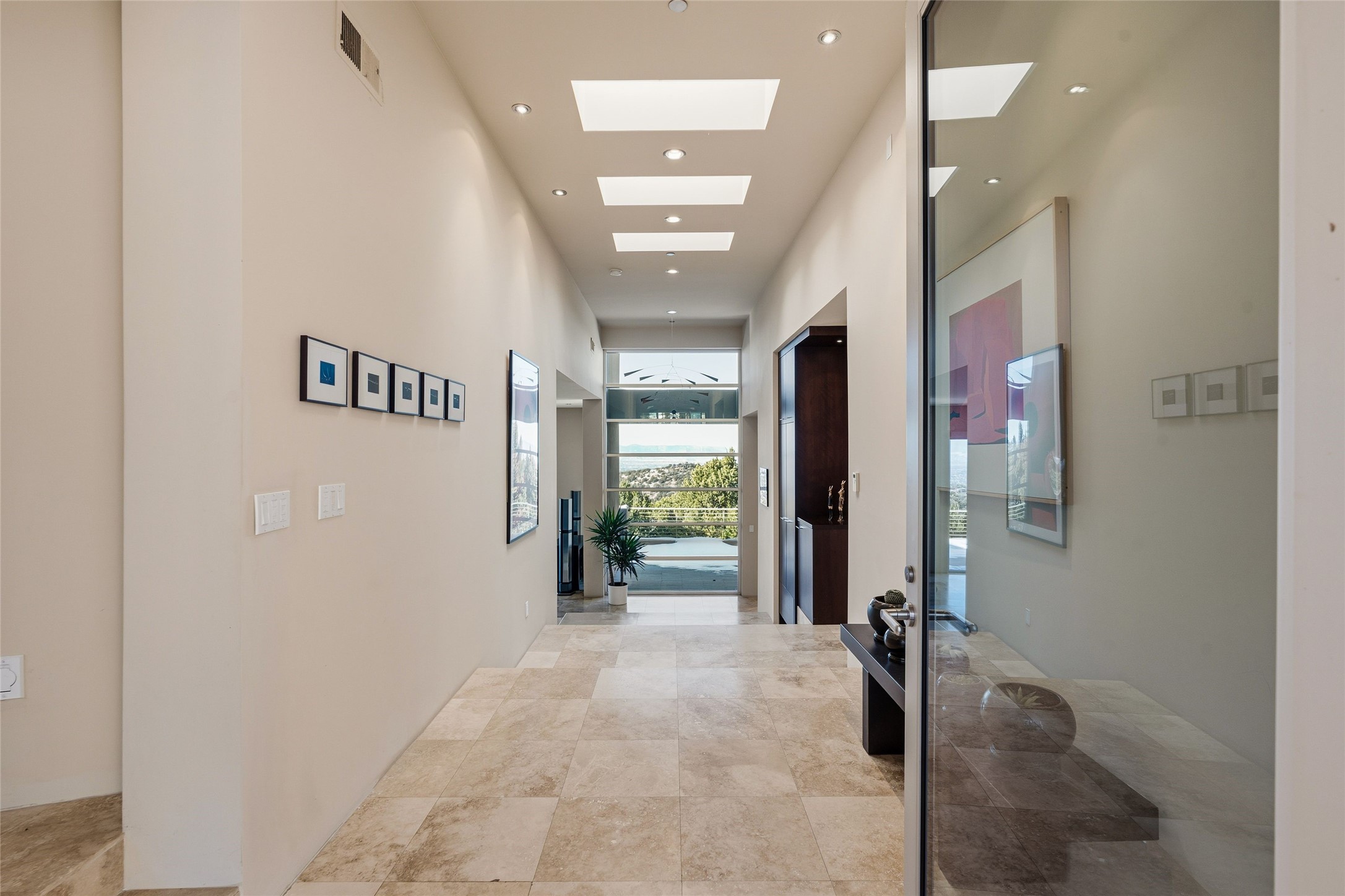 Nestled into the crest of the highest ridge within the gated High Summit community, this exceptional residence blends contemporary design, remarkable privacy, and unforgettable panoramic views. Built in 2008, and offered with three additional vacant lots, the property presents a rare opportunity for enhanced seclusion as well as future expansion and development. Generous spacing between neighboring homes creates a true sense of tranquility and independent retreat. Inside, soaring ceilings and expansive walls of glass define the open concept living spaces, filling the home with natural light while perfectly framing the dramatic mountain and city light views. An expansive view deck seamlessly extends the living space outdoors, ideal for enjoying Santa Fe’s legendary sunsets and four season climate. Outdoor gatherings are elevated with a stainless steel Wolf built in grill and kitchen station, creating the perfect setting for al fresco dining and entertaining. The chef’s kitchen is both striking and highly functional, featuring a large center island with a secondary sink, walk in butler’s pantry, abundant counter space, rich hardwood cabinetry, and premium Wolf and Sub Zero appliances. Additional highlights include a wine refrigerator and refrigeration drawers. The luxurious primary suite feels like a private sanctuary, complete with a gas fireplace, generous walk in closet, and a spa like bath featuring double vanities with granite countertops, light embedded mirrors, a walk in shower, and a separate soaking tub. The thoughtfully designed floor plan offers three-bedroom suites and four bathrooms, allowing comfortable spaces for everyday living and elegant entertaining. Guest suites, well separated from the primary suite, provide comfort and privacy for visitors. Throughout the home, travertine and maple wood flooring add warmth, texture, and timeless elegance. Additional features include an oversized two car garage, a high efficiency Viessmann boiler, water softening system, whole house fire suppression system, and a roof mounted solar array with Tesla battery storage—offering both peace of mind and modern sustainability.