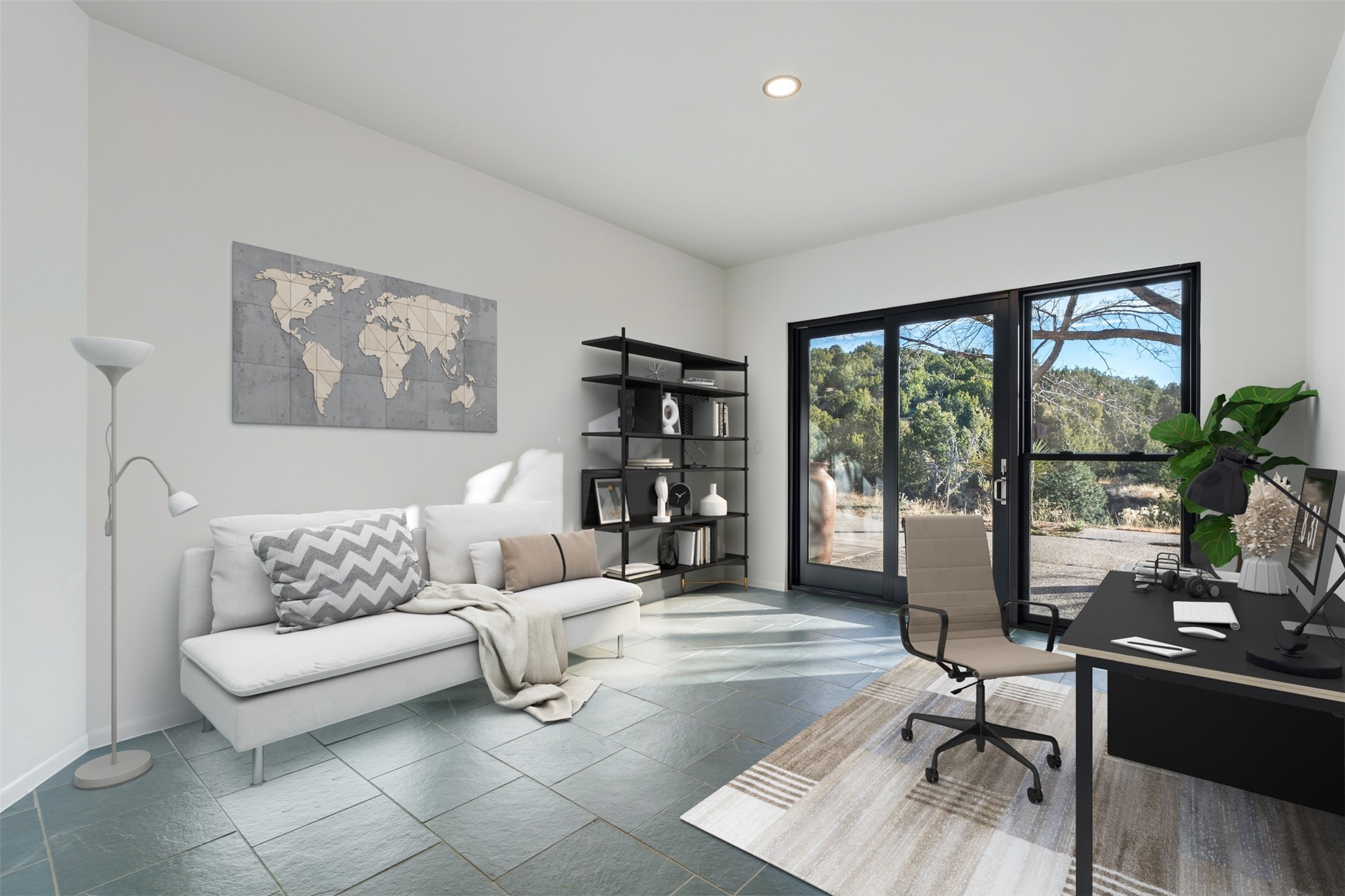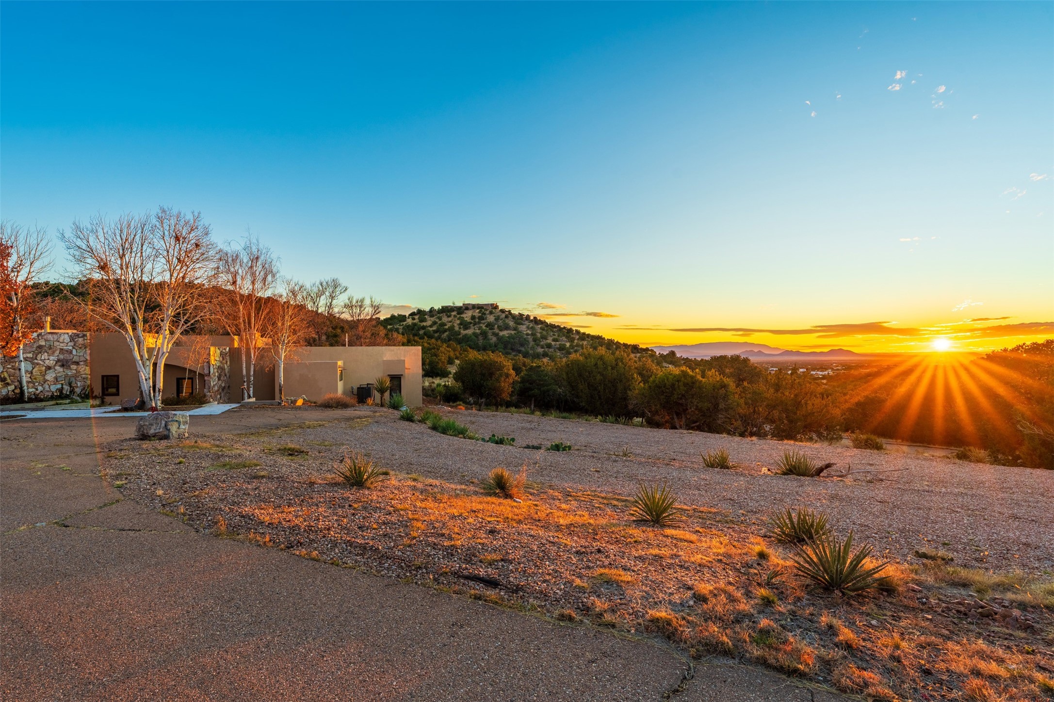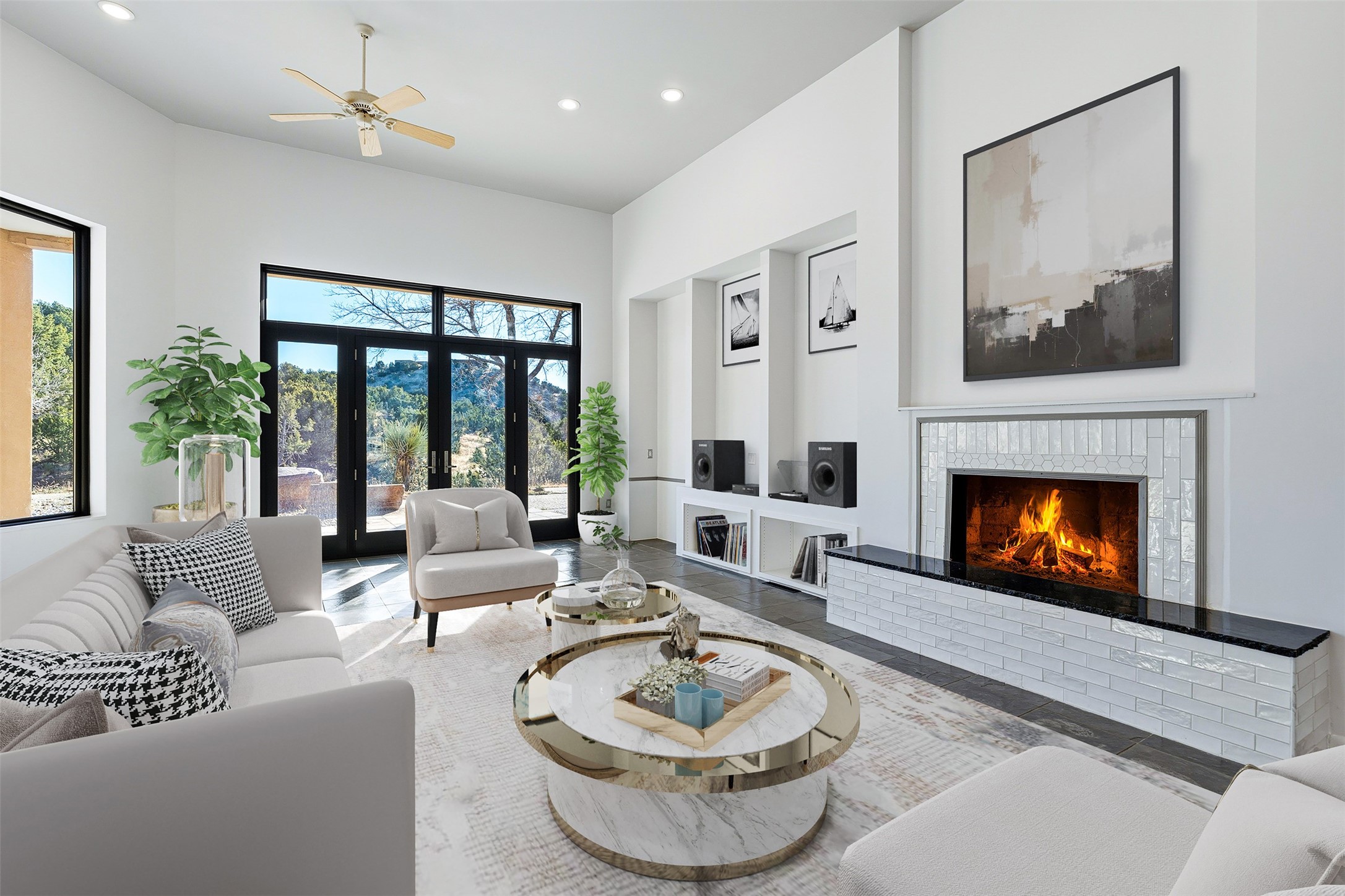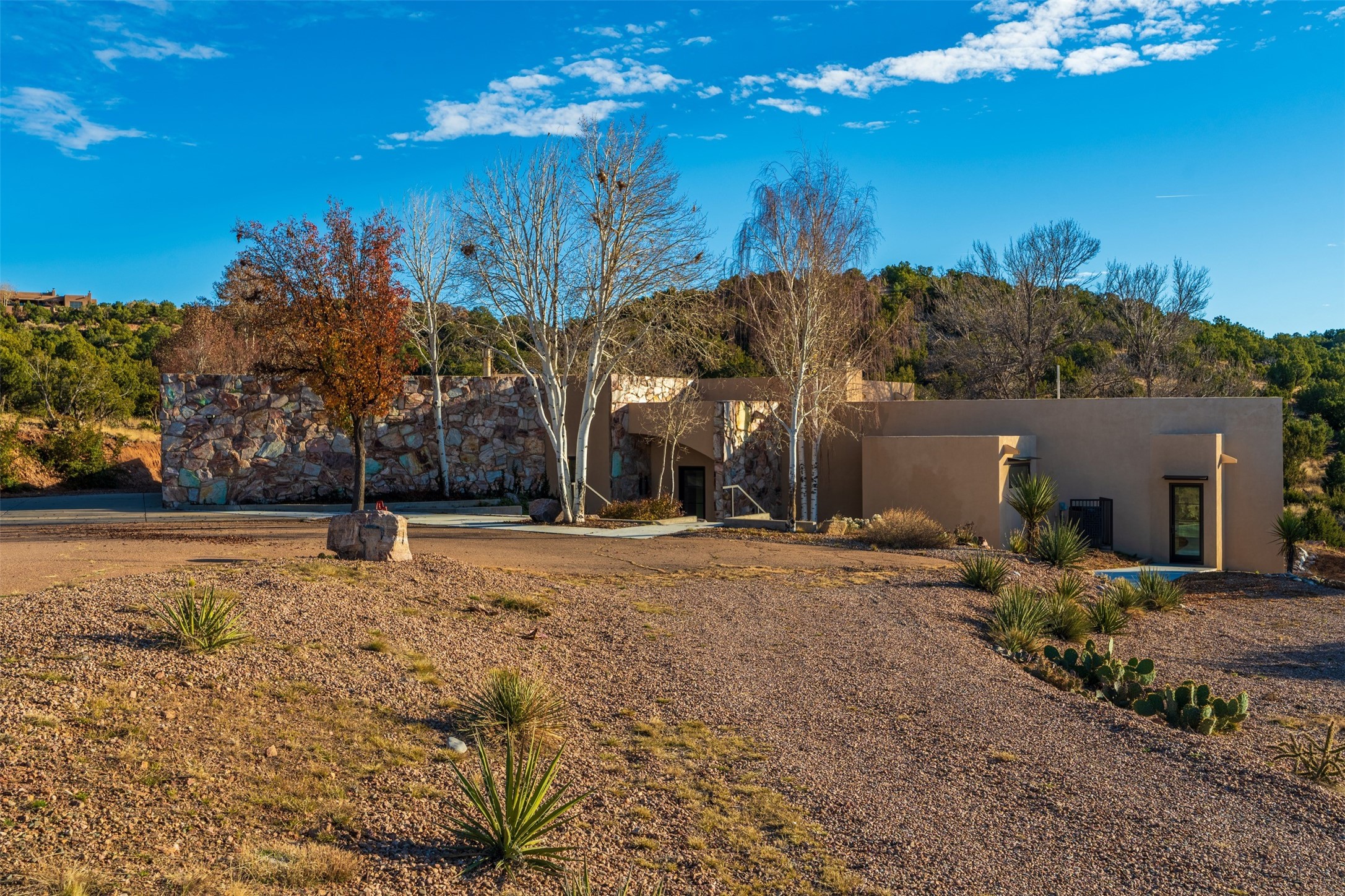 Designed by noted architect John Klee, this 4,300-square-foot 4 bedroom residence embodies the clean lines and luminous spaces of late-century modern design. The home rests gracefully within the contours of Arroyo Hondo Vistas, opening to generous portals and patios that frame sweeping mountain and high-desert views. A landscaped approach sets the tone—mature trees, natural stone, and a low-profile stucco and rock façade emerges as the home comes into sight. Tucked into the terrain, a series of descending steps leads to the front entry. Inside, an expansive great room unfolds beneath high ceilings, where slate floors, a fireplace, and a full wall of custom shelving anchor the space. Huge glass doors and windows dissolve the boundary between indoors and out, creating a luminous, seamless connection to the surrounding landscape. The grand kitchen features generous granite surfaces, a breakfast bar, and excellent flow for both cooking and entertaining. Nearby, the formal dining area offers the first view of one of the home’s most distinctive architectural elements: a conservatory crowned by a softly arched, translucent ceiling. The expansive owner’s suite includes a sitting area, a walk-in closet, large fireplace, and a well-appointed bath with free-standing tub, double vanity, and walk-in shower. Returning to the main living area, a gently sweeping hallway leads to a wing with two bedrooms, each with walk-in closets, a guest bathroom, and a flexible room that can be used as an office, studio, or exercise room. Nearly every room features large windows and/or patio doors opening to the expansive, view-rich outdoor spaces, creating a lifestyle centered on indoor-outdoor living and quiet retreat. Numerous skylights illuminate the interior throughout. Other features include central air conditioning, forced-air heating, and a gated entry. Some rooms have been digitally staged.