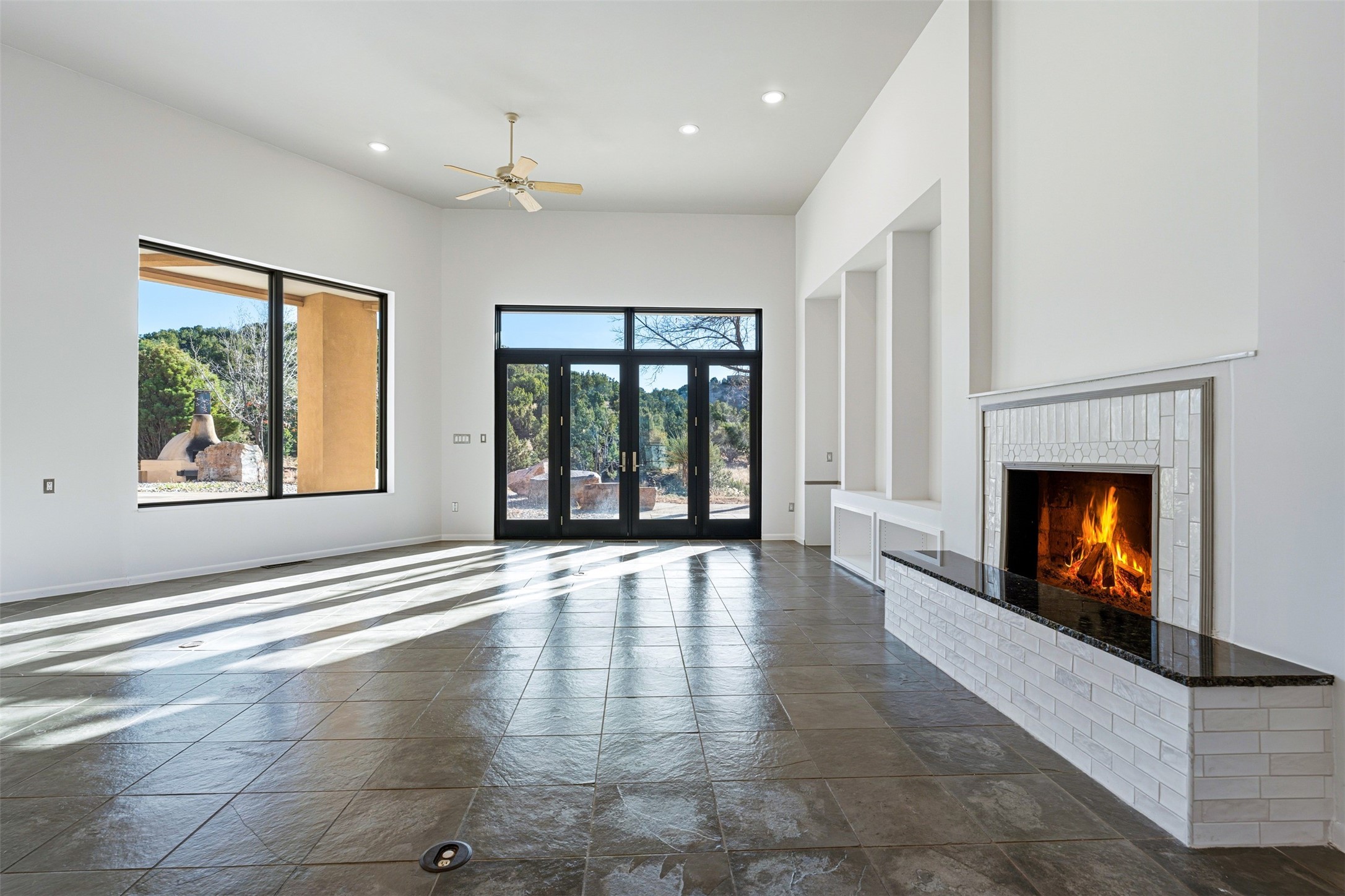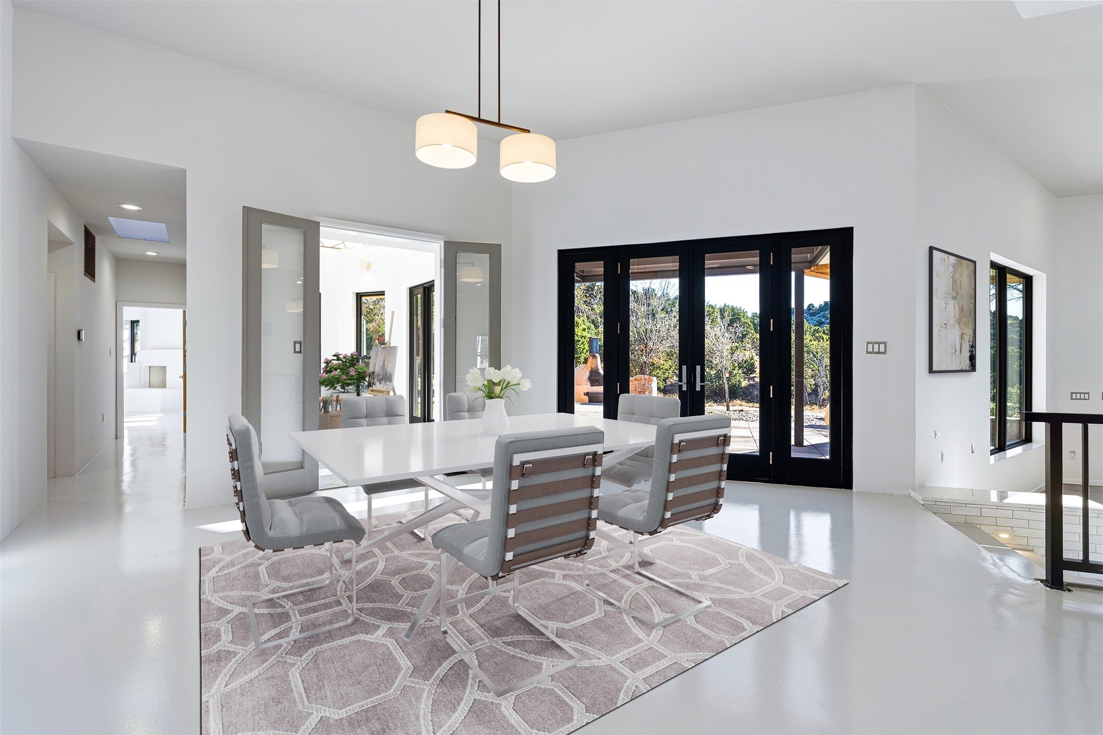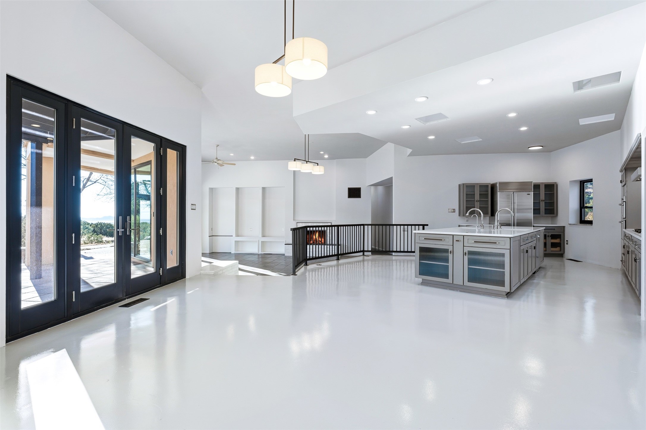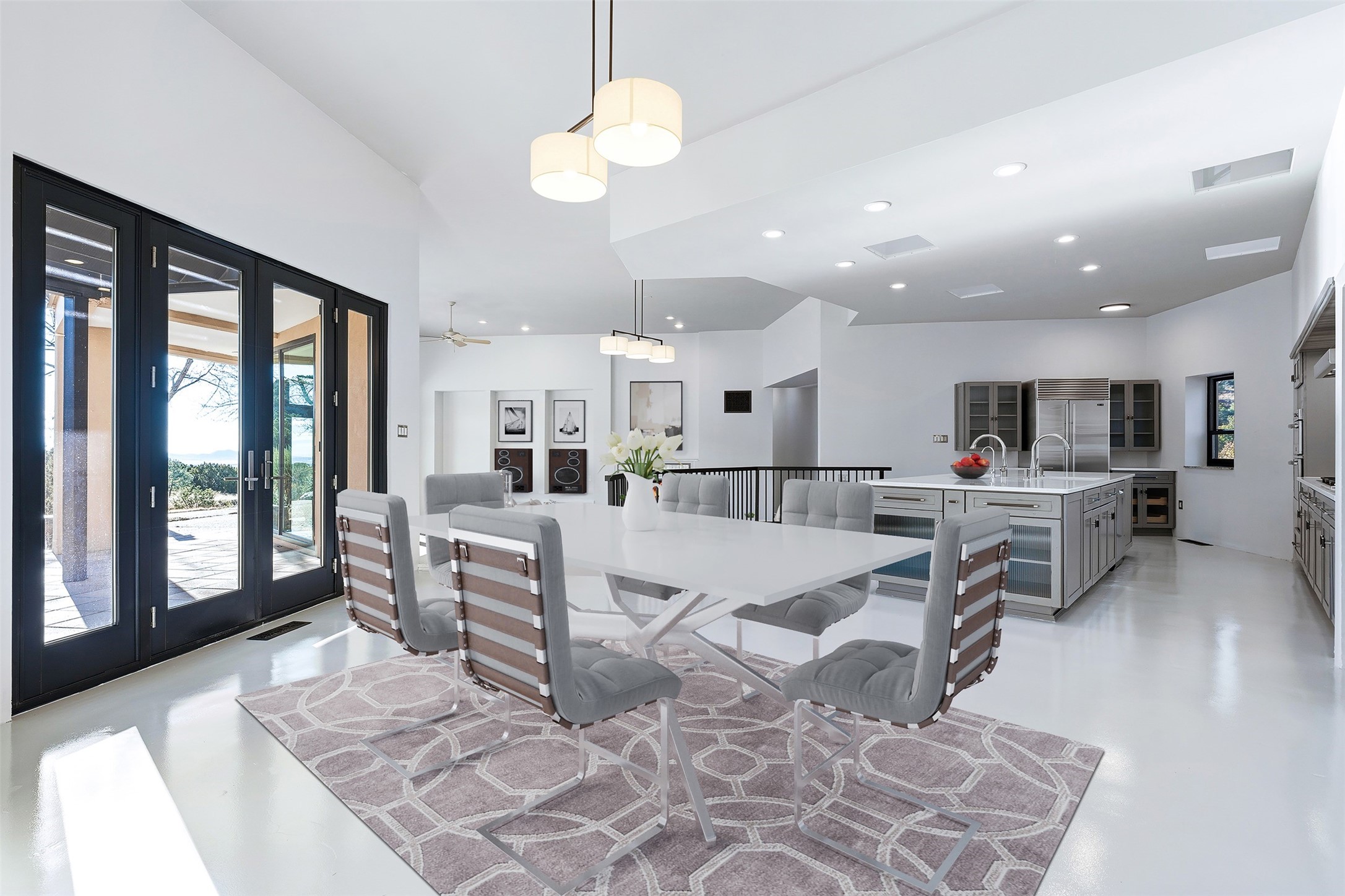 Designed by noted architect John Klee, this 4,300-square-foot 4 bedroom residence embodies the clean lines and luminous spaces of late-century modern design. The home rests gracefully within the contours of Arroyo Hondo Vistas, opening to generous portals and patios that frame sweeping mountain and high-desert views. A landscaped approach sets the tone—mature trees, natural stone, and a low-profile stucco and rock façade emerges as the home comes into sight. Tucked into the terrain, a series of descending steps leads to the front entry. Inside, an expansive great room unfolds beneath high ceilings, where slate floors, a fireplace, and a full wall of custom shelving anchor the space. Huge glass doors and windows dissolve the boundary between indoors and out, creating a luminous, seamless connection to the surrounding landscape. The grand kitchen features generous granite surfaces, a breakfast bar, and excellent flow for both cooking and entertaining. Nearby, the formal dining area offers the first view of one of the home’s most distinctive architectural elements: a conservatory crowned by a softly arched, translucent ceiling. The expansive owner’s suite includes a sitting area, a walk-in closet, large fireplace, and a well-appointed bath with free-standing tub, double vanity, and walk-in shower. Returning to the main living area, a gently sweeping hallway leads to a wing with two bedrooms, each with walk-in closets, a guest bathroom, and a flexible room that can be used as an office, studio, or exercise room. Nearly every room features large windows and/or patio doors opening to the expansive, view-rich outdoor spaces, creating a lifestyle centered on indoor-outdoor living and quiet retreat. Numerous skylights illuminate the interior throughout. Other features include central air conditioning, forced-air heating, and a gated entry. Some rooms have been digitally staged.