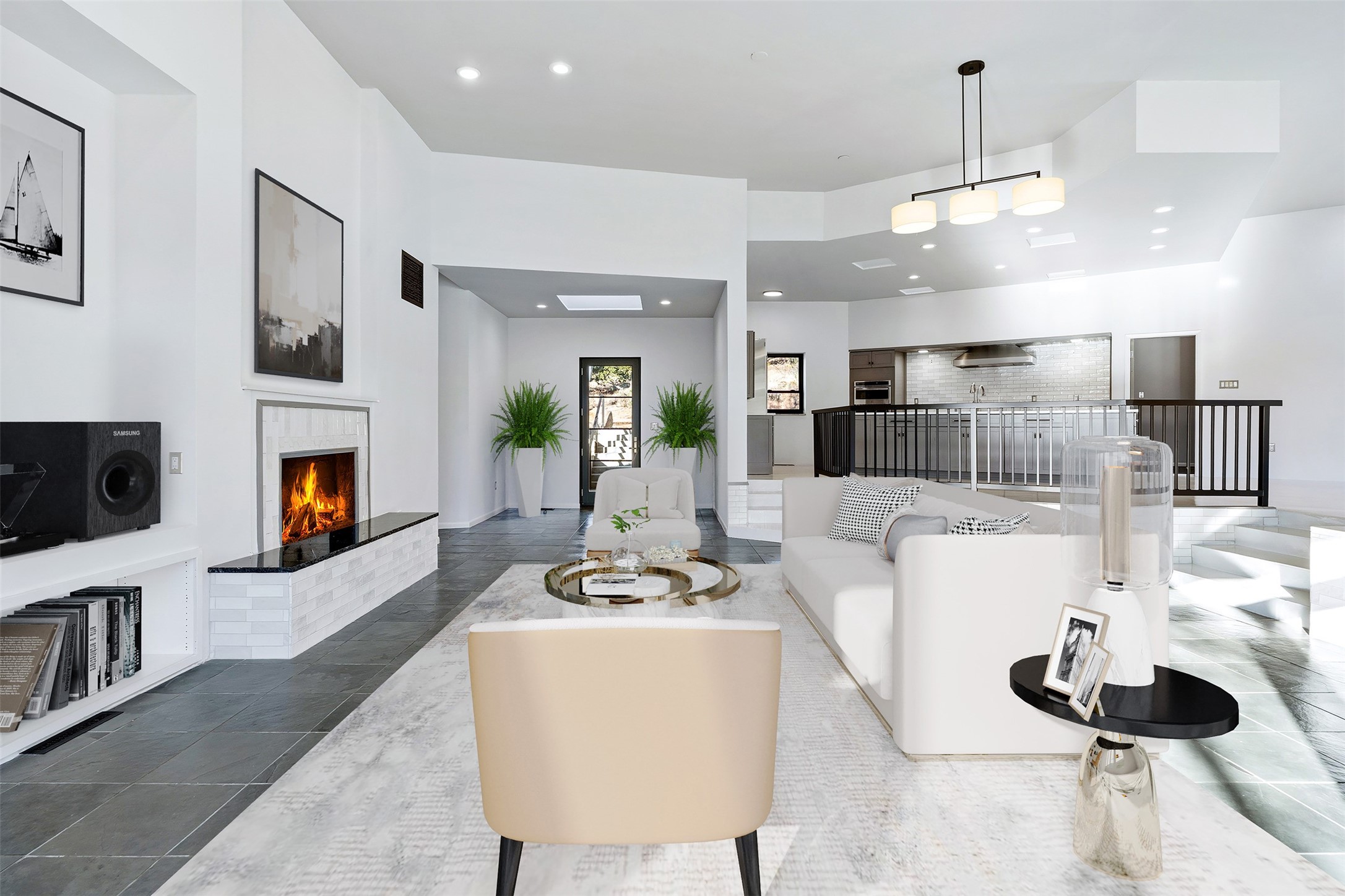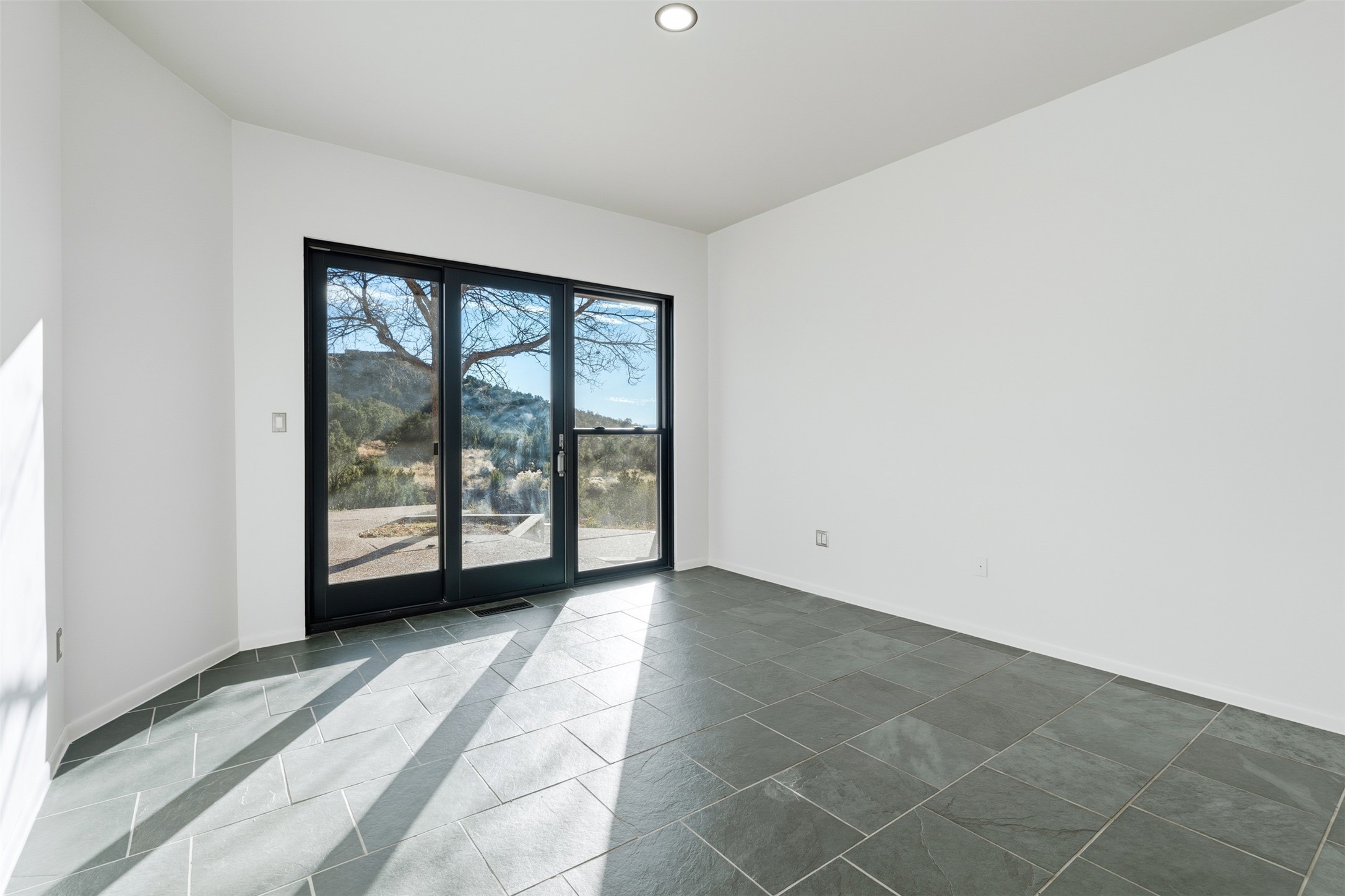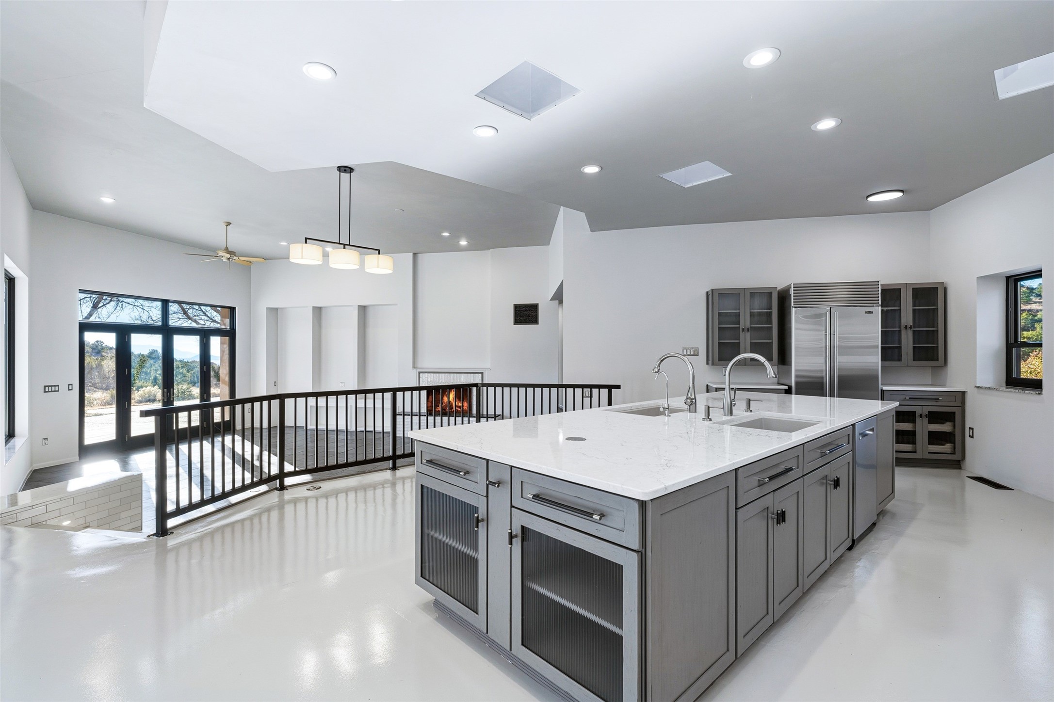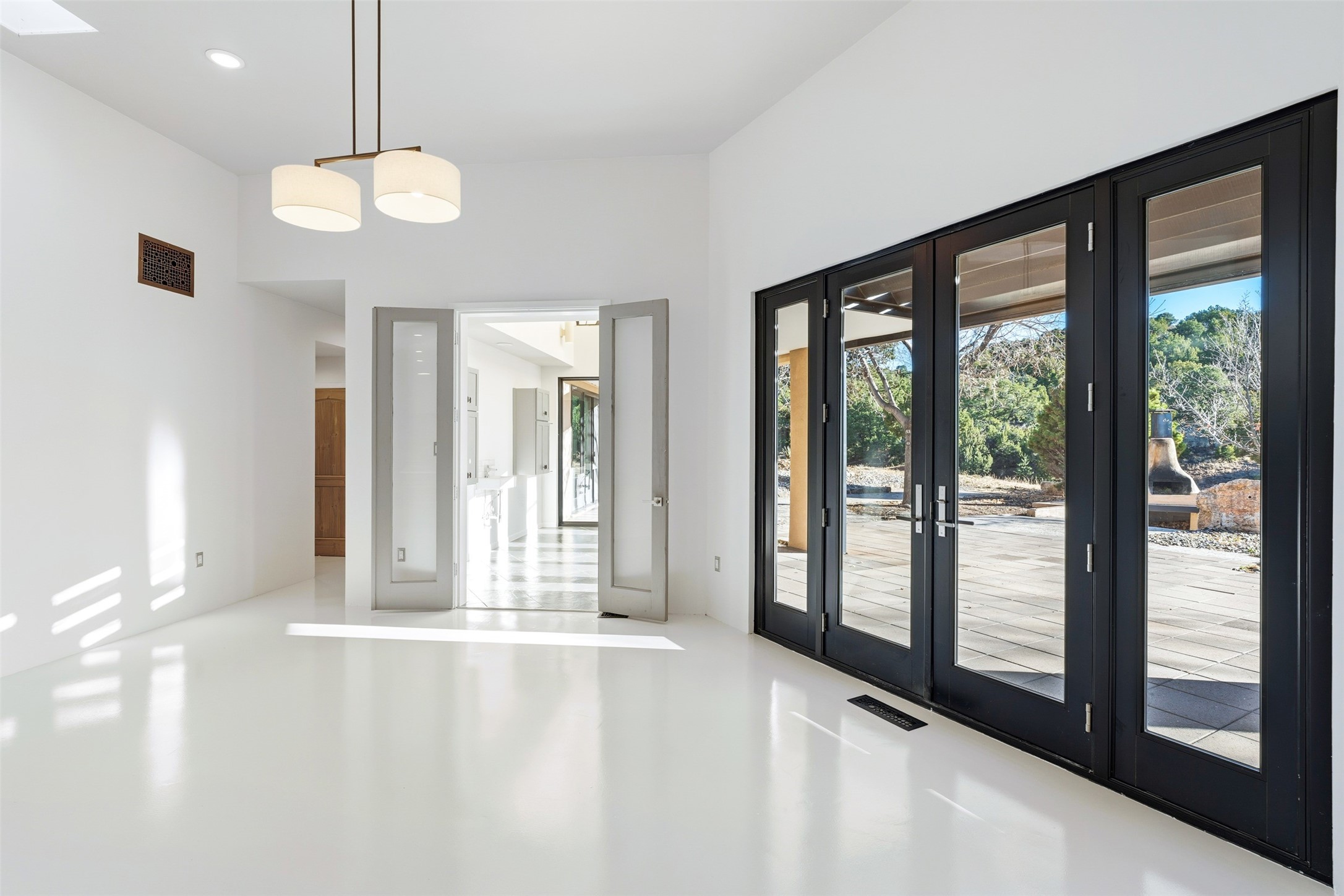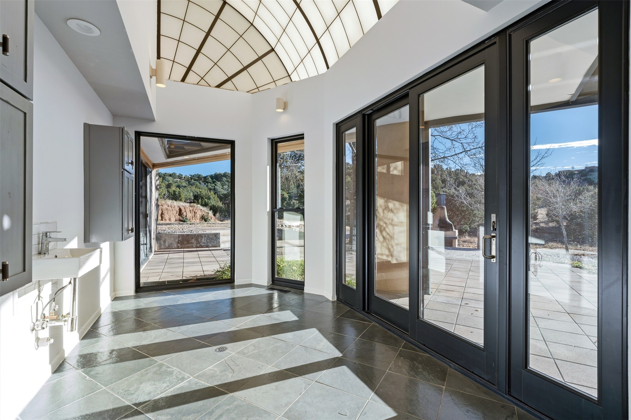 Designed by noted architect John Klee, this 4,300-square-foot 4 bedroom residence embodies the clean lines and luminous spaces of late-century modern design. The home rests gracefully within the contours of Arroyo Hondo Vistas, opening to generous portals and patios that frame sweeping mountain and high-desert views. A landscaped approach sets the tone—mature trees, natural stone, and a low-profile stucco and rock façade emerges as the home comes into sight. Tucked into the terrain, a series of descending steps leads to the front entry. Inside, an expansive great room unfolds beneath high ceilings, where slate floors, a fireplace, and a full wall of custom shelving anchor the space. Huge glass doors and windows dissolve the boundary between indoors and out, creating a luminous, seamless connection to the surrounding landscape. The grand kitchen features generous granite surfaces, a breakfast bar, and excellent flow for both cooking and entertaining. Nearby, the formal dining area offers the first view of one of the home’s most distinctive architectural elements: a conservatory crowned by a softly arched, translucent ceiling. The expansive owner’s suite includes a sitting area, a walk-in closet, large fireplace, and a well-appointed bath with free-standing tub, double vanity, and walk-in shower. Returning to the main living area, a gently sweeping hallway leads to a wing with two bedrooms, each with walk-in closets, a guest bathroom, and a flexible room that can be used as an office, studio, or exercise room. Nearly every room features large windows and/or patio doors opening to the expansive, view-rich outdoor spaces, creating a lifestyle centered on indoor-outdoor living and quiet retreat. Numerous skylights illuminate the interior throughout. Other features include central air conditioning, forced-air heating, and a gated entry. Some rooms have been digitally staged.