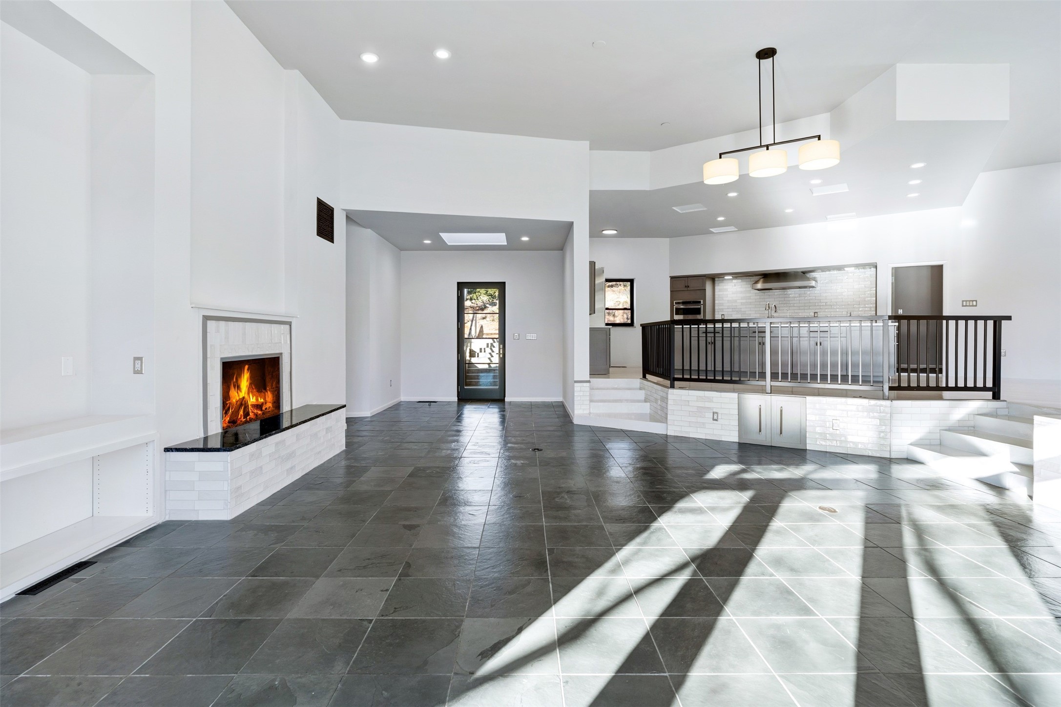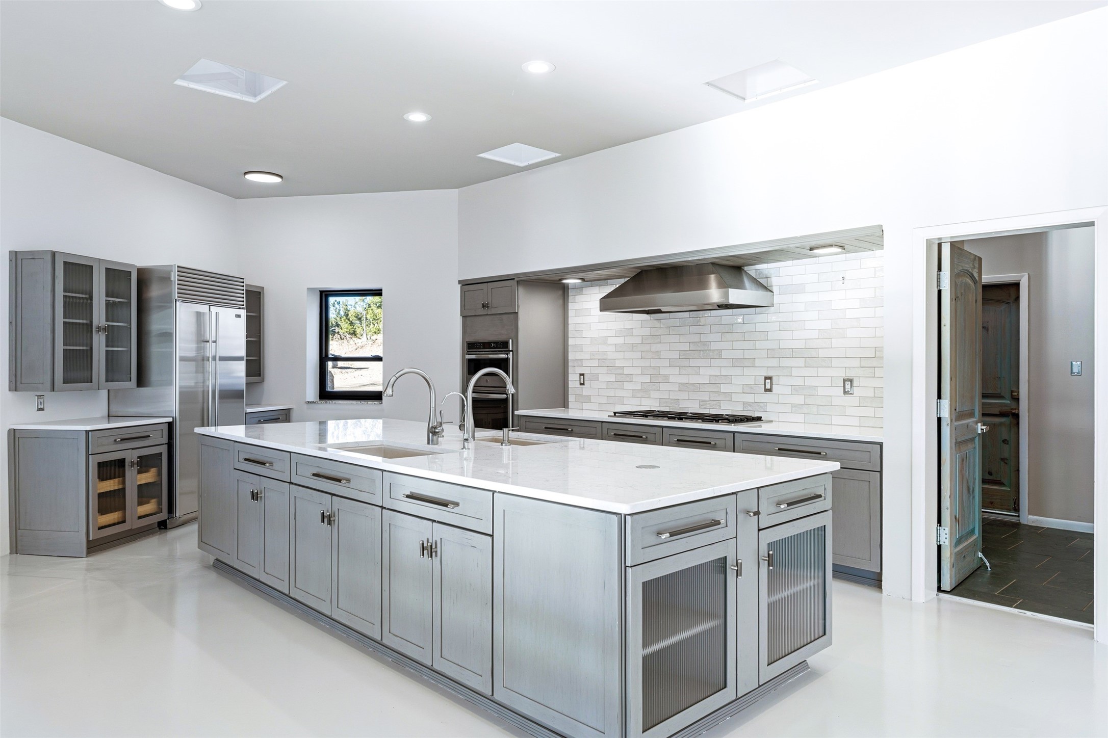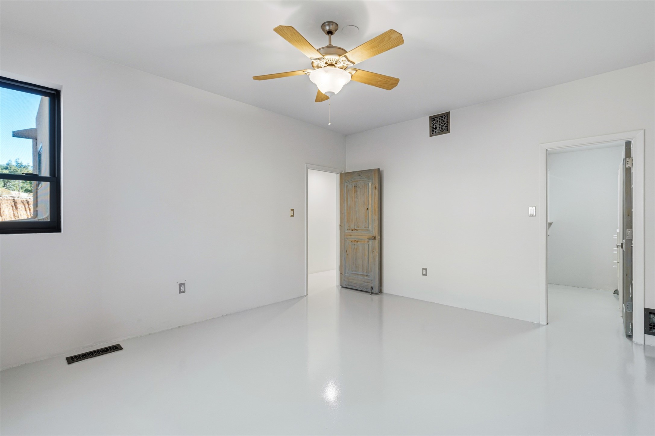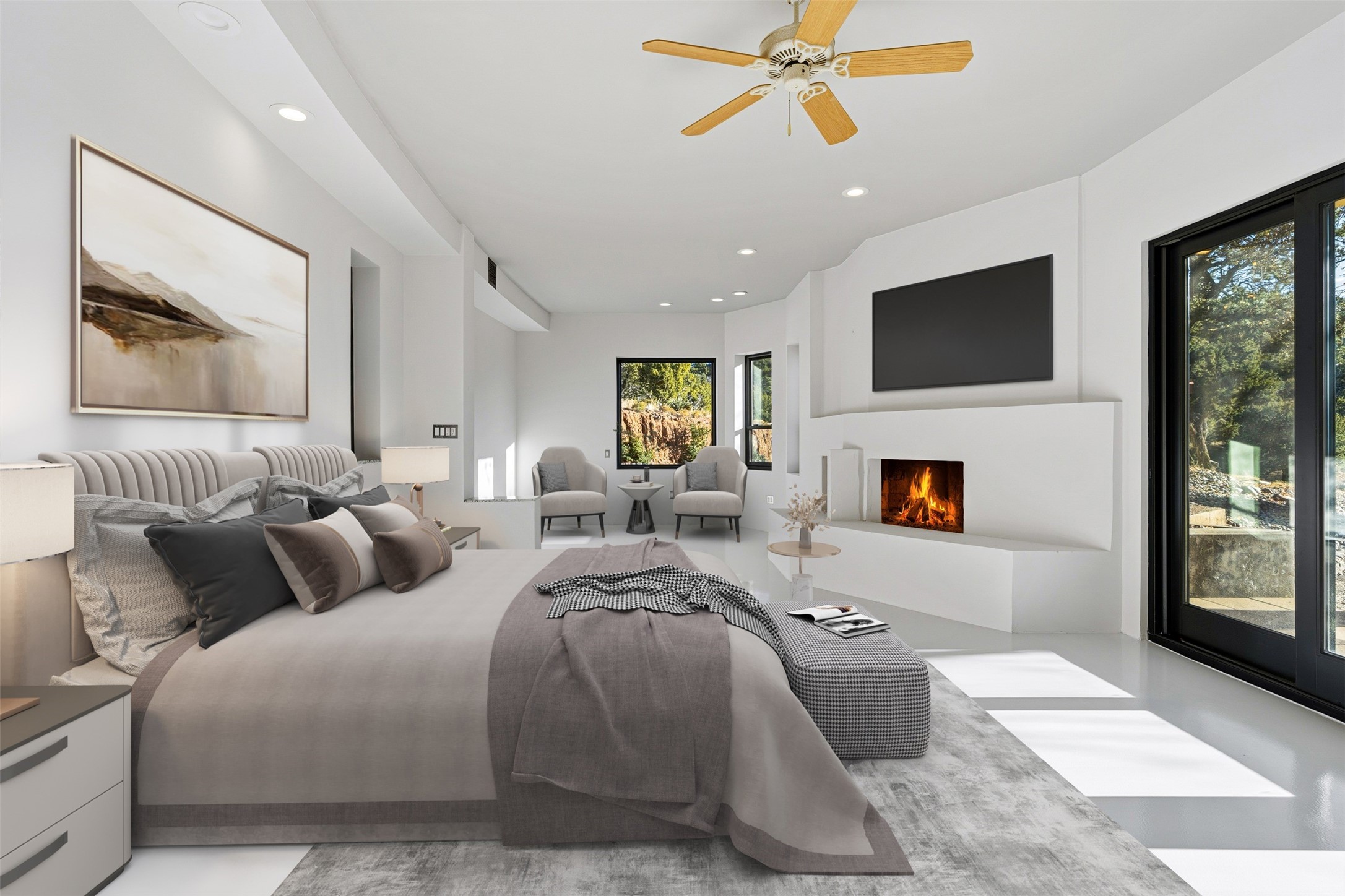 Designed by noted architect John Klee, this 4,300-square-foot 4 bedroom residence embodies the clean lines and luminous spaces of late-century modern design. The home rests gracefully within the contours of Arroyo Hondo Vistas, opening to generous portals and patios that frame sweeping mountain and high-desert views. A landscaped approach sets the tone—mature trees, natural stone, and a low-profile stucco and rock façade emerges as the home comes into sight. Tucked into the terrain, a series of descending steps leads to the front entry. Inside, an expansive great room unfolds beneath high ceilings, where slate floors, a fireplace, and a full wall of custom shelving anchor the space. Huge glass doors and windows dissolve the boundary between indoors and out, creating a luminous, seamless connection to the surrounding landscape. The grand kitchen features generous granite surfaces, a breakfast bar, and excellent flow for both cooking and entertaining. Nearby, the formal dining area offers the first view of one of the home’s most distinctive architectural elements: a conservatory crowned by a softly arched, translucent ceiling. The expansive owner’s suite includes a sitting area, a walk-in closet, large fireplace, and a well-appointed bath with free-standing tub, double vanity, and walk-in shower. Returning to the main living area, a gently sweeping hallway leads to a wing with two bedrooms, each with walk-in closets, a guest bathroom, and a flexible room that can be used as an office, studio, or exercise room. Nearly every room features large windows and/or patio doors opening to the expansive, view-rich outdoor spaces, creating a lifestyle centered on indoor-outdoor living and quiet retreat. Numerous skylights illuminate the interior throughout. Other features include central air conditioning, forced-air heating, and a gated entry. Some rooms have been digitally staged.
