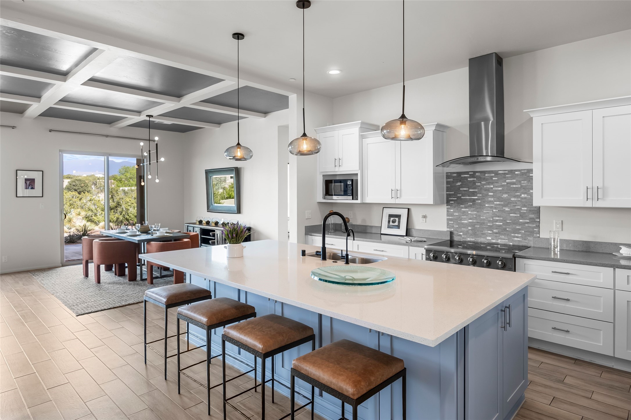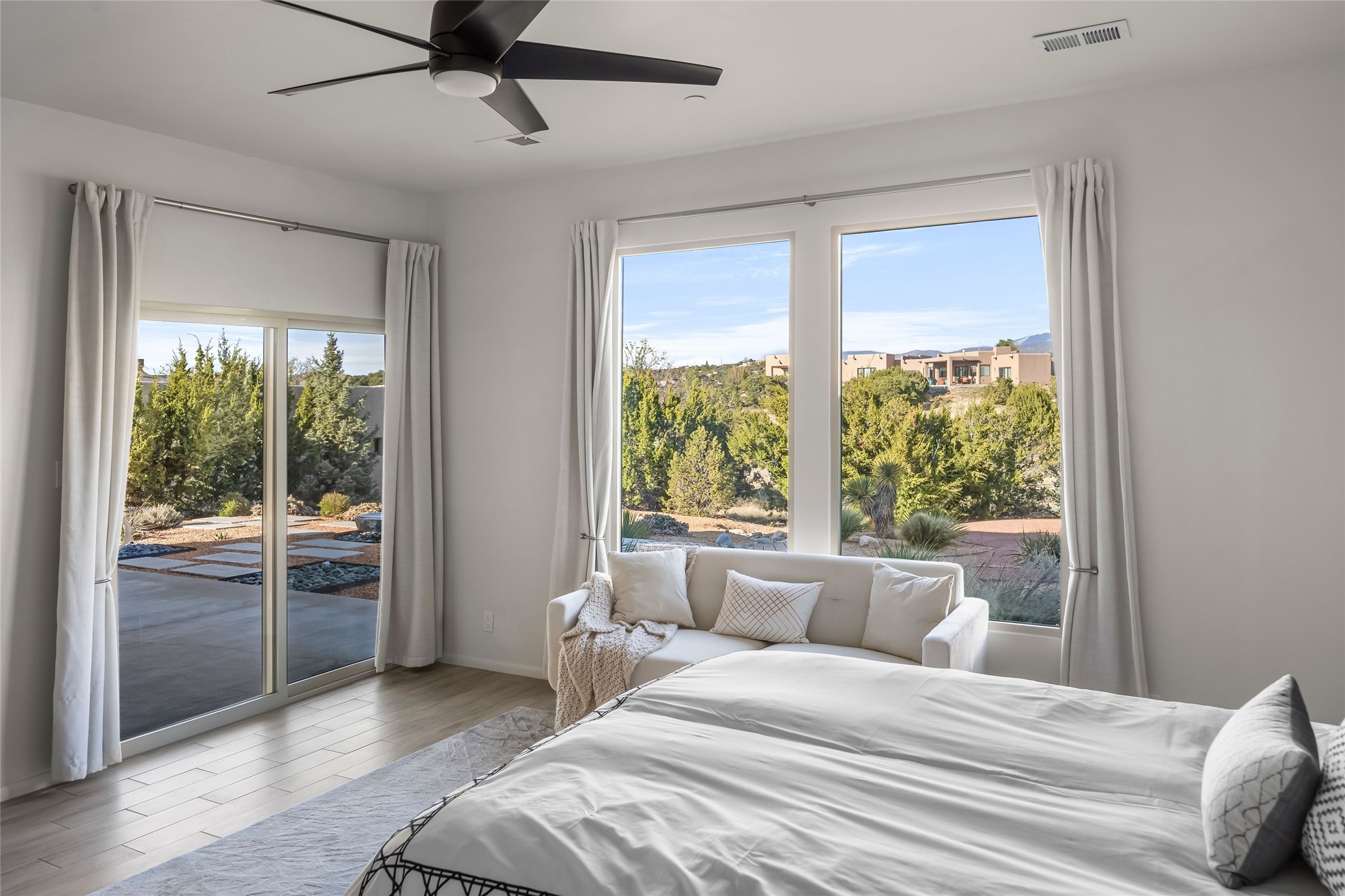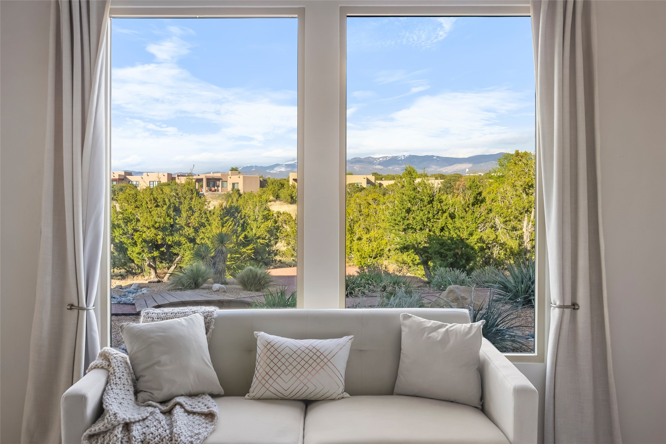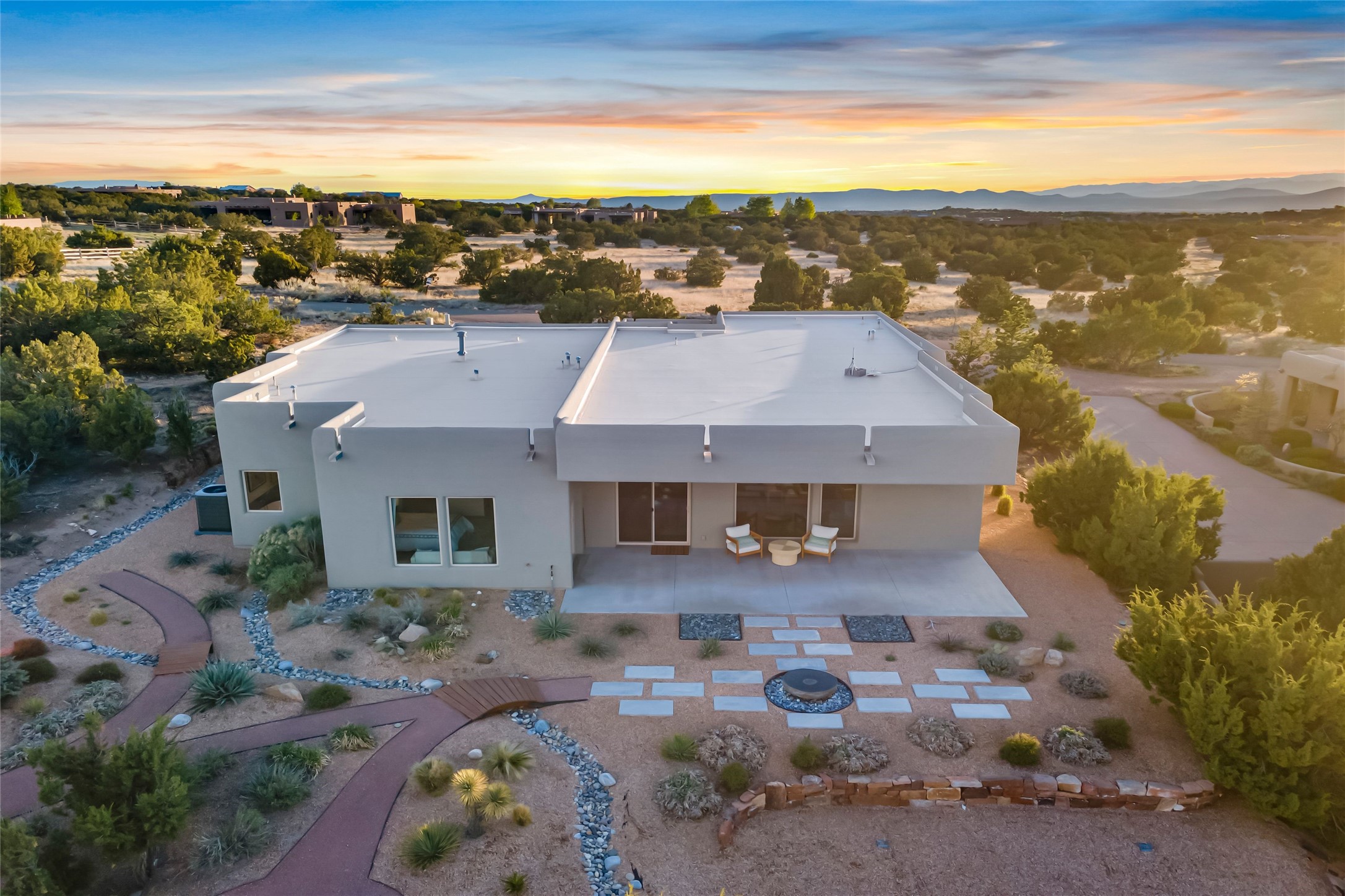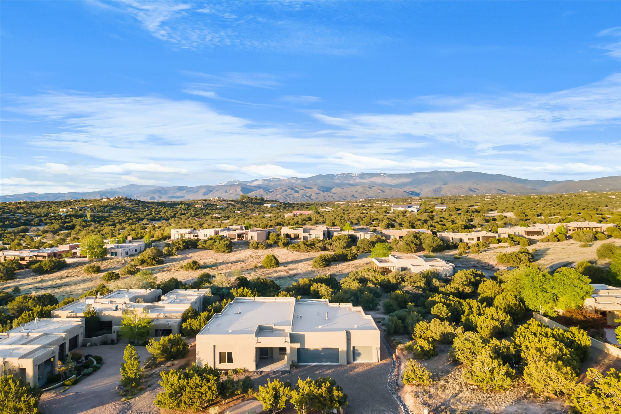 Welcome to 14 Plano Arbolito—where sleek contemporary design meets the serene beauty of Santa Fe’s natural landscape. Perched on a half acre in the desirable Tano West neighborhood, this recently built, single-level home offers the perfect balance of luxury, comfort, and breathtaking views. This three-bedroom, three-bathroom residence boasts an open-concept floorplan designed for effortless living and entertaining. The expansive great room features soaring ceilings, a modern electric ambiance fireplace, and floor-to-ceiling windows that frame spectacular views of the Sangre de Cristo Mountains. The adjacent chef’s kitchen is equipped with premium stainless-steel appliances, a generous island with counter seating, a walk-in pantry, and elegant finishes that blend form and function. Retreat to a tranquil owner’s suite complete with outdoor access, a spa-like bathroom with a soaking tub, dual vanities, a spacious shower, and two oversized walk-in closets—one currently used as an office or yoga space. A separate guest wing includes two private bedrooms, one with its own entrance and en suite bath, perfect for visitors or extended stays. Step outside to a deep-covered portal with gas fireplace hookups and a custom fountain, ideal for enjoying Santa Fe’s vivid sunsets and star-filled nights. The fully landscaped, xeriscape backyard opens to panoramic vistas and unmatched privacy. Additional highlights include an oversized three-car garage, a flexible bonus room off the entry, and many thoughtful upgrades—from whole-house air purification to premium lighting and smart home features. Only 20 minutes from the Plaza and nestled within a community known for its protected open space, 14 Plano Arbolito offers peace, luxury, and a front-row seat to Santa Fe’s majestic beauty.
