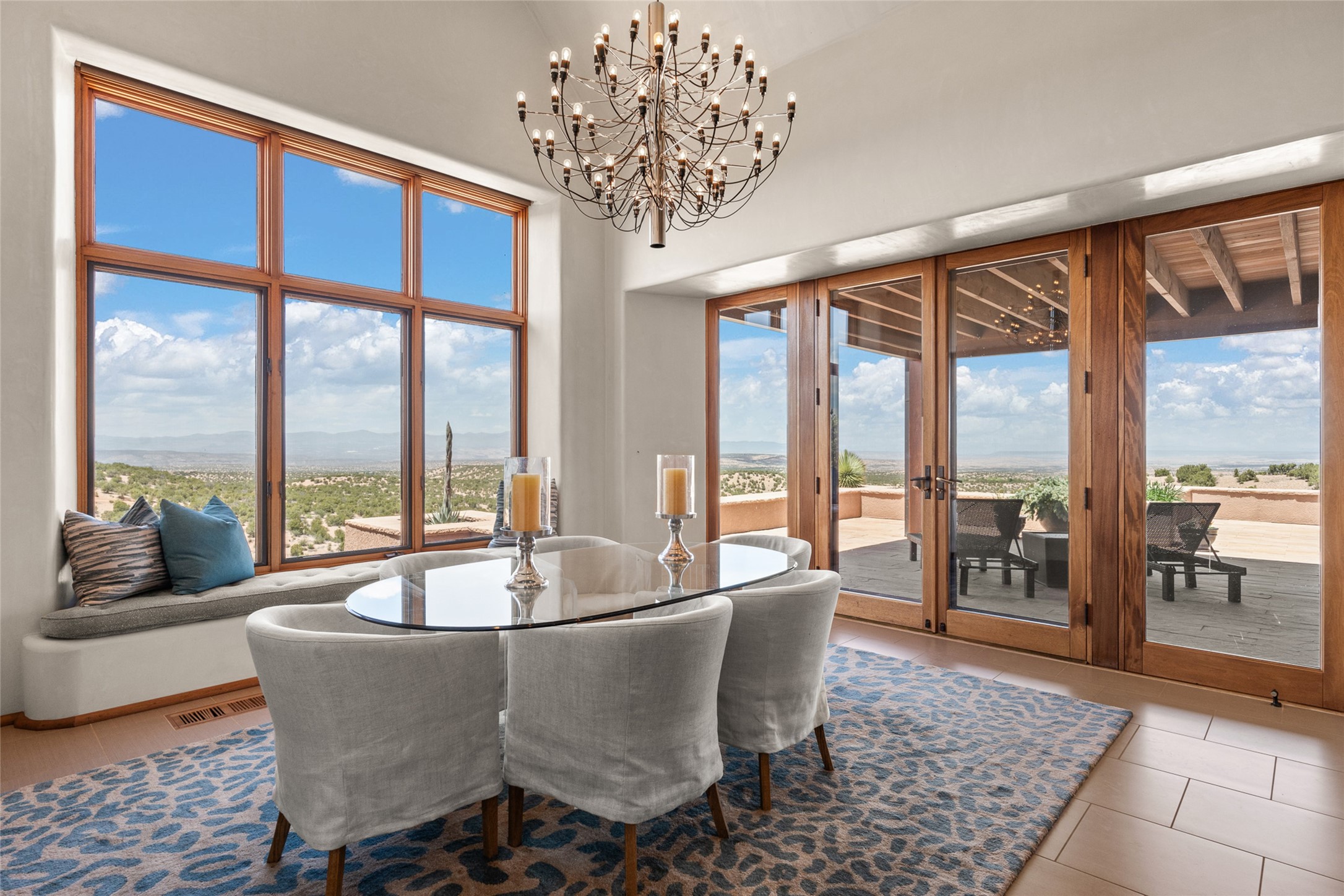 Exclusive Tano Road 5 bedroom 9 bath Contemporary Estate expertly sited on 40+ acres to capture magnificent mountain views. Newly staged to highlight innovative design. Elegant main residence is highlighted by cherry wood and stone floors, mahogany doors, and soaring peaked and trussed ceilings. Grand living areas open to wide portals and patios ideal for hosting reunions and large functions. Generous gourmet kitchen with large center island, two of every appliance, recessed lighting and an informal dining area with windows and glass doors which provide panels of natural art. For special evenings, there is a formal dining room as well. Outstanding primary bedroom suite with two ensuite baths and dressing spaces. Multiple guest rooms, a guest apartment, a wine cellar with 1,000+ bottle capacity, library, office, state-of-the-art media room and indoor pool add to the many features and conveniences. In addition, there is a custom-built art studio. Private gate, stone motor court and three-car heated garage. Very privately situated yet only minutes to downtown Santa Fe.