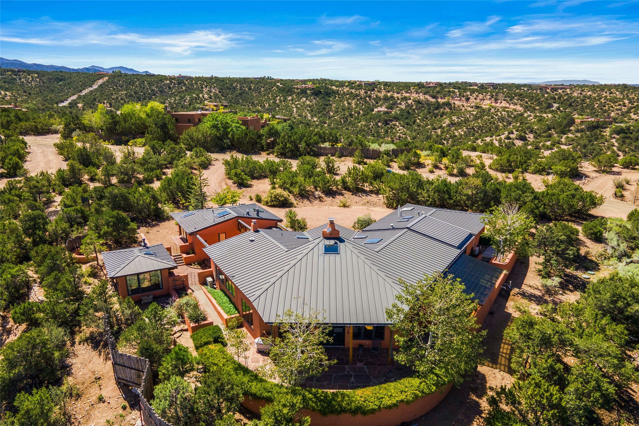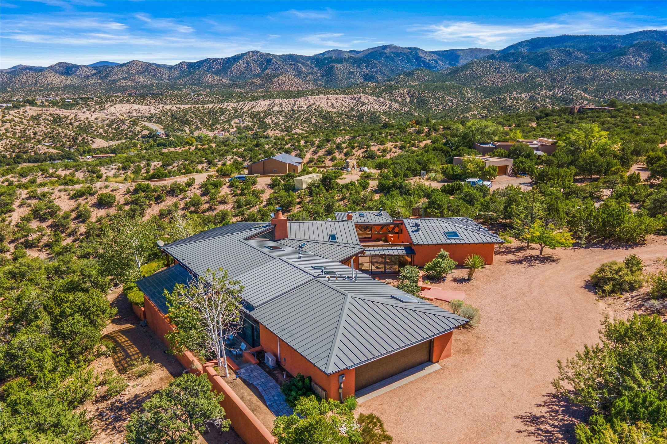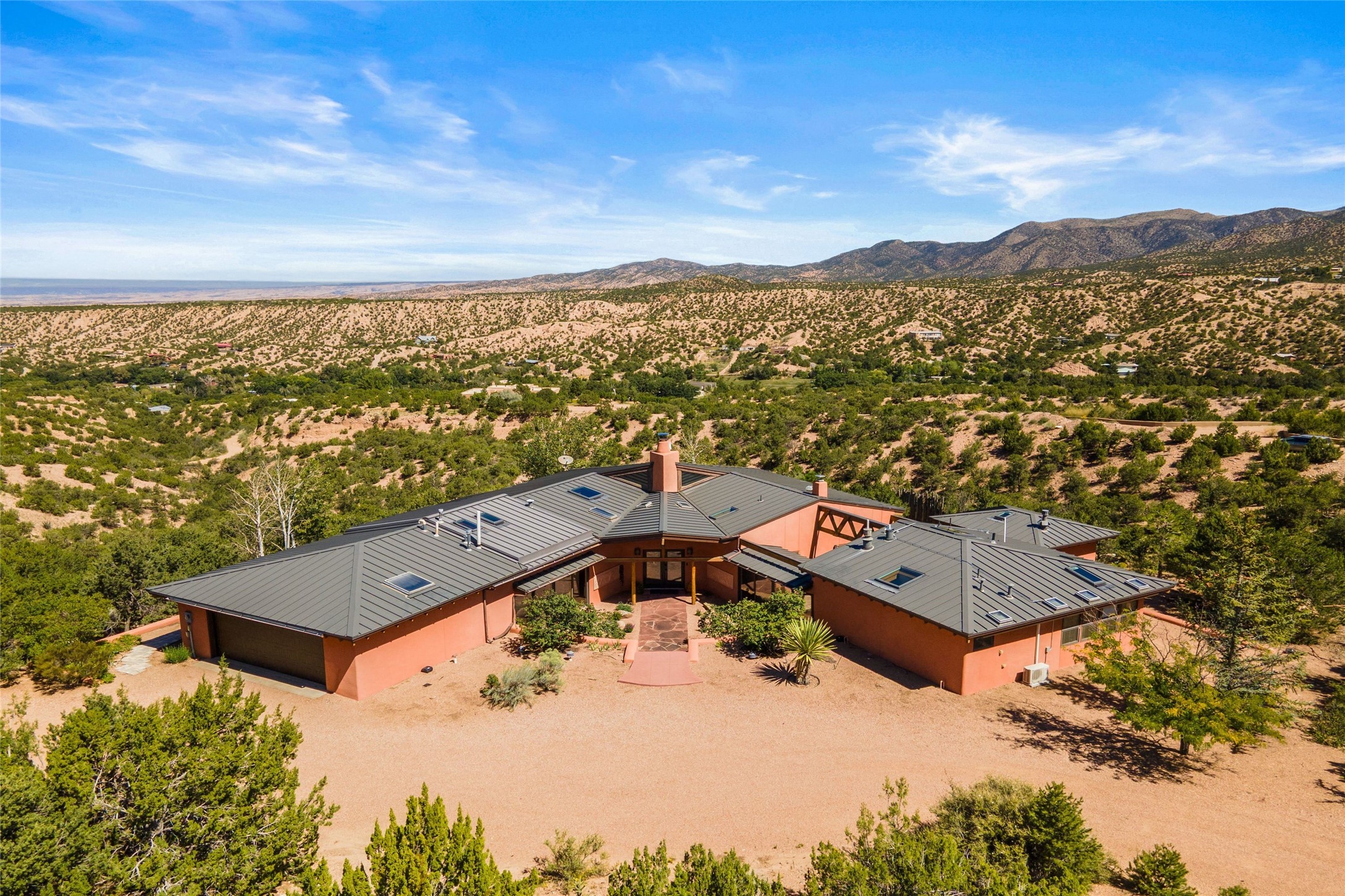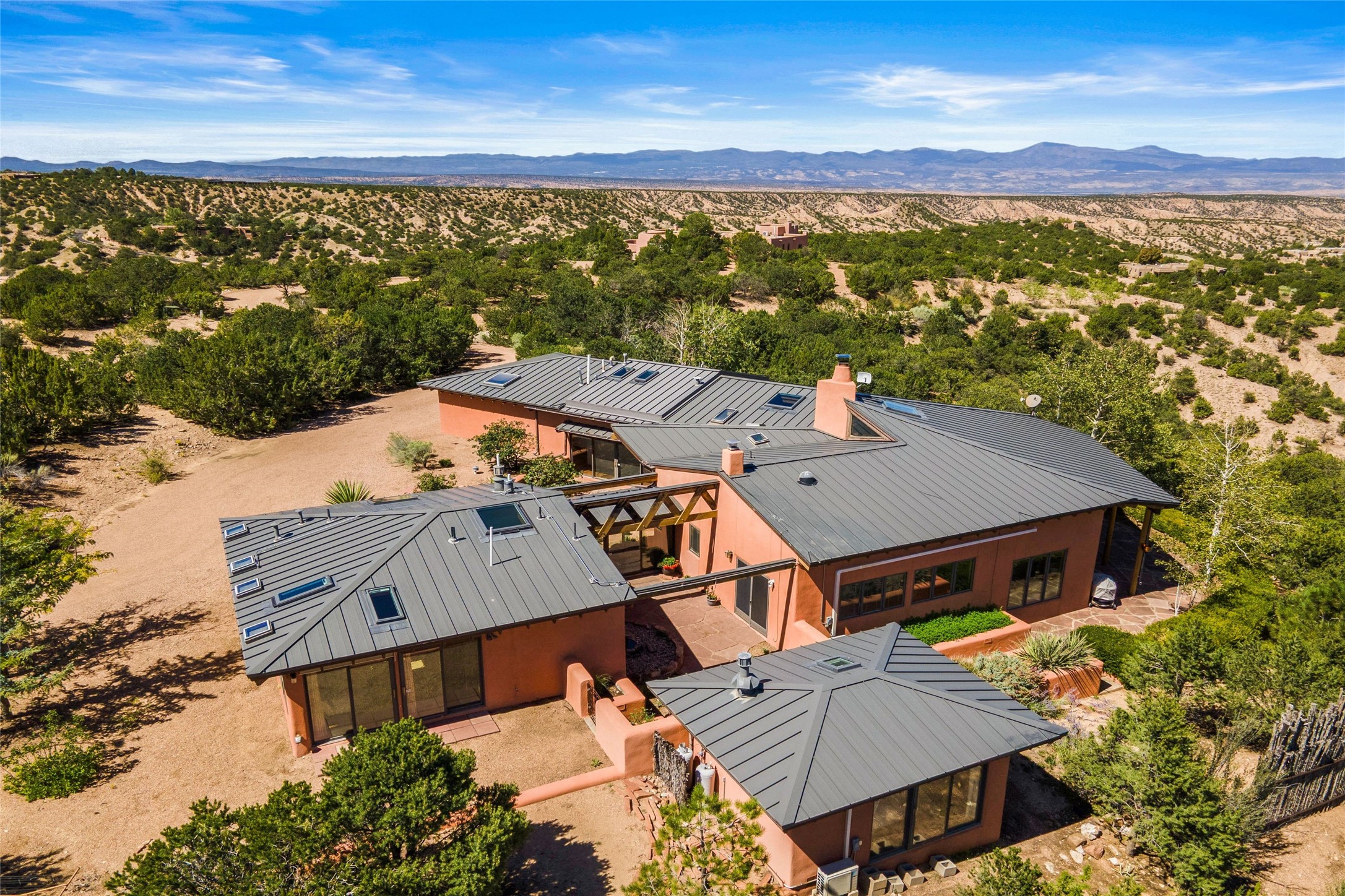 Stunning 3-bedroom, 3.5-bath home in Vista Redonda professionally sited on 5 ridge-top acres of piñon trees and breathtaking views of the Sangre de Cristo and Jemez Mountains. Constructed by renowned builder Dennis Sayer, this residence showcases exceptional workmanship and reflective design. The pitched roof and soaring beamed ceilings create an airy, inviting atmosphere, while the hard plaster walls and polished Saltillo tiles add timeless elegance. Upon entering, you'll find a spacious great room that flows into a dining area and a well-appointed eat-in kitchen. The office, complete with built-in desk and bookcases, provides a quiet retreat, while the kiva fireplace adds warmth and character to the space. The home features two en-suite bedrooms in each wing, ensuring privacy and comfort for guests.. In addition, there is a detached 196 sq. ft. studio/casita. Multiple outdoor areas invite you to enjoy al fresco dining and entertaining, including a delightful sunrise breakfast patio where you can soak in the morning sun with a cup of coffee. Natural light floods the home through plentiful skylights, windows, and glass doors, begetting a bright and welcoming environment. Additional highlights include a heated 2-car garage and newer boiler and water heaters. Just south of Vista Redonda is the Village of Tesuque, its neighborhood gathering spot Tesuque Village Market and the contemporary restaurant and bar, El Nido. Easy access to The Santa Fe Opera and downtown Santa Fe.