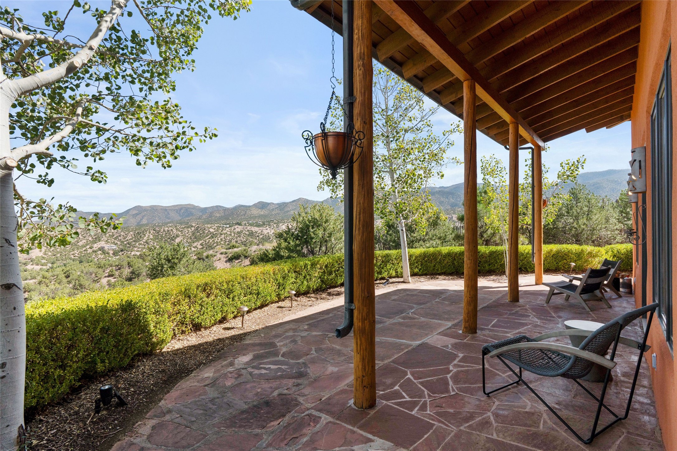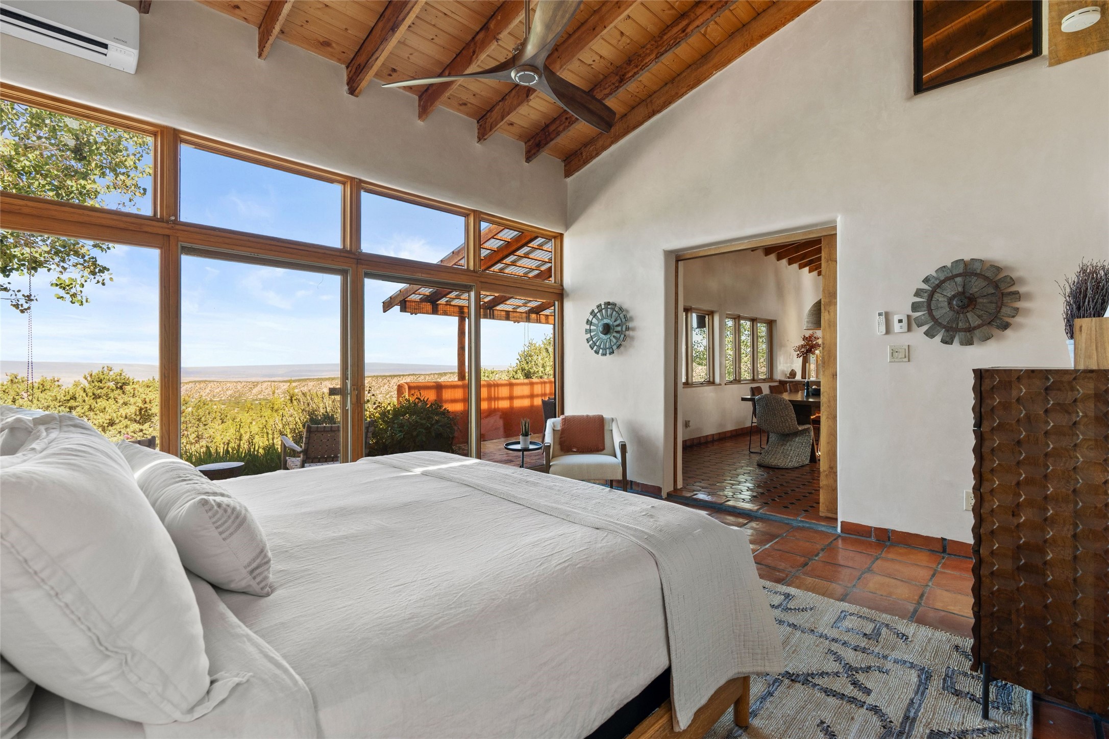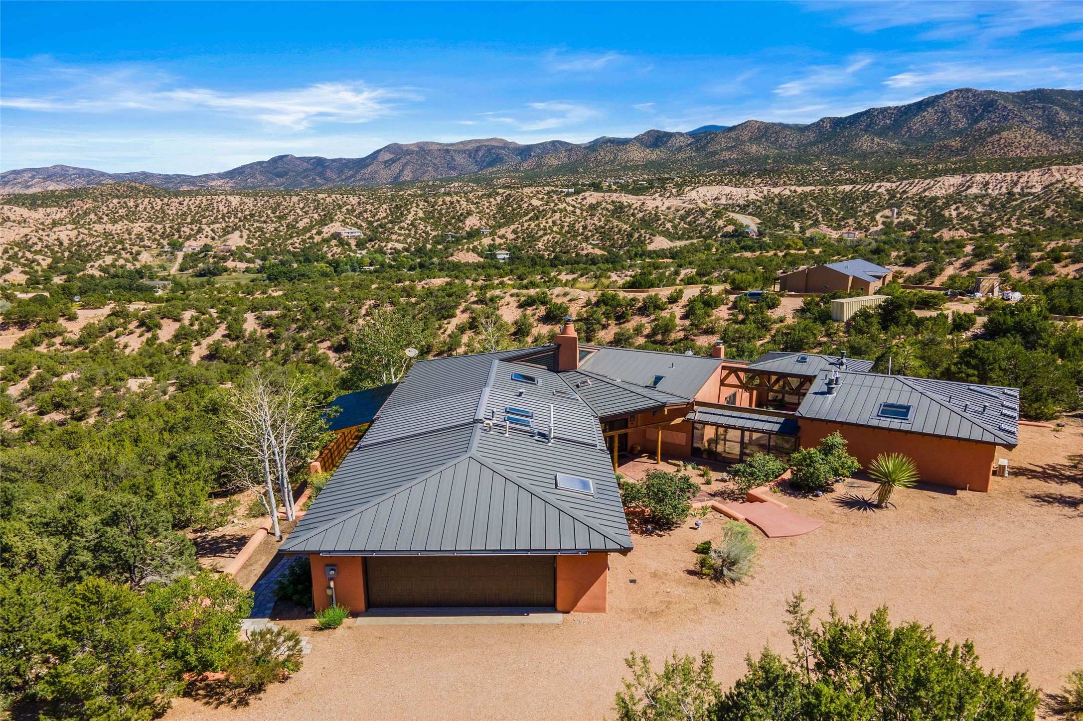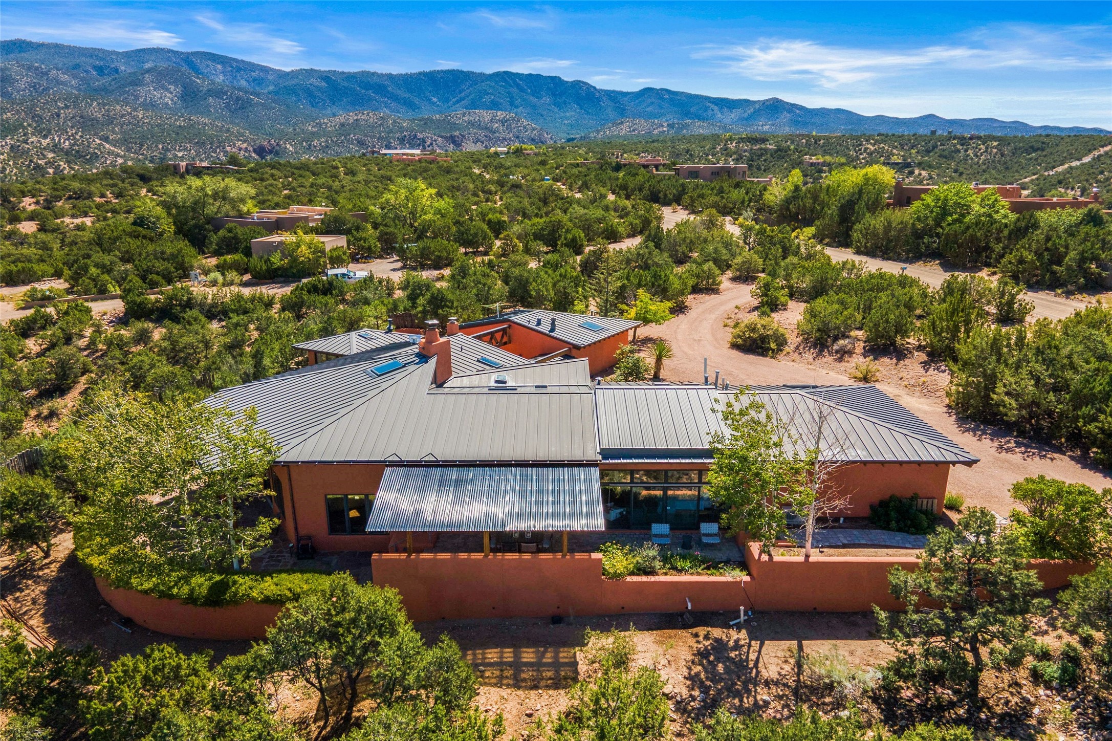 Stunning 3-bedroom, 3.5-bath home in Vista Redonda professionally sited on 5 ridge-top acres of piñon trees and breathtaking views of the Sangre de Cristo and Jemez Mountains. Constructed by renowned builder Dennis Sayer, this residence showcases exceptional workmanship and reflective design. The pitched roof and soaring beamed ceilings create an airy, inviting atmosphere, while the hard plaster walls and polished Saltillo tiles add timeless elegance. Upon entering, you'll find a spacious great room that flows into a dining area and a well-appointed eat-in kitchen. The office, complete with built-in desk and bookcases, provides a quiet retreat, while the kiva fireplace adds warmth and character to the space. The home features two en-suite bedrooms in each wing, ensuring privacy and comfort for guests.. In addition, there is a detached 196 sq. ft. studio/casita. Multiple outdoor areas invite you to enjoy al fresco dining and entertaining, including a delightful sunrise breakfast patio where you can soak in the morning sun with a cup of coffee. Natural light floods the home through plentiful skylights, windows, and glass doors, begetting a bright and welcoming environment. Additional highlights include a heated 2-car garage and newer boiler and water heaters. Just south of Vista Redonda is the Village of Tesuque, its neighborhood gathering spot Tesuque Village Market and the contemporary restaurant and bar, El Nido. Easy access to The Santa Fe Opera and downtown Santa Fe.