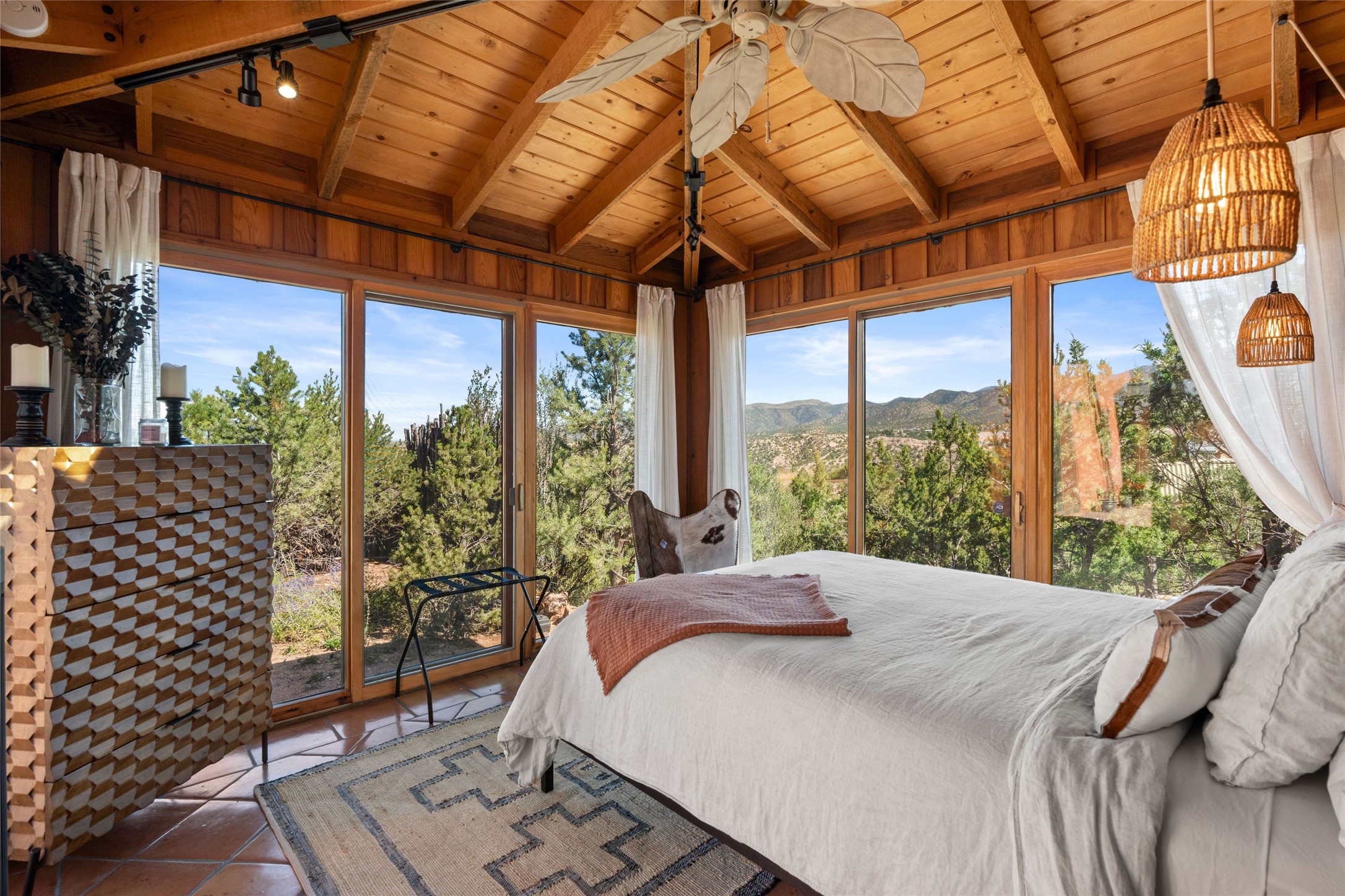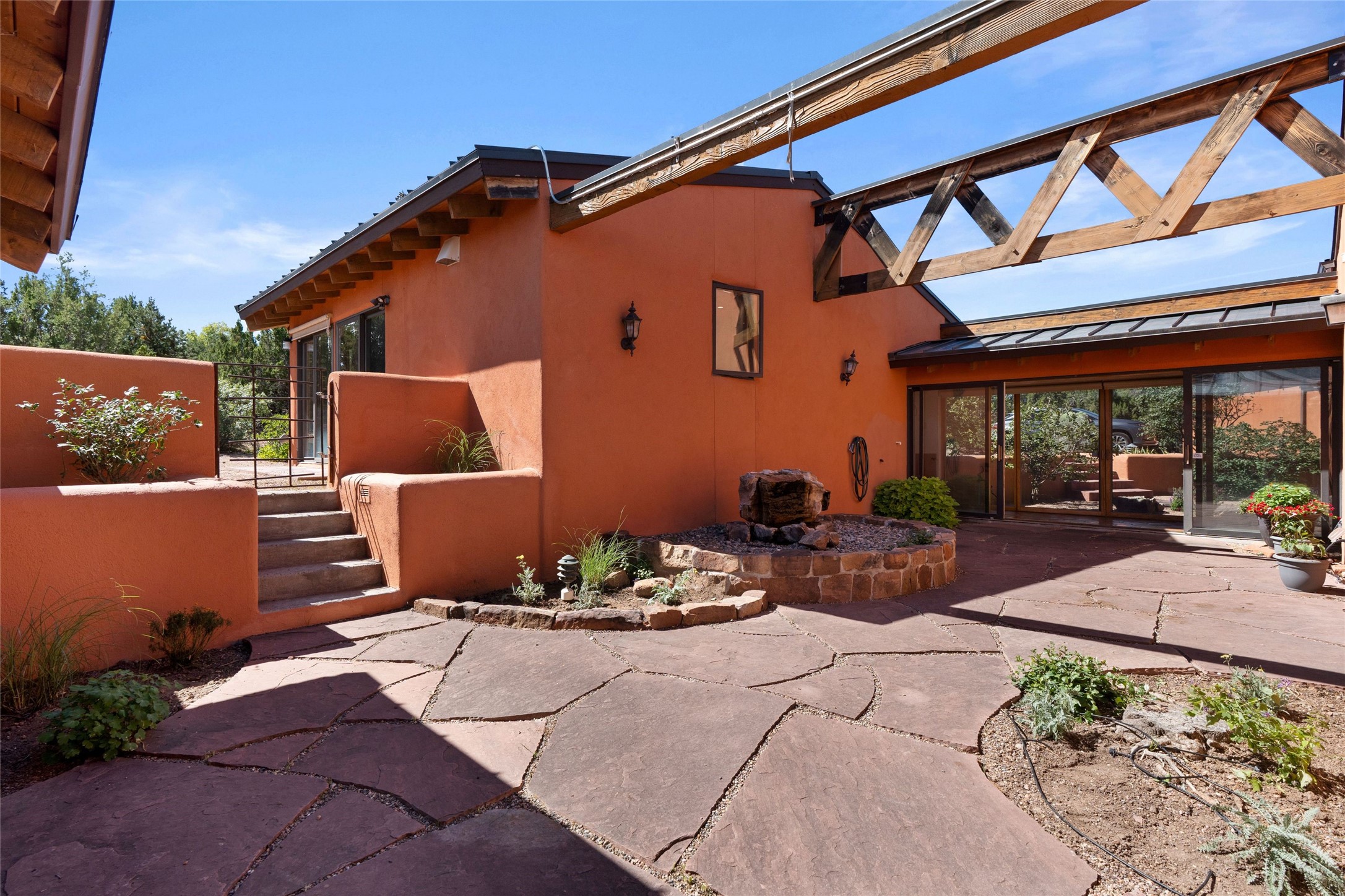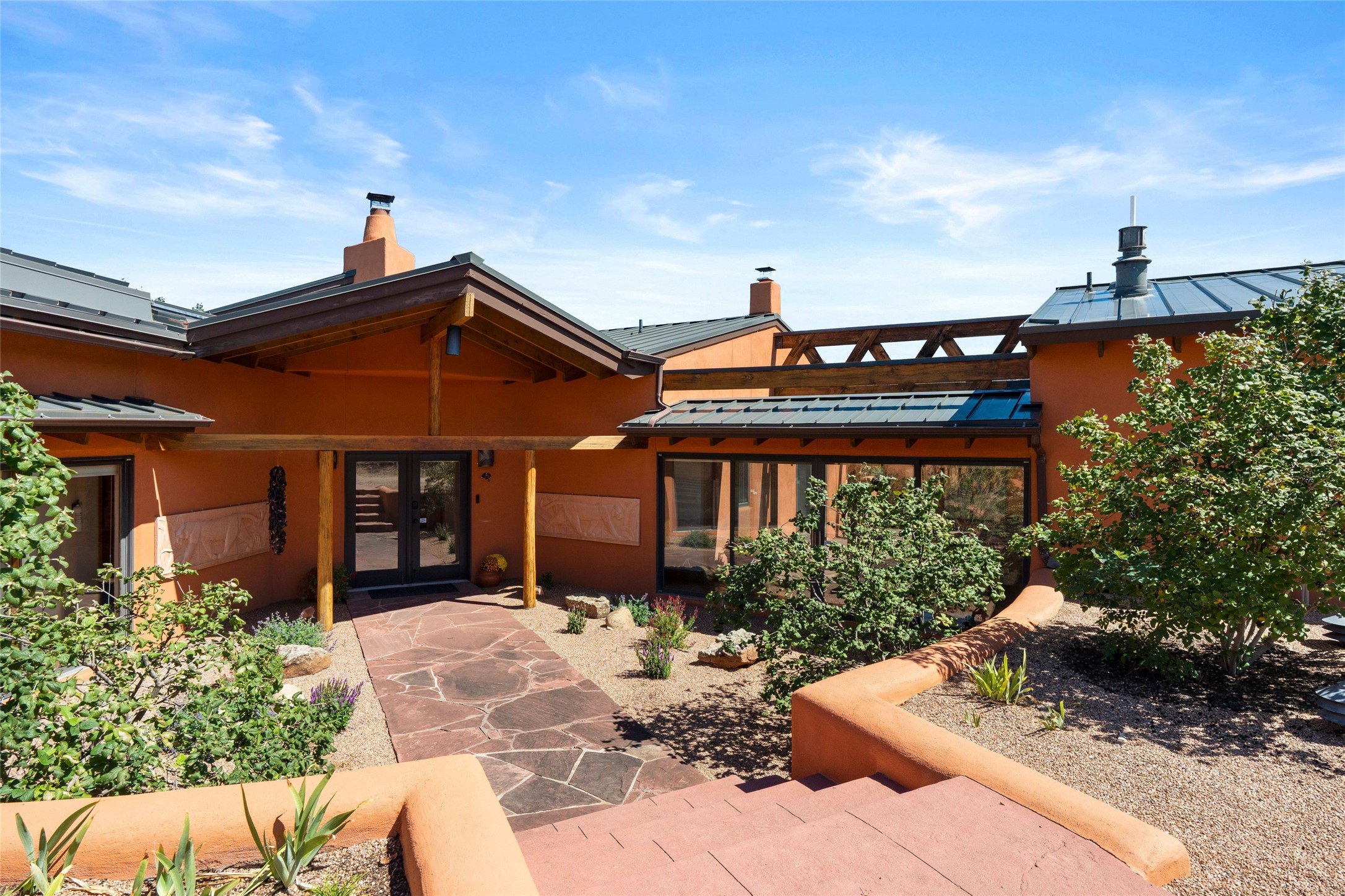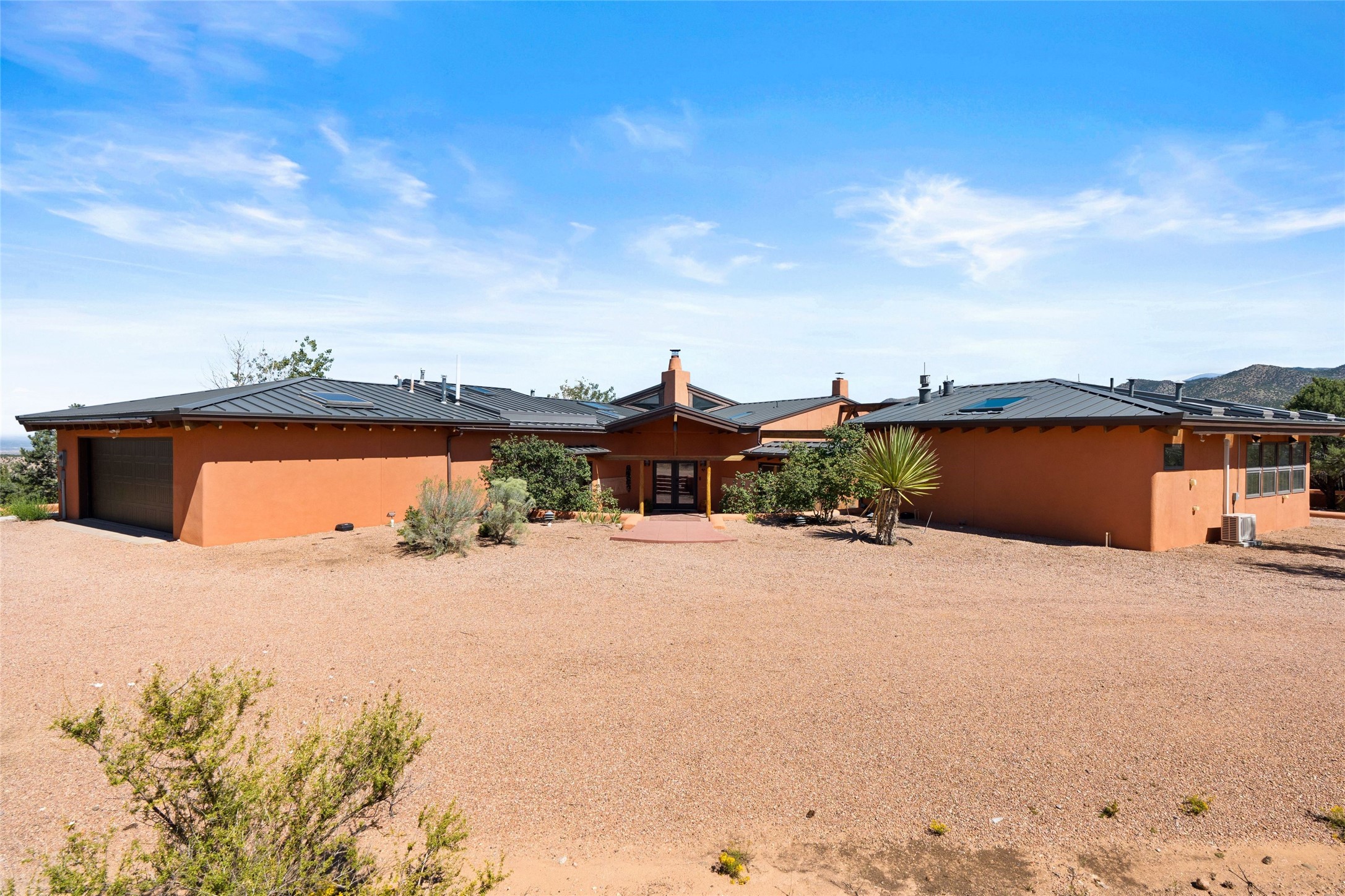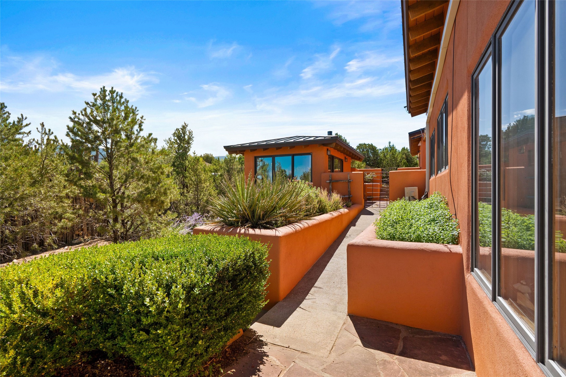 Stunning 3-bedroom, 3.5-bath home in Vista Redonda professionally sited on 5 ridge-top acres of piñon trees and breathtaking views of the Sangre de Cristo and Jemez Mountains. Constructed by renowned builder Dennis Sayer, this residence showcases exceptional workmanship and reflective design. The pitched roof and soaring beamed ceilings create an airy, inviting atmosphere, while the hard plaster walls and polished Saltillo tiles add timeless elegance. Upon entering, you'll find a spacious great room that flows into a dining area and a well-appointed eat-in kitchen. The office, complete with built-in desk and bookcases, provides a quiet retreat, while the kiva fireplace adds warmth and character to the space. The home features two en-suite bedrooms in each wing, ensuring privacy and comfort for guests.. In addition, there is a detached 196 sq. ft. studio/casita. Multiple outdoor areas invite you to enjoy al fresco dining and entertaining, including a delightful sunrise breakfast patio where you can soak in the morning sun with a cup of coffee. Natural light floods the home through plentiful skylights, windows, and glass doors, begetting a bright and welcoming environment. Additional highlights include a heated 2-car garage and newer boiler and water heaters. Just south of Vista Redonda is the Village of Tesuque, its neighborhood gathering spot Tesuque Village Market and the contemporary restaurant and bar, El Nido. Easy access to The Santa Fe Opera and downtown Santa Fe.