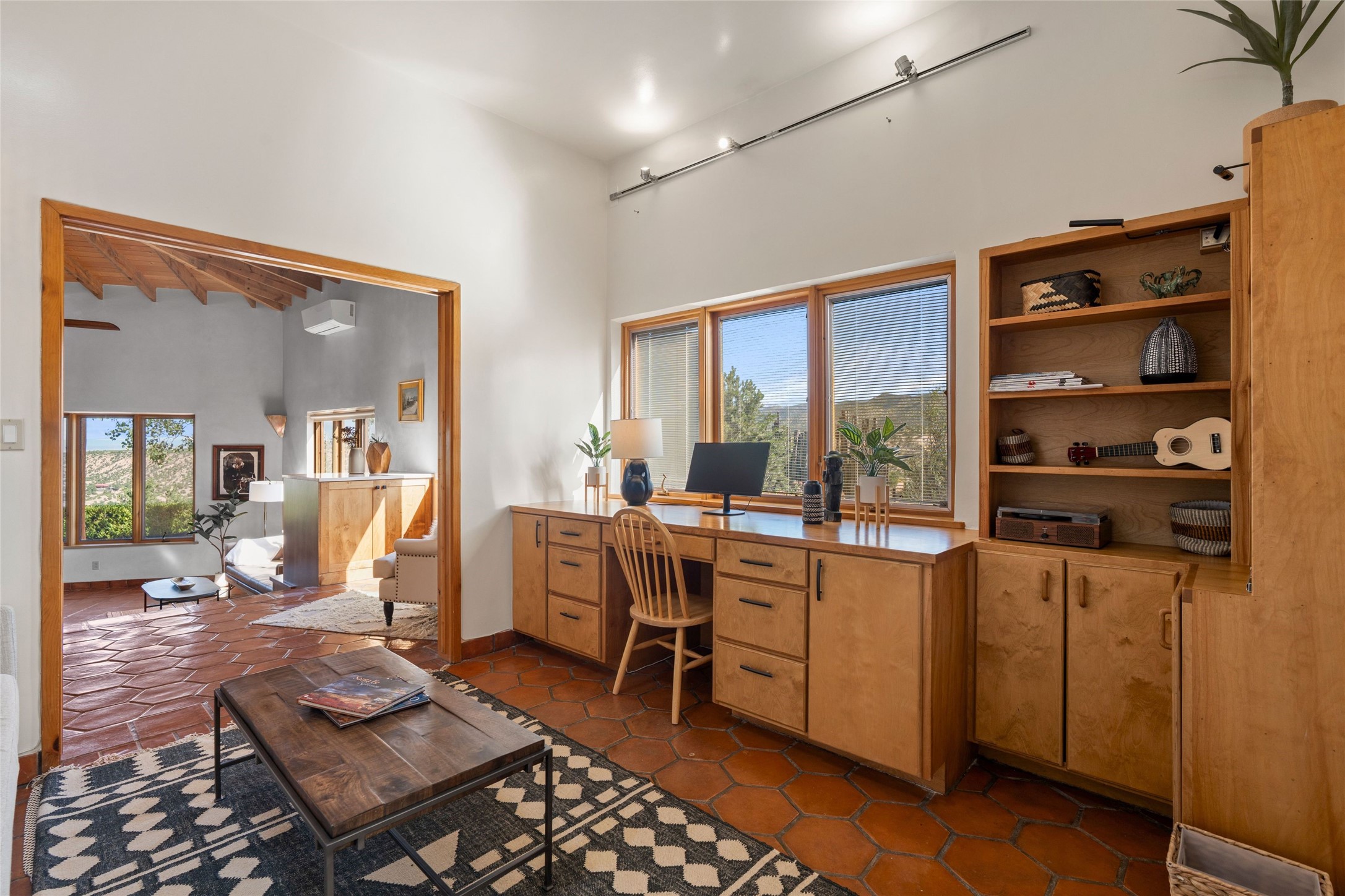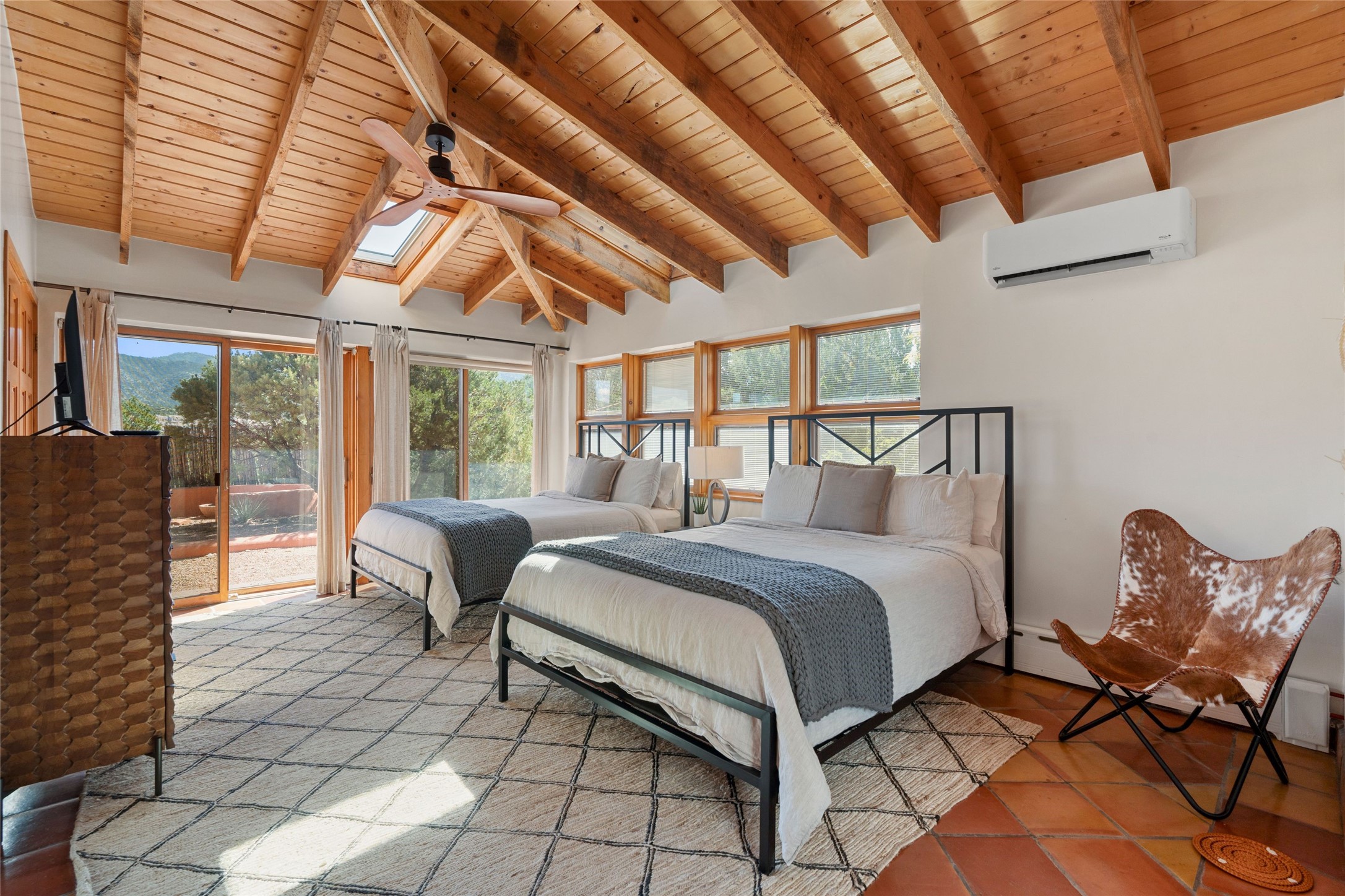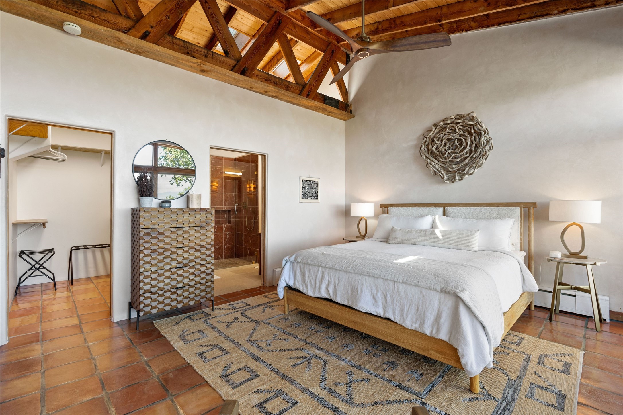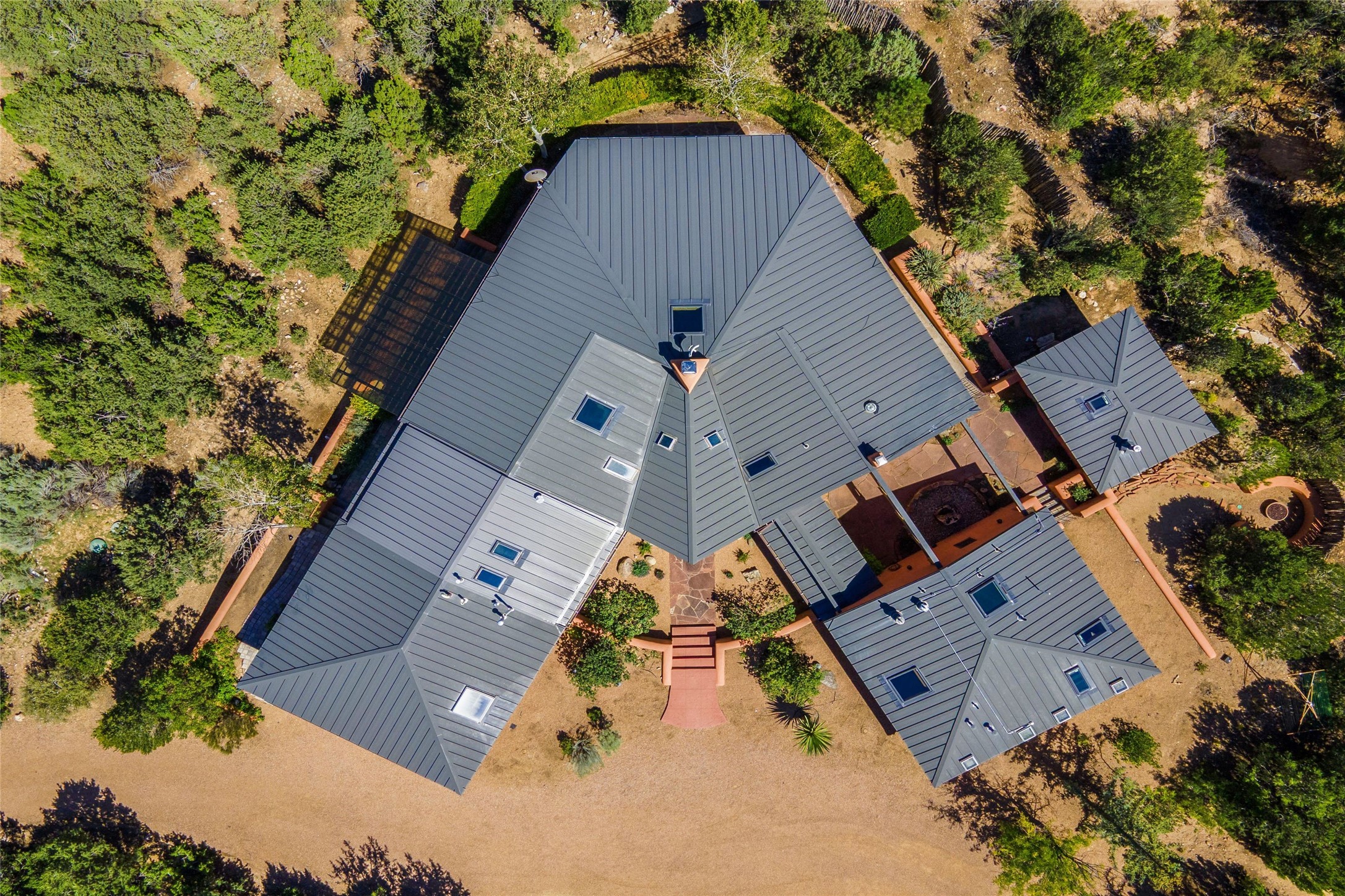 Stunning 3-bedroom, 3.5-bath home in Vista Redonda professionally sited on 5 ridge-top acres of piñon trees and breathtaking views of the Sangre de Cristo and Jemez Mountains. Constructed by renowned builder Dennis Sayer, this residence showcases exceptional workmanship and reflective design. The pitched roof and soaring beamed ceilings create an airy, inviting atmosphere, while the hard plaster walls and polished Saltillo tiles add timeless elegance. Upon entering, you'll find a spacious great room that flows into a dining area and a well-appointed eat-in kitchen. The office, complete with built-in desk and bookcases, provides a quiet retreat, while the kiva fireplace adds warmth and character to the space. The home features two en-suite bedrooms in each wing, ensuring privacy and comfort for guests.. In addition, there is a detached 196 sq. ft. studio/casita. Multiple outdoor areas invite you to enjoy al fresco dining and entertaining, including a delightful sunrise breakfast patio where you can soak in the morning sun with a cup of coffee. Natural light floods the home through plentiful skylights, windows, and glass doors, begetting a bright and welcoming environment. Additional highlights include a heated 2-car garage and newer boiler and water heaters. Just south of Vista Redonda is the Village of Tesuque, its neighborhood gathering spot Tesuque Village Market and the contemporary restaurant and bar, El Nido. Easy access to The Santa Fe Opera and downtown Santa Fe.