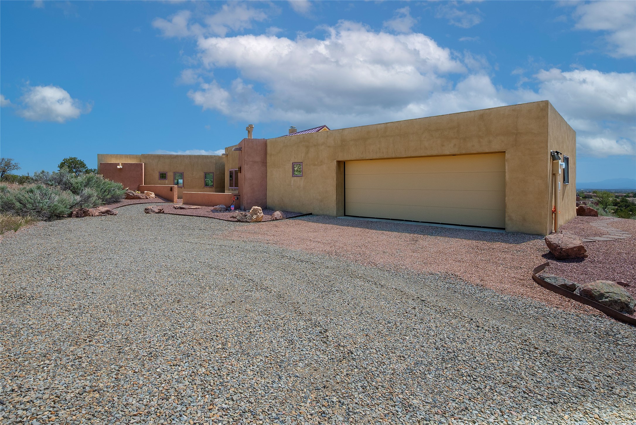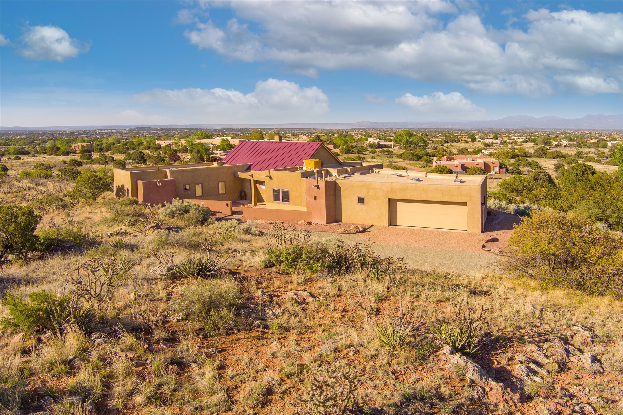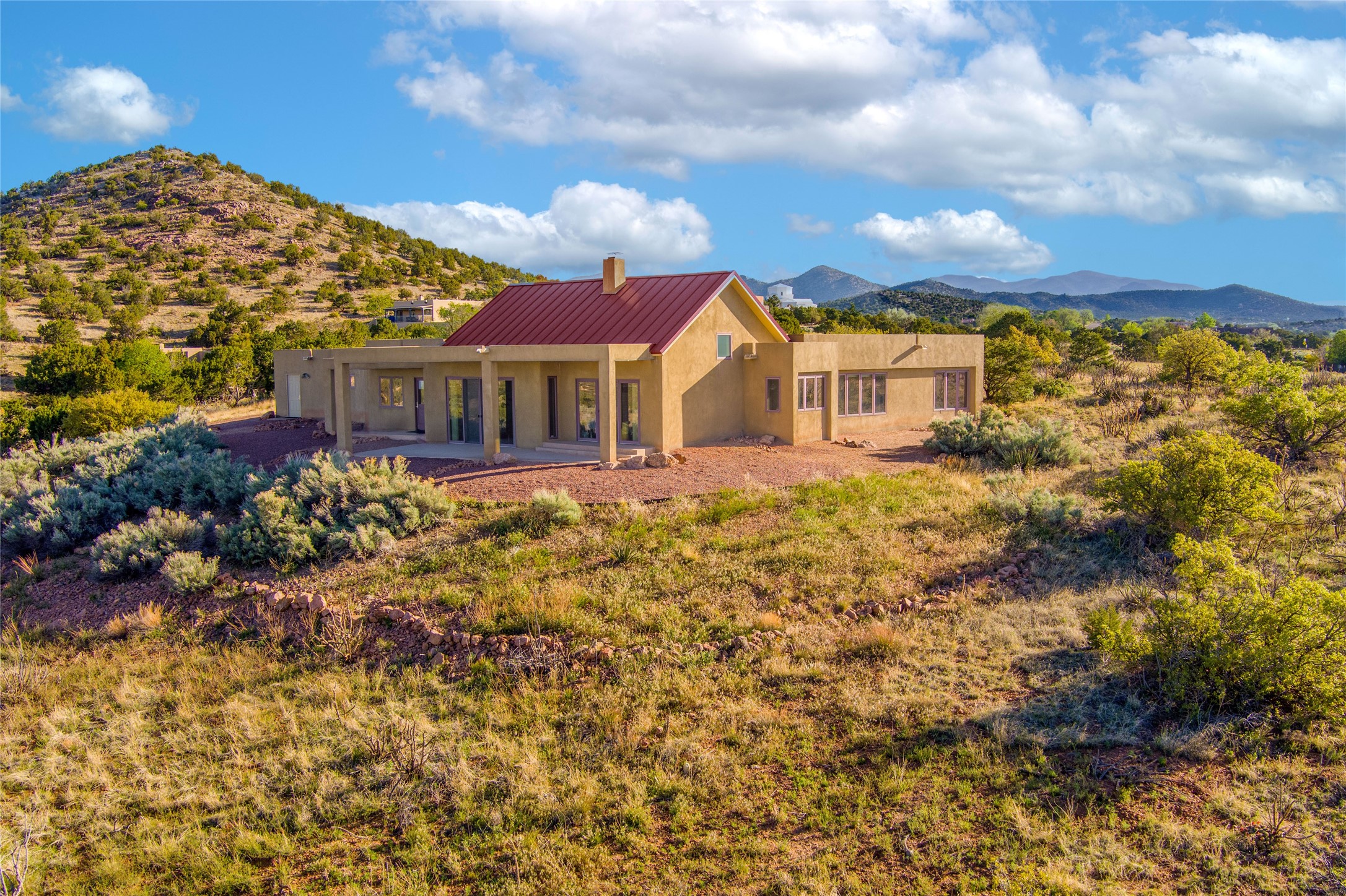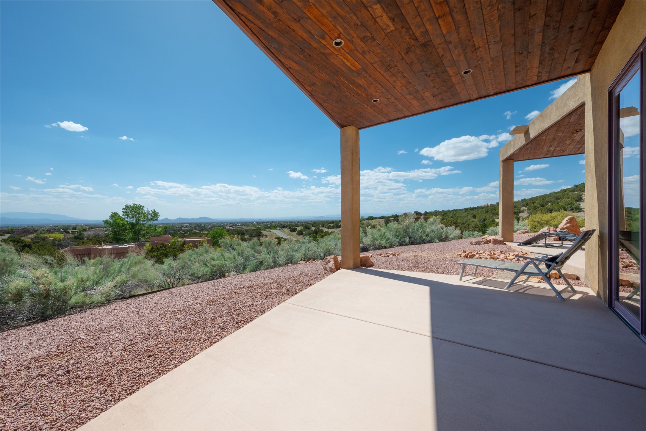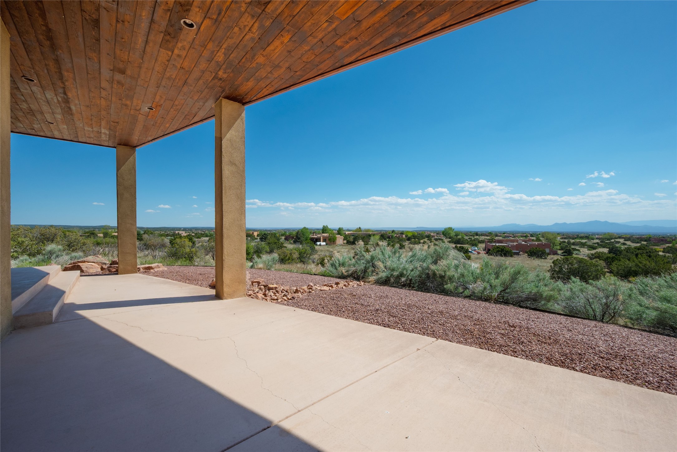 This stunning custom one-owner home on 2.8 acres offers breathtaking mountain and sunset views with a design that blends elegance and comfort. The light-filled open main living area is anchored by a striking stone veneer fireplace, complemented by bamboo wood flooring and soaring cathedral wood deck ceilings. A chef’s kitchen with quartz countertops, gas cooking, and modern finishes pairs beautifully with radiant heating and a central vacuum system for convenience. The expansive primary suite boasts sweeping views, a generous walk-in closet, and a spa-like bath retreat, while two guest bedrooms and a separate office provide space for family and work. The spacious garage includes a lockable storage room, and spacious covered patios invite year-round outdoor living while soaking in the panoramic scenery. The Dos Griegos community is conveniently located for easy access to I-25 and Santa Fe. Local dining, shopping and recreation options are within minutes of the home.