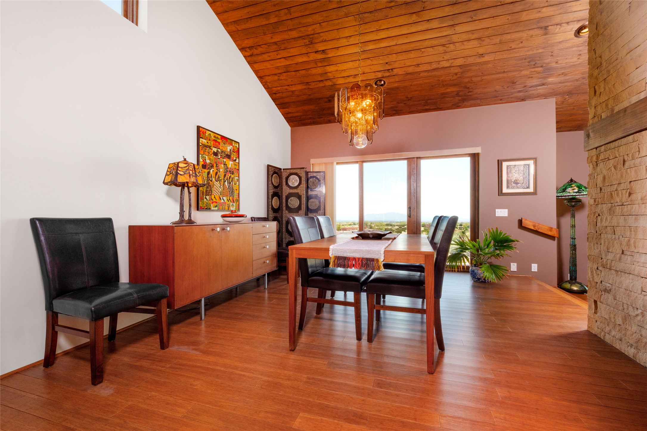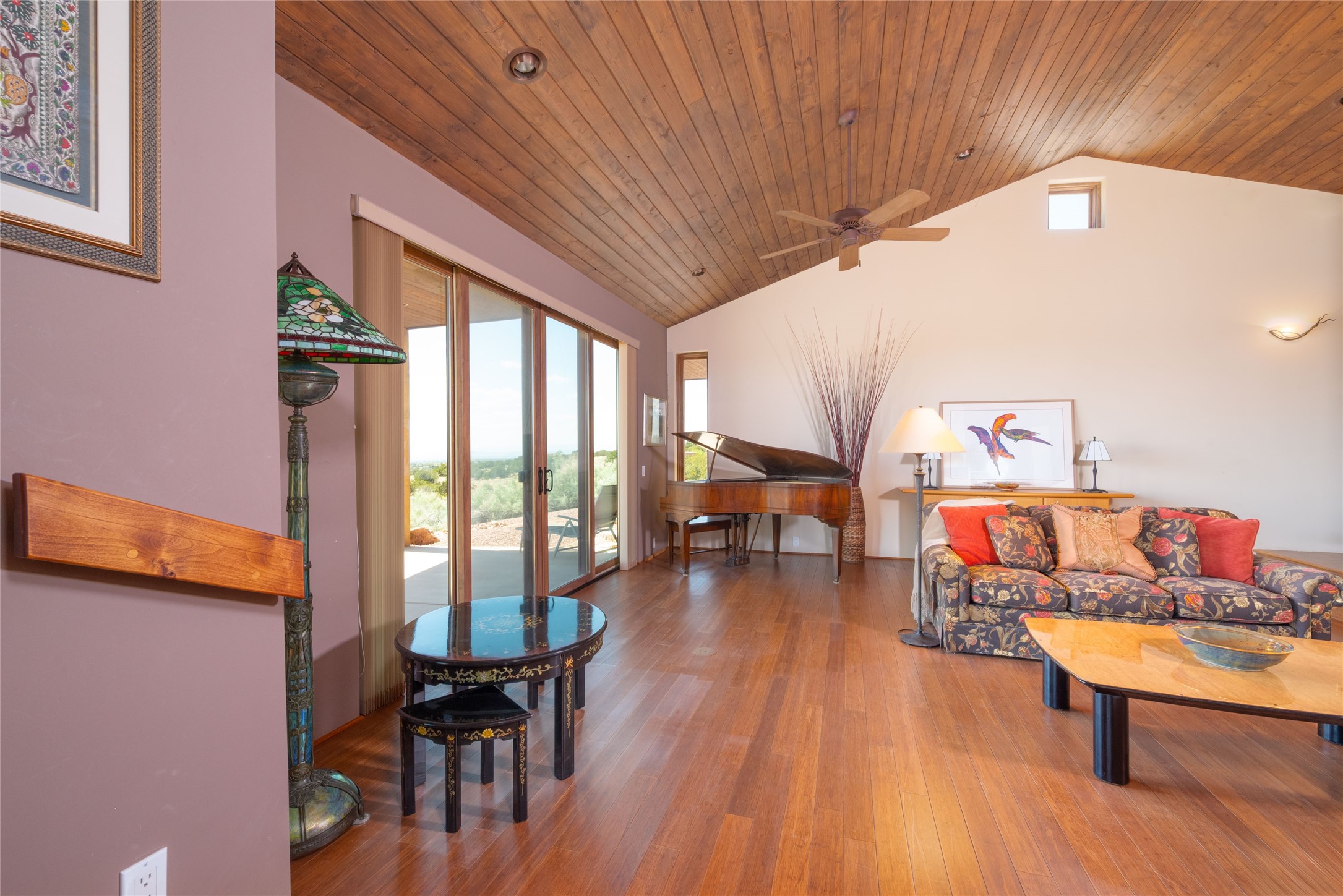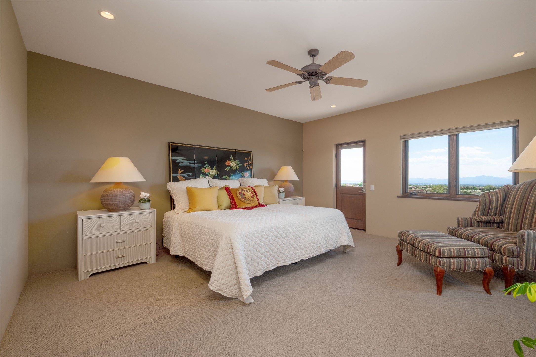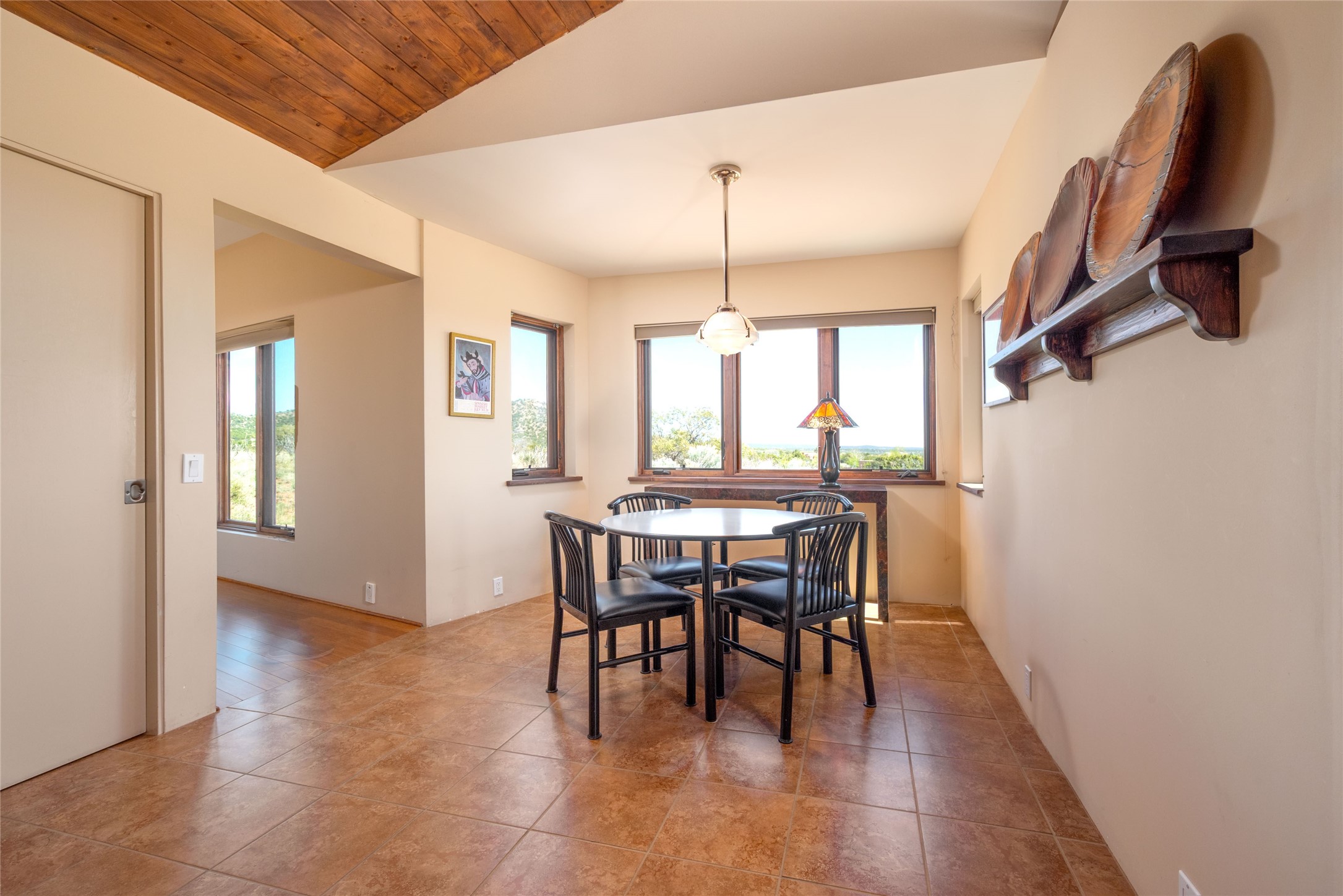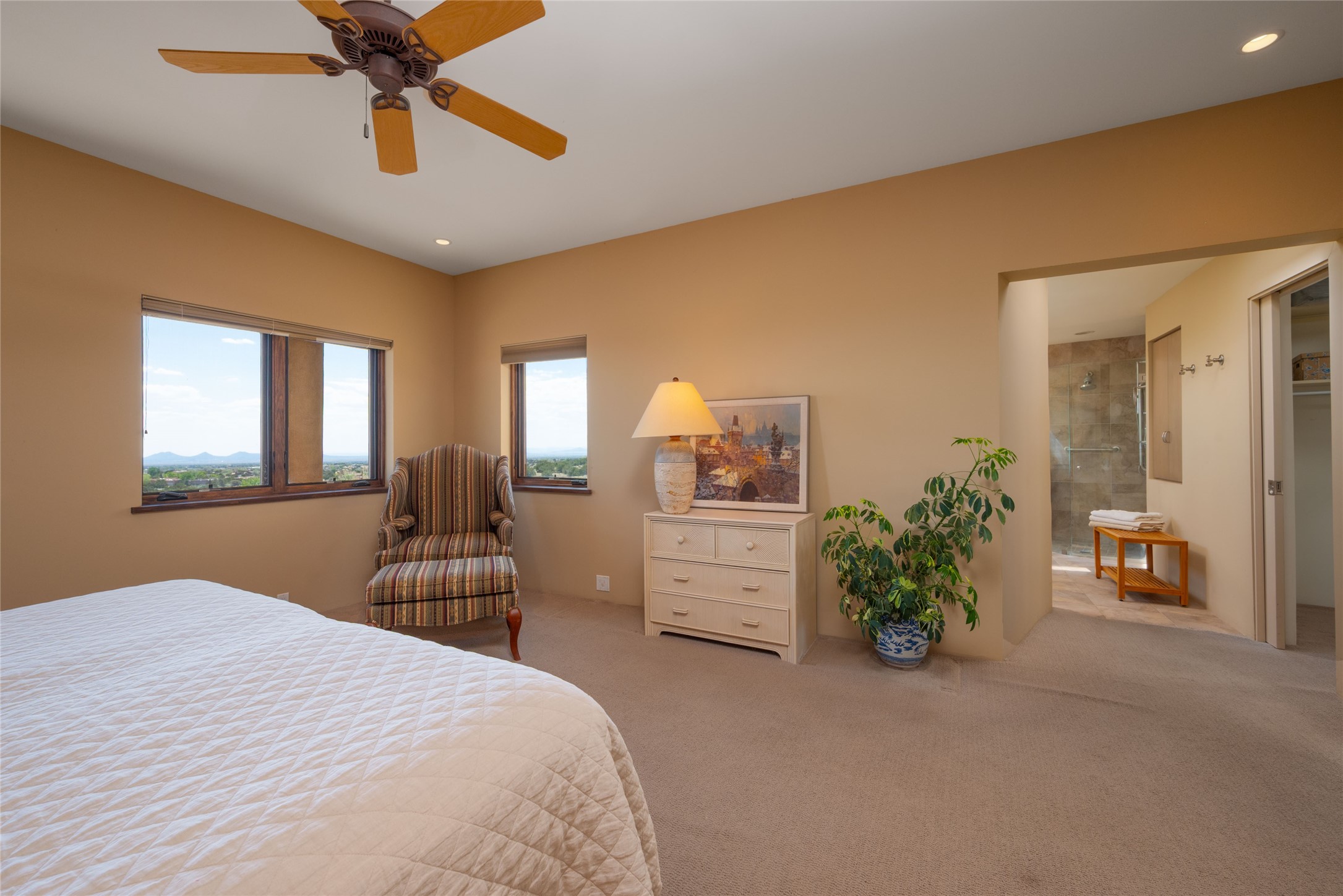 This stunning custom one-owner home on 2.8 acres offers breathtaking mountain and sunset views with a design that blends elegance and comfort. The light-filled open main living area is anchored by a striking stone veneer fireplace, complemented by bamboo wood flooring and soaring cathedral wood deck ceilings. A chef’s kitchen with quartz countertops, gas cooking, and modern finishes pairs beautifully with radiant heating and a central vacuum system for convenience. The expansive primary suite boasts sweeping views, a generous walk-in closet, and a spa-like bath retreat, while two guest bedrooms and a separate office provide space for family and work. The spacious garage includes a lockable storage room, and spacious covered patios invite year-round outdoor living while soaking in the panoramic scenery. The Dos Griegos community is conveniently located for easy access to I-25 and Santa Fe. Local dining, shopping and recreation options are within minutes of the home.