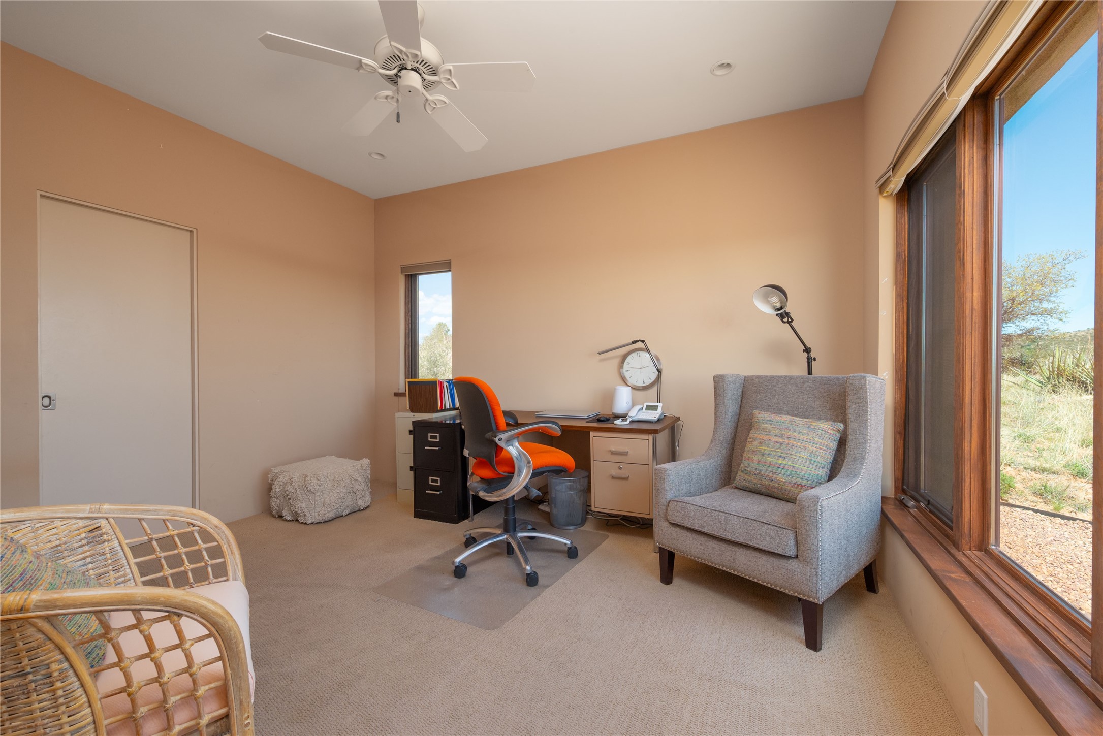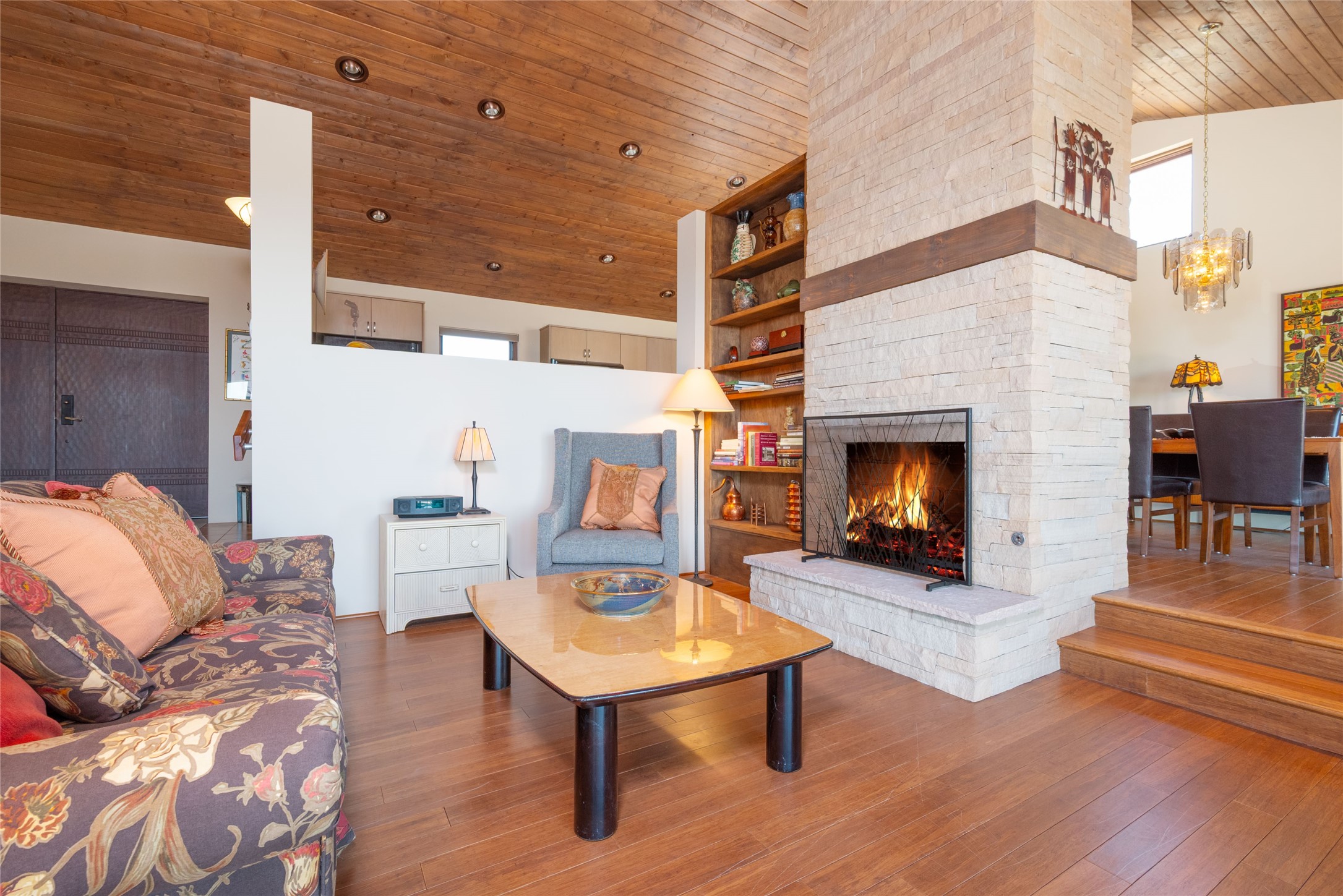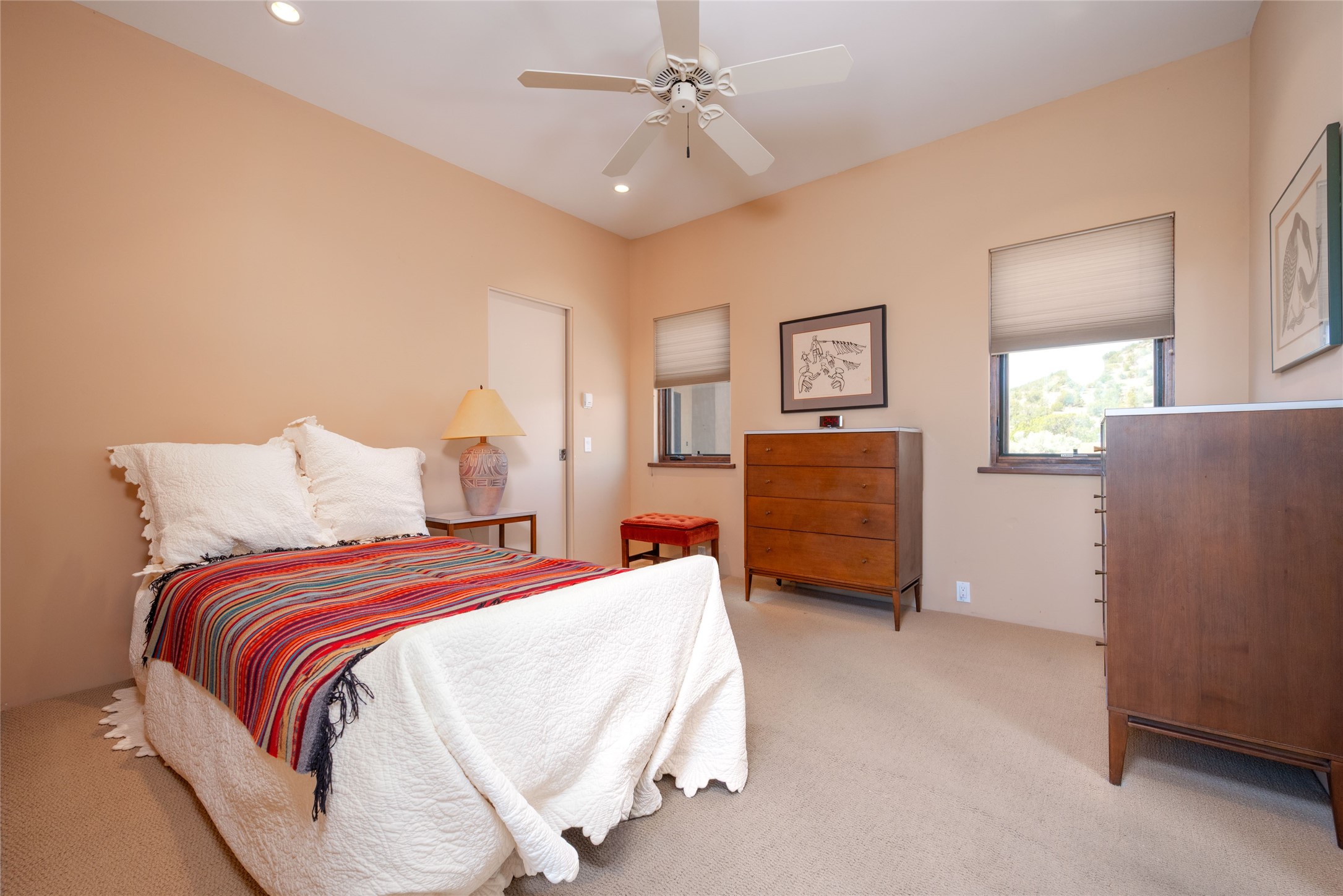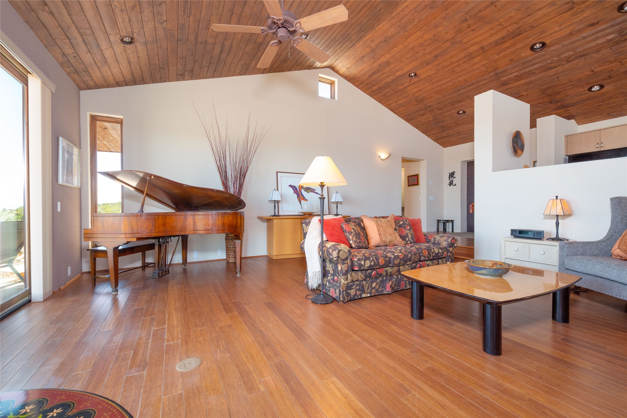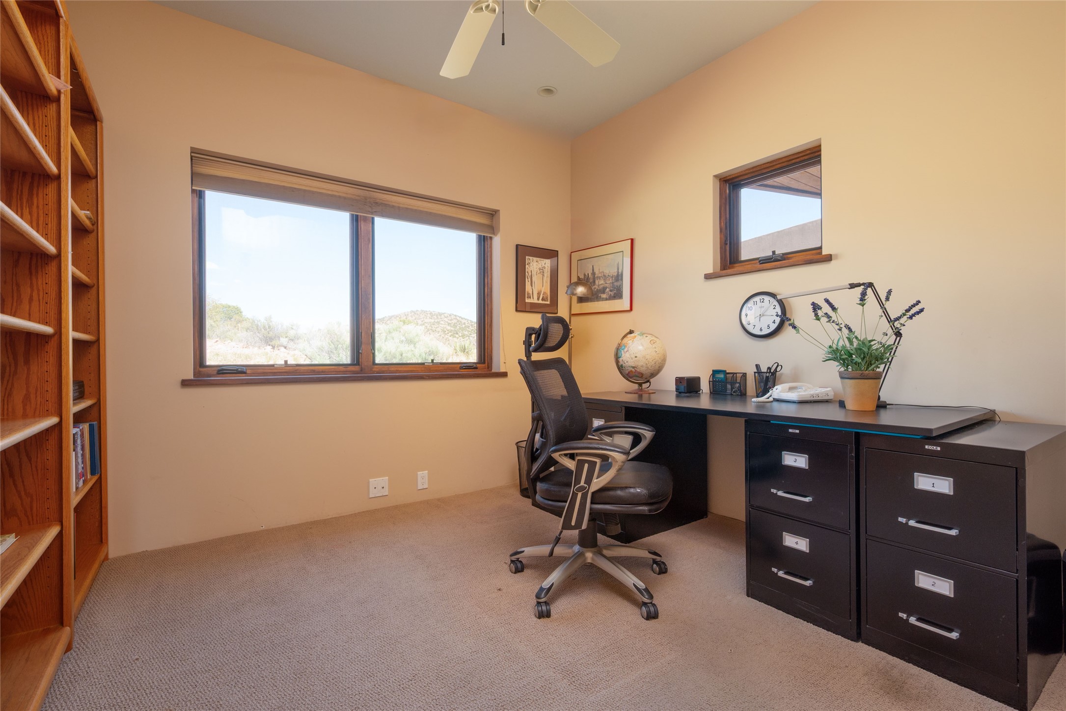 This stunning custom one-owner home on 2.8 acres offers breathtaking mountain and sunset views with a design that blends elegance and comfort. The light-filled open main living area is anchored by a striking stone veneer fireplace, complemented by bamboo wood flooring and soaring cathedral wood deck ceilings. A chef’s kitchen with quartz countertops, gas cooking, and modern finishes pairs beautifully with radiant heating and a central vacuum system for convenience. The expansive primary suite boasts sweeping views, a generous walk-in closet, and a spa-like bath retreat, while two guest bedrooms and a separate office provide space for family and work. The spacious garage includes a lockable storage room, and spacious covered patios invite year-round outdoor living while soaking in the panoramic scenery. The Dos Griegos community is conveniently located for easy access to I-25 and Santa Fe. Local dining, shopping and recreation options are within minutes of the home.