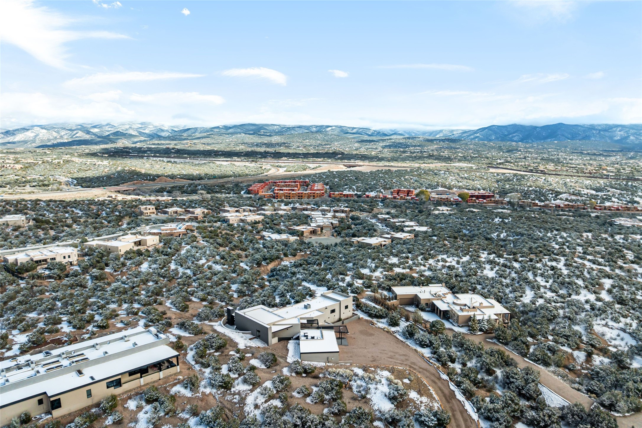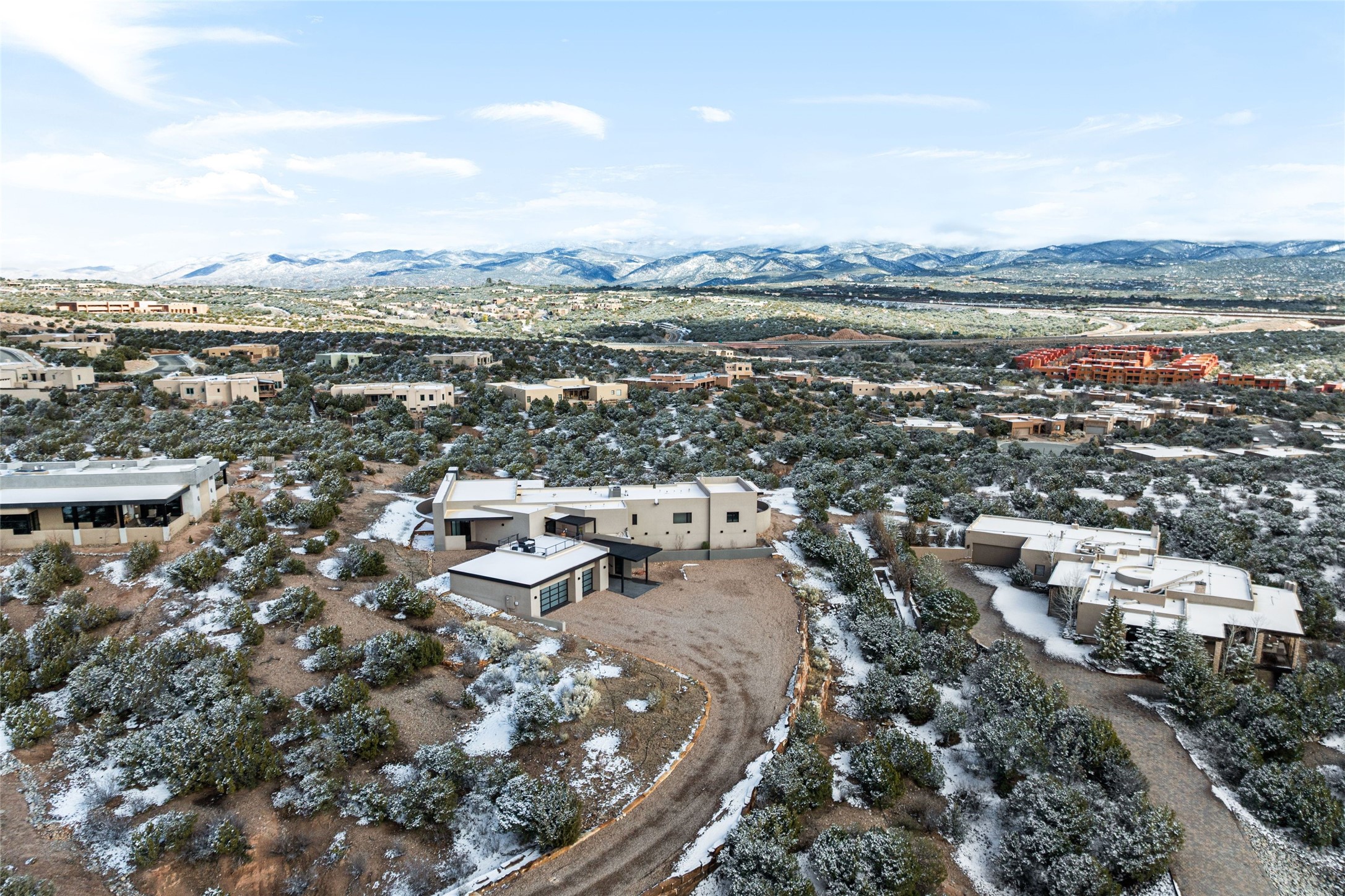 Stunning 3-bedroom custom-built home with awe-inspiring vistas of the Santa Fe’s cityscape and the Sangre de Cristo mountains. This 3,500+ sq. ft. Parade of Homes winner for the Award of Excellence (2023) features Boss Builders signature style and luxury finishes throughout. The architectural design respects the traditional historical vernacular of Santa Fe style while layering on a more contemporary interpretation with classic white marble flooring, smooth plaster walls, and crisp corners. Expertly sited on a 1-acre lot, the home offers sweeping 360-degree vistas, with multiple large outdoor spaces that include two covered portals and a rooftop deck (with elevator). Entry opens to a spacious great room with a sleek gas fireplace that flows into a dining area, bar and a walk-out patio with a gas fire pit and panoramic mountain views. Dramatic open gourmet kitchen is appointed with top-of-the-line Sub-Zero and Wolf appliances, black marble counter tops, crisp white cabinetry and a grand center island with room to seat four. With 3 bedrooms, 3 full bathrooms and a flexible studio or media room, the home was designed to adapt to a variety of lifestyles. The primary suite is a private retreat, featuring a corner pocketing slider to its own patio, a spa-like bath with soaking tub, double-sided fireplace, walk-in shower, and generous closet space. Laundry room with sink and plentiful cabinetry. 3 -car garage. Excellent north side location just minutes from the Santa Fe Plaza, Canyon Road and Museum Hill.