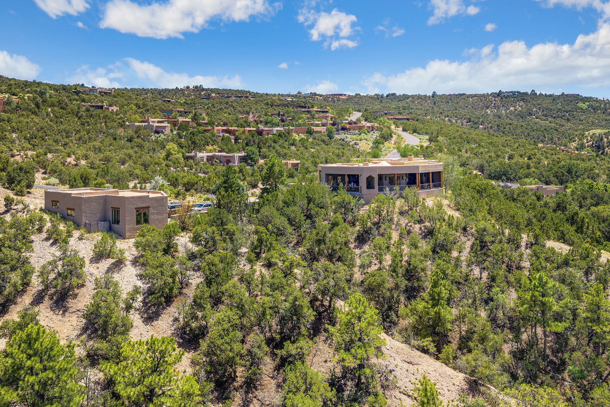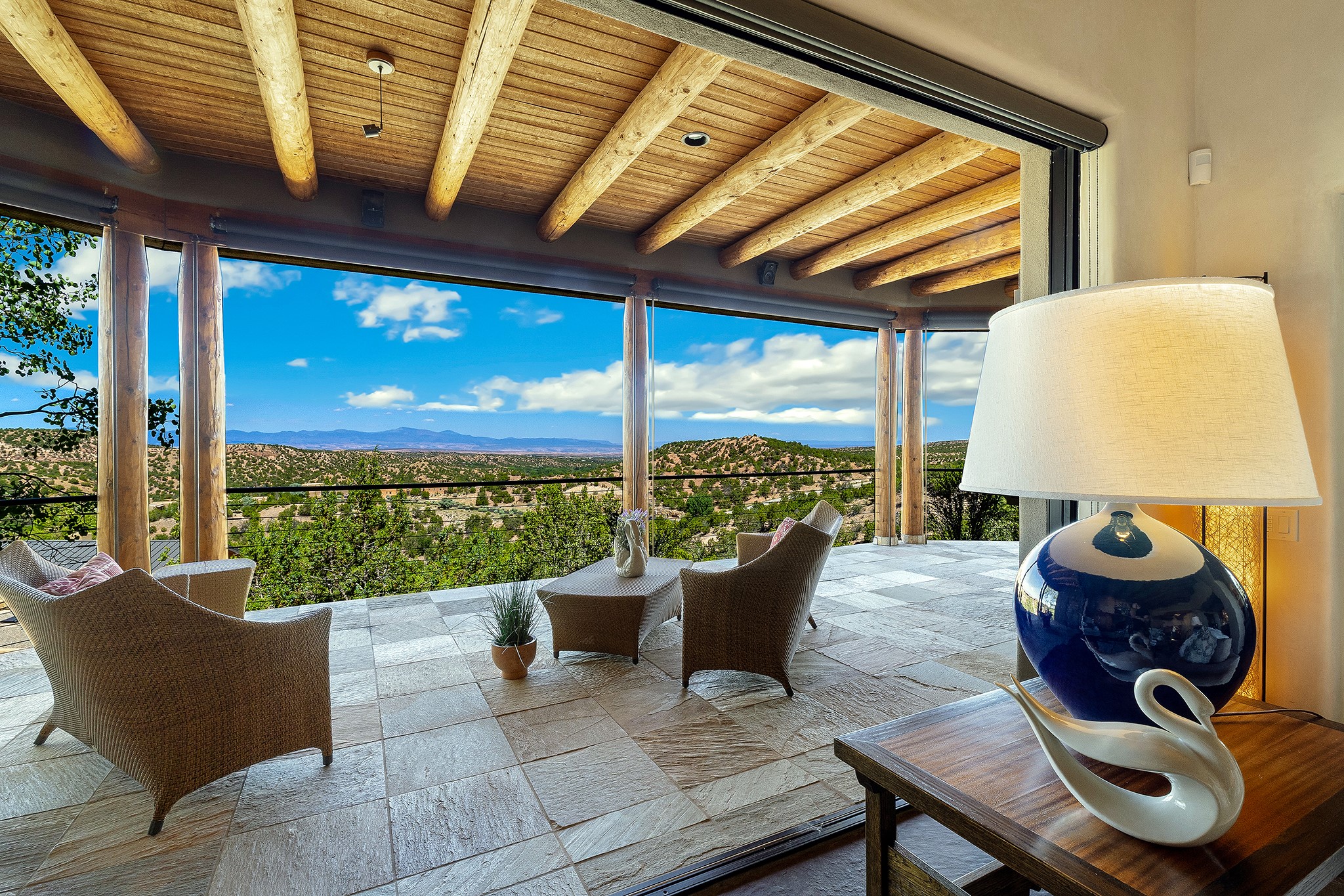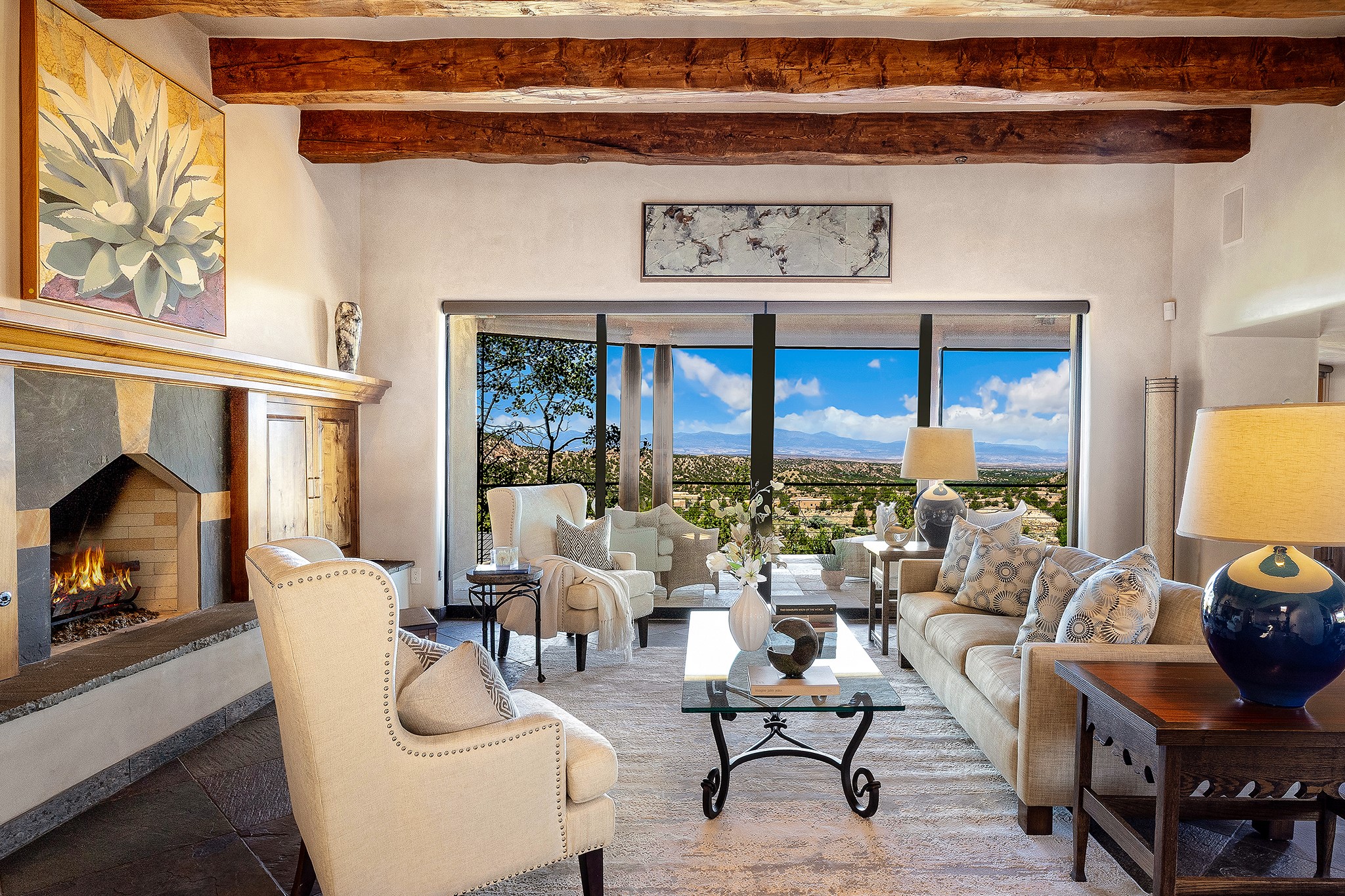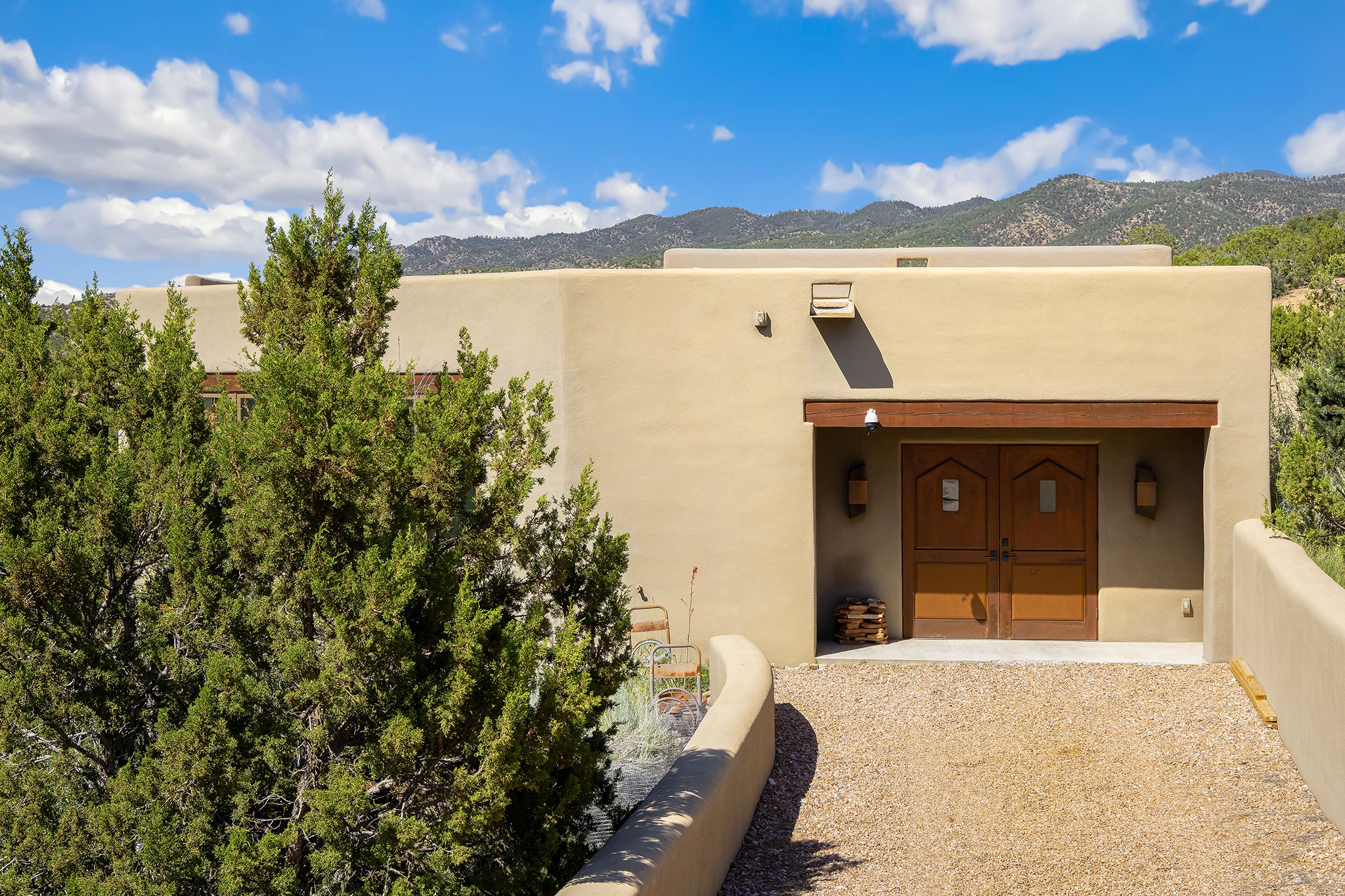 An exceptional Value in Bishop’s Lodge Hills & Villas! Perched above the Tesuque hills on 2.38 acres, 9 Lodge Circle offers a rare combination of panoramic mountain views and a unique Southwestern design—all just minutes from the Plaza. Set within the gated community of Bishop’s Lodge Hills and Villas, this extraordinary property includes a 4,300 sq. ft. main residence and a versatile 1,500 sq. ft. detached studio, with commanding views of both the Jemez and Sangre de Cristo mountain ranges. The main home is a masterclass in design, showcasing a unique architectural blend of contemporary and Southwestern influences. The central living area features disappearing glass doors that open to a sweeping west-facing portal—perfect for soaking in Santa Fe’s golden-hour light. An outdoor cantina with a gas fireplace and built-in grill sets the stage for elegant al fresco entertaining.The chef’s kitchen is equally inspired, with a spacious island, cozy banco, butler’s pantry, dumbwaiter, and an expansive picture window framing the Sangres. A dramatic dining room with a raised octagonal ceiling and fireplace offers a captivating setting for both intimate and grand gatherings. The primary suite is a private sanctuary, complete with a secluded hot tub for sunset views and stargazing. Two guest suites each offer ensuite baths, while a separate office provides quiet space for work or reflection. The detached 1,500 sq. ft. studio—originally a woodworking shop— brimming with potential as a creative studio, gym, or guest quarters. As a bonus, ownership includes social membership privileges at the world-renowned Bishop’s Lodge Resort. With its new price of $3,395,000, this exceptional property presents a compelling value in one of Santa Fe’s most coveted locations—where design, privacy, and inspiration converge.