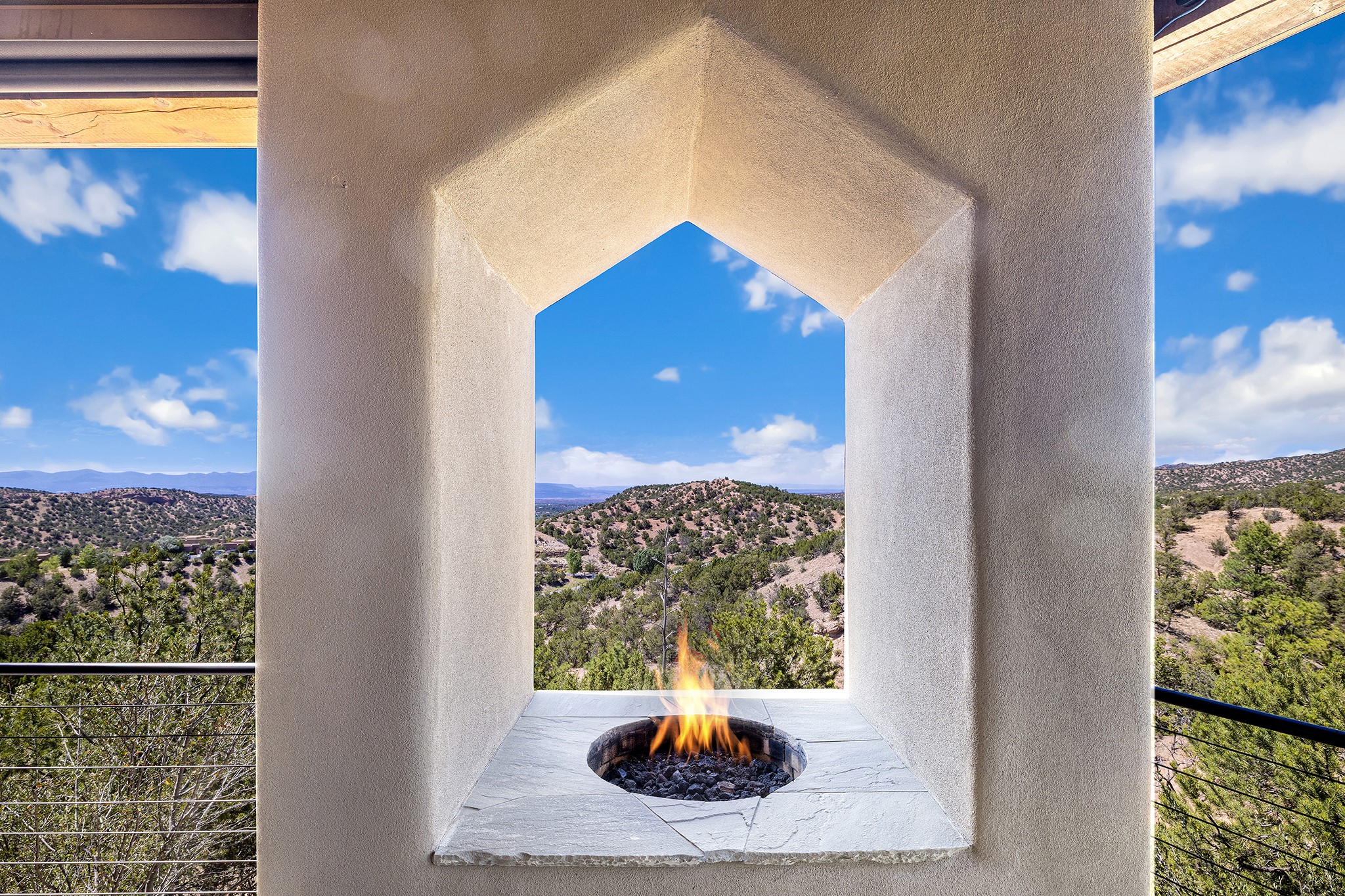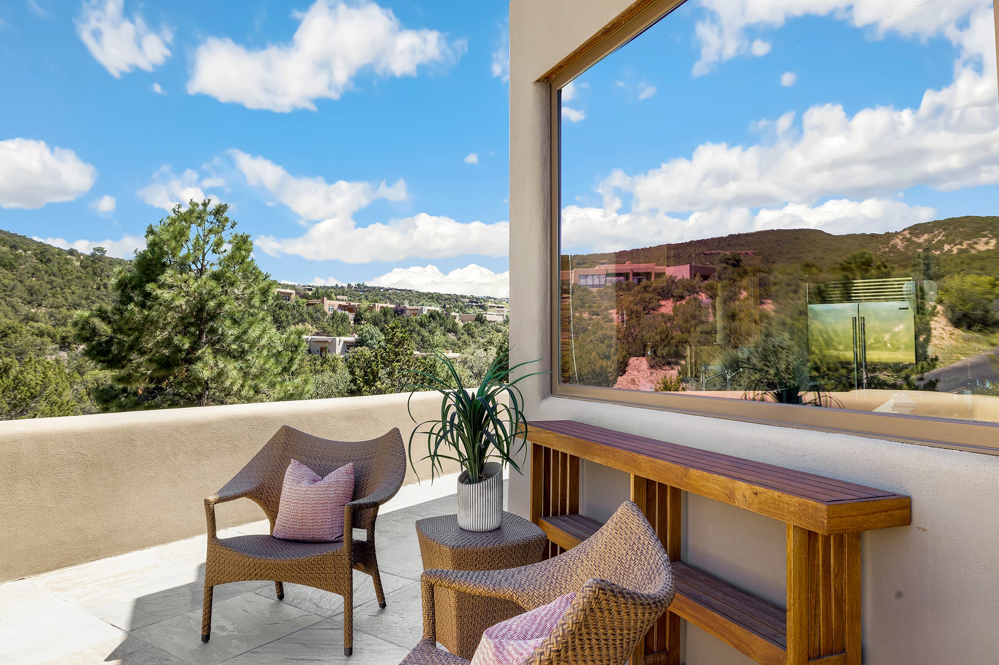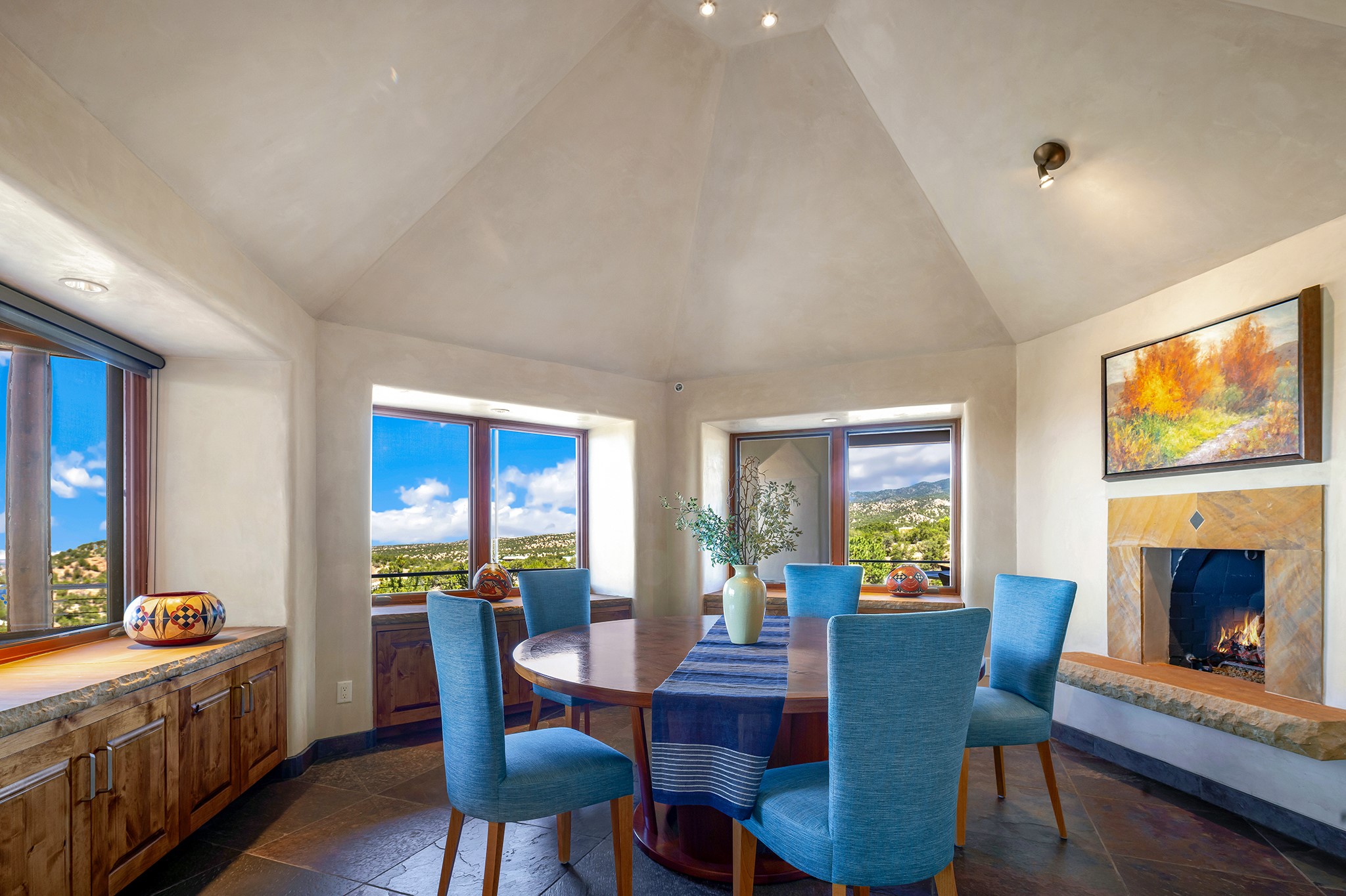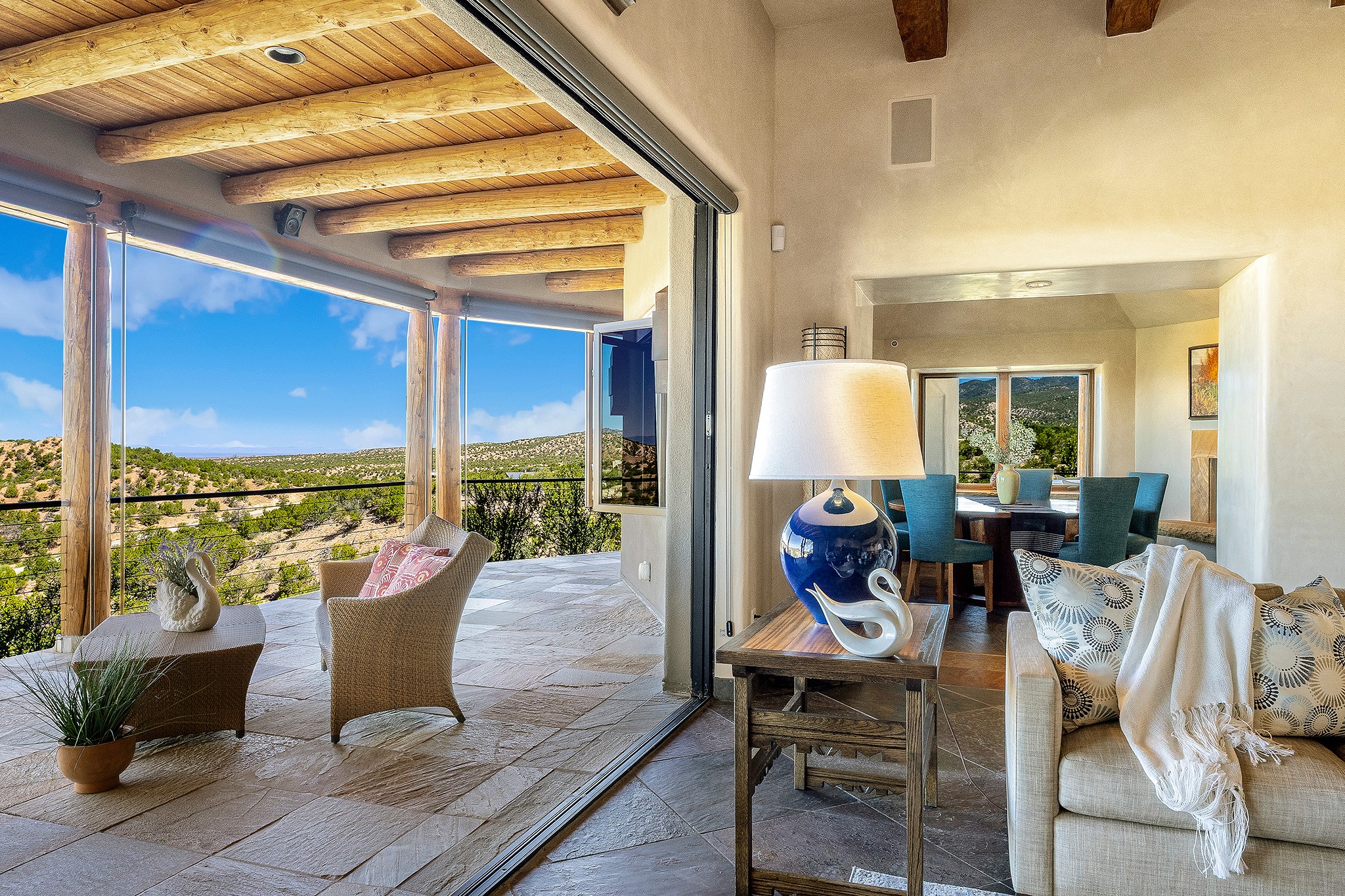 An exceptional Value in Bishop’s Lodge Hills & Villas! Perched above the Tesuque hills on 2.38 acres, 9 Lodge Circle offers a rare combination of panoramic mountain views and a unique Southwestern design—all just minutes from the Plaza. Set within the gated community of Bishop’s Lodge Hills and Villas, this extraordinary property includes a 4,300 sq. ft. main residence and a versatile 1,500 sq. ft. detached studio, with commanding views of both the Jemez and Sangre de Cristo mountain ranges. The main home is a masterclass in design, showcasing a unique architectural blend of contemporary and Southwestern influences. The central living area features disappearing glass doors that open to a sweeping west-facing portal—perfect for soaking in Santa Fe’s golden-hour light. An outdoor cantina with a gas fireplace and built-in grill sets the stage for elegant al fresco entertaining.The chef’s kitchen is equally inspired, with a spacious island, cozy banco, butler’s pantry, dumbwaiter, and an expansive picture window framing the Sangres. A dramatic dining room with a raised octagonal ceiling and fireplace offers a captivating setting for both intimate and grand gatherings. The primary suite is a private sanctuary, complete with a secluded hot tub for sunset views and stargazing. Two guest suites each offer ensuite baths, while a separate office provides quiet space for work or reflection. The detached 1,500 sq. ft. studio—originally a woodworking shop— brimming with potential as a creative studio, gym, or guest quarters. As a bonus, ownership includes social membership privileges at the world-renowned Bishop’s Lodge Resort. With its new price of $3,395,000, this exceptional property presents a compelling value in one of Santa Fe’s most coveted locations—where design, privacy, and inspiration converge.