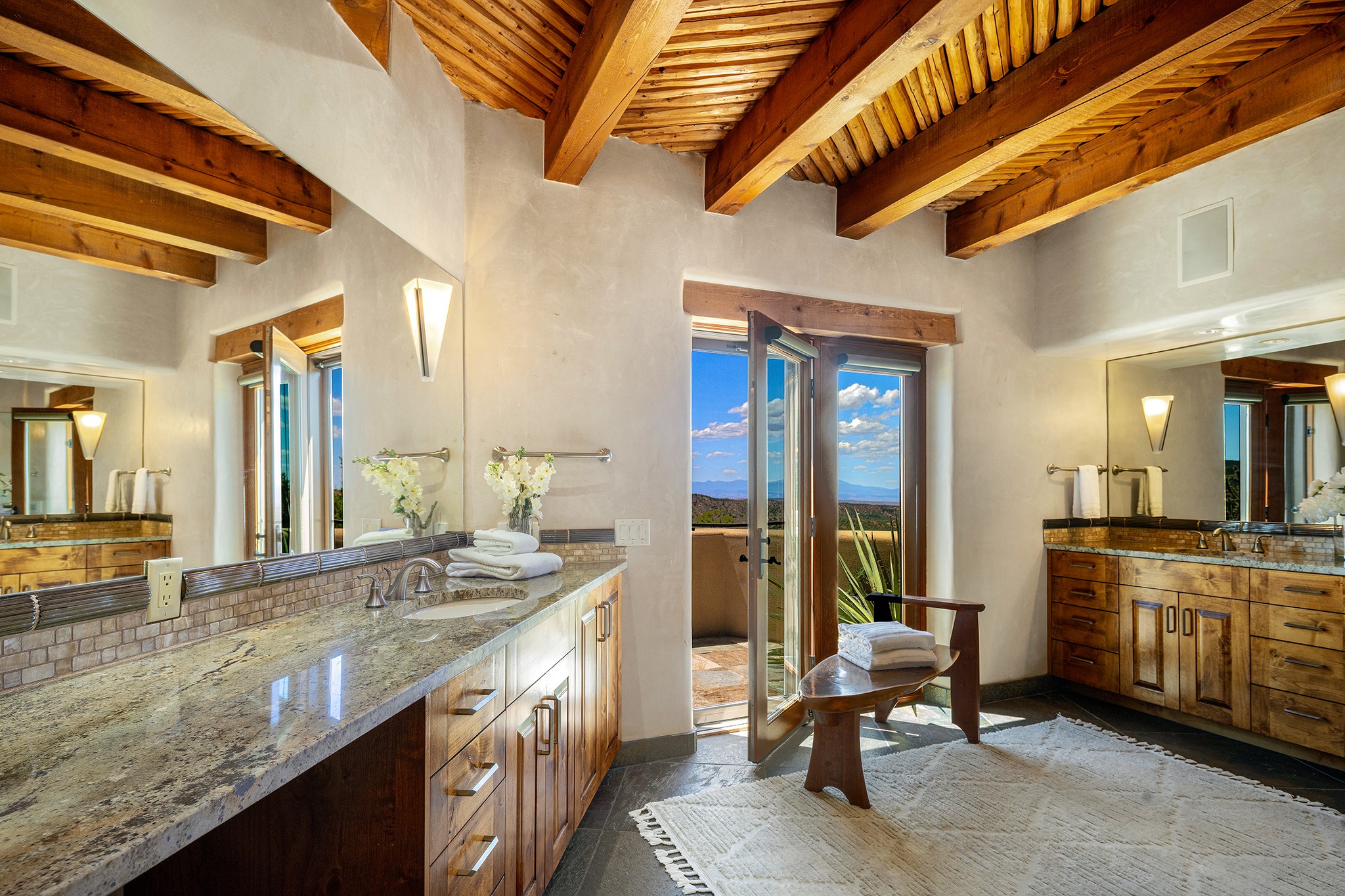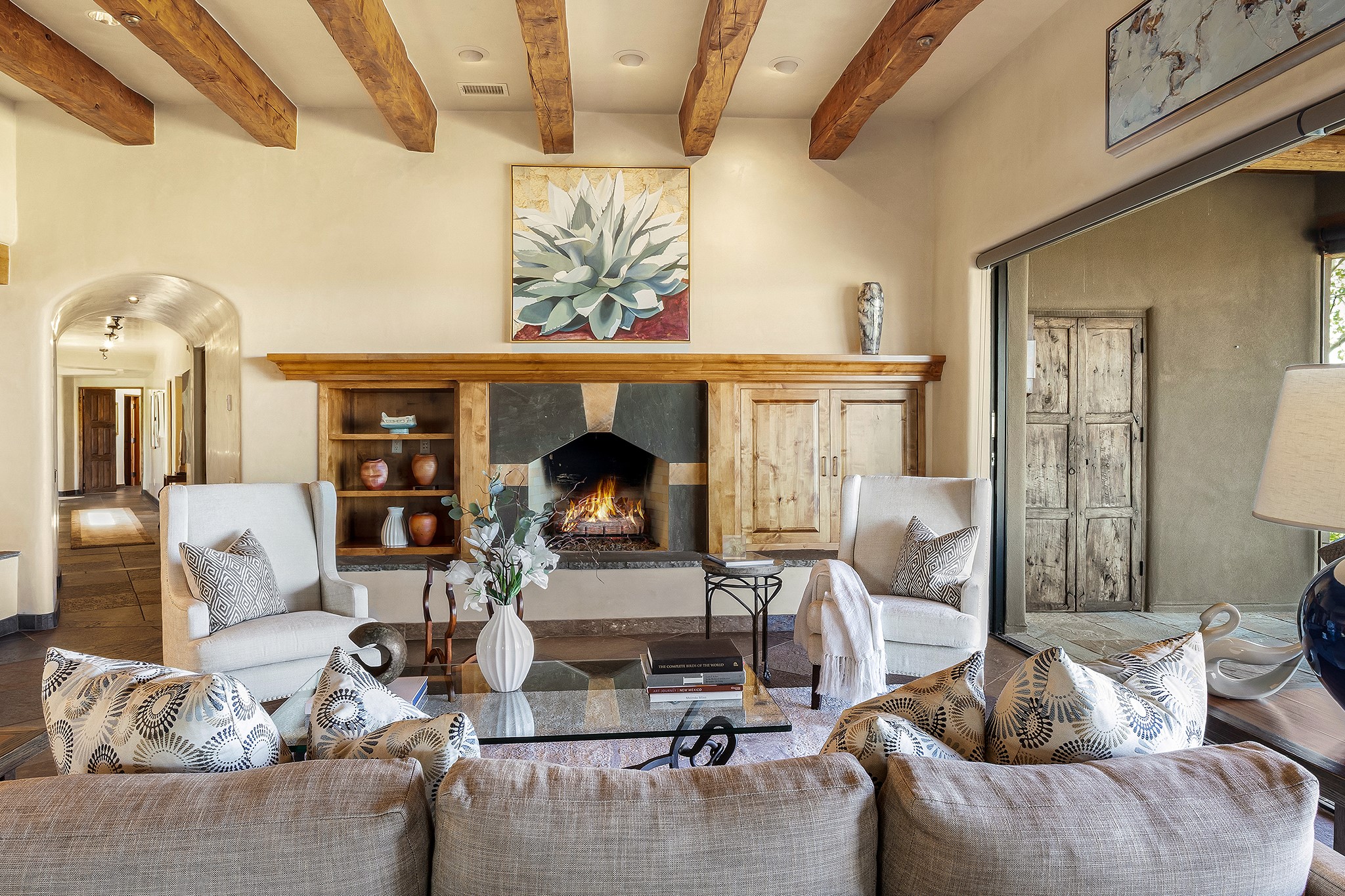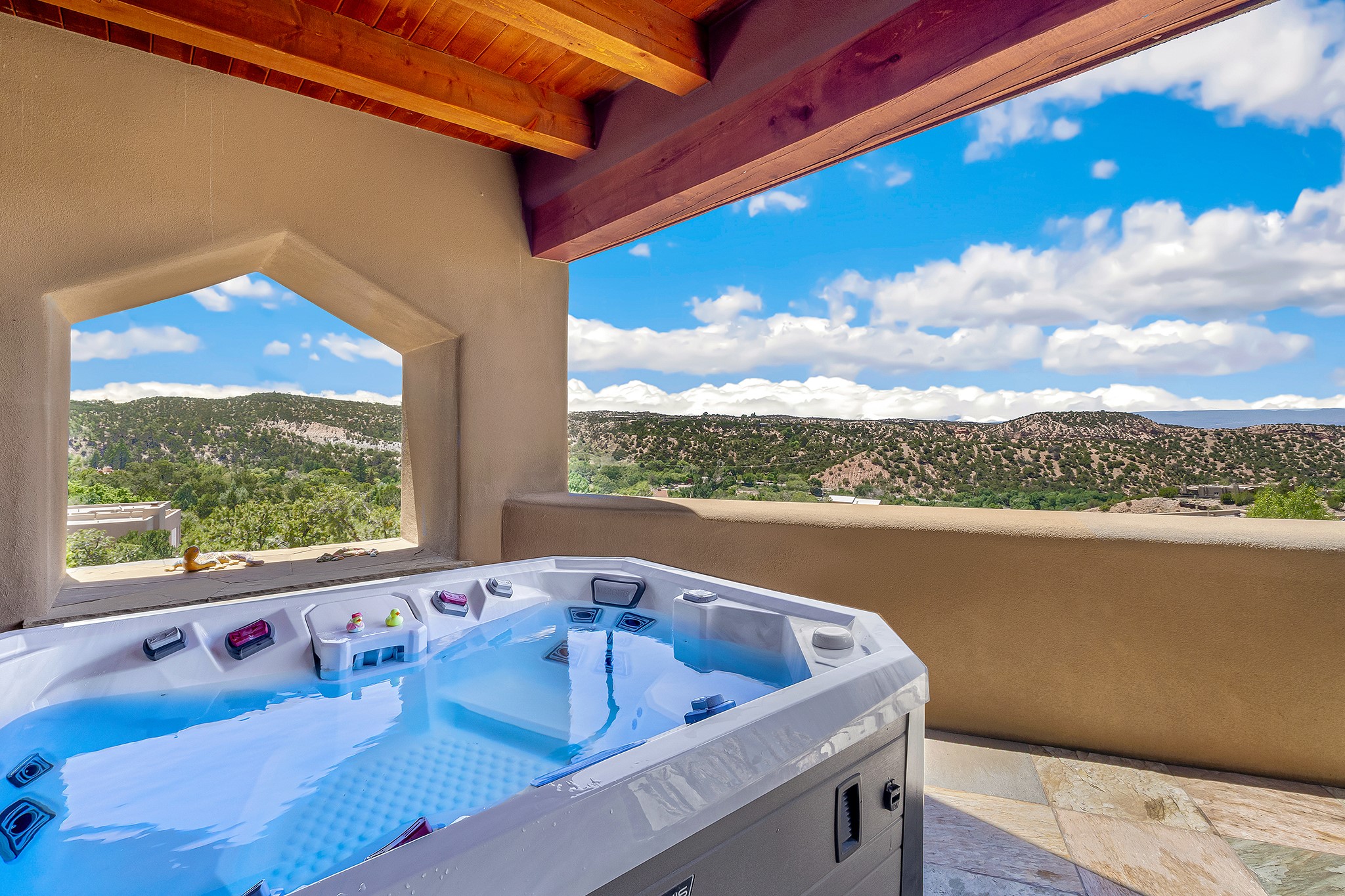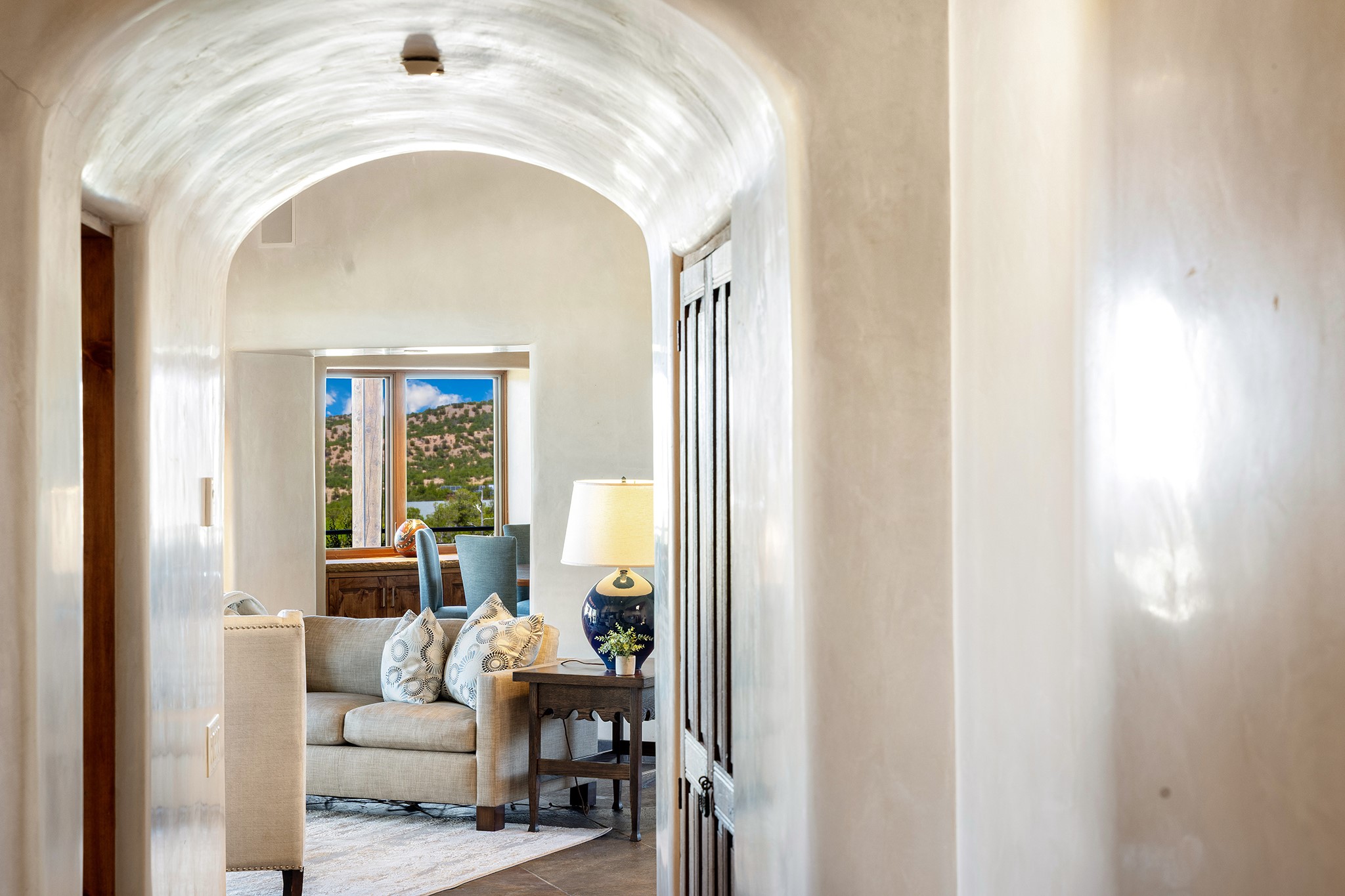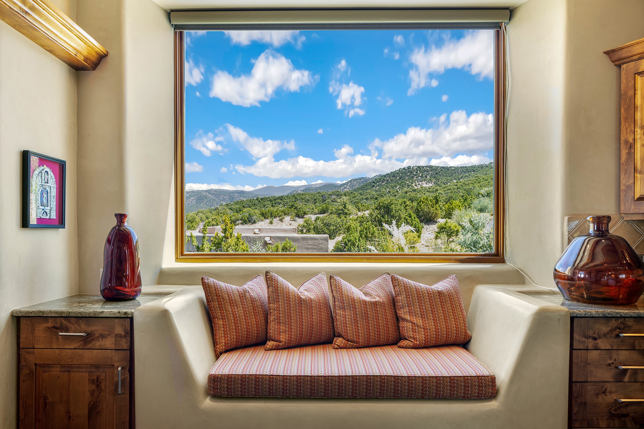 An exceptional Value in Bishop’s Lodge Hills & Villas! Perched above the Tesuque hills on 2.38 acres, 9 Lodge Circle offers a rare combination of panoramic mountain views and a unique Southwestern design—all just minutes from the Plaza. Set within the gated community of Bishop’s Lodge Hills and Villas, this extraordinary property includes a 4,300 sq. ft. main residence and a versatile 1,500 sq. ft. detached studio, with commanding views of both the Jemez and Sangre de Cristo mountain ranges. The main home is a masterclass in design, showcasing a unique architectural blend of contemporary and Southwestern influences. The central living area features disappearing glass doors that open to a sweeping west-facing portal—perfect for soaking in Santa Fe’s golden-hour light. An outdoor cantina with a gas fireplace and built-in grill sets the stage for elegant al fresco entertaining.The chef’s kitchen is equally inspired, with a spacious island, cozy banco, butler’s pantry, dumbwaiter, and an expansive picture window framing the Sangres. A dramatic dining room with a raised octagonal ceiling and fireplace offers a captivating setting for both intimate and grand gatherings. The primary suite is a private sanctuary, complete with a secluded hot tub for sunset views and stargazing. Two guest suites each offer ensuite baths, while a separate office provides quiet space for work or reflection. The detached 1,500 sq. ft. studio—originally a woodworking shop— brimming with potential as a creative studio, gym, or guest quarters. As a bonus, ownership includes social membership privileges at the world-renowned Bishop’s Lodge Resort. With its new price of $3,395,000, this exceptional property presents a compelling value in one of Santa Fe’s most coveted locations—where design, privacy, and inspiration converge.
