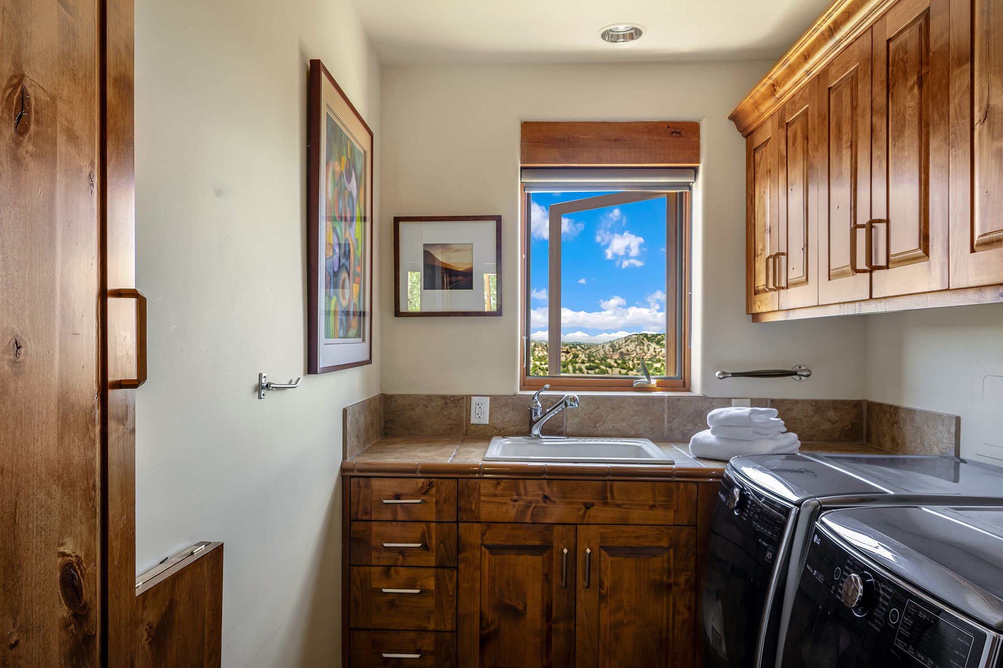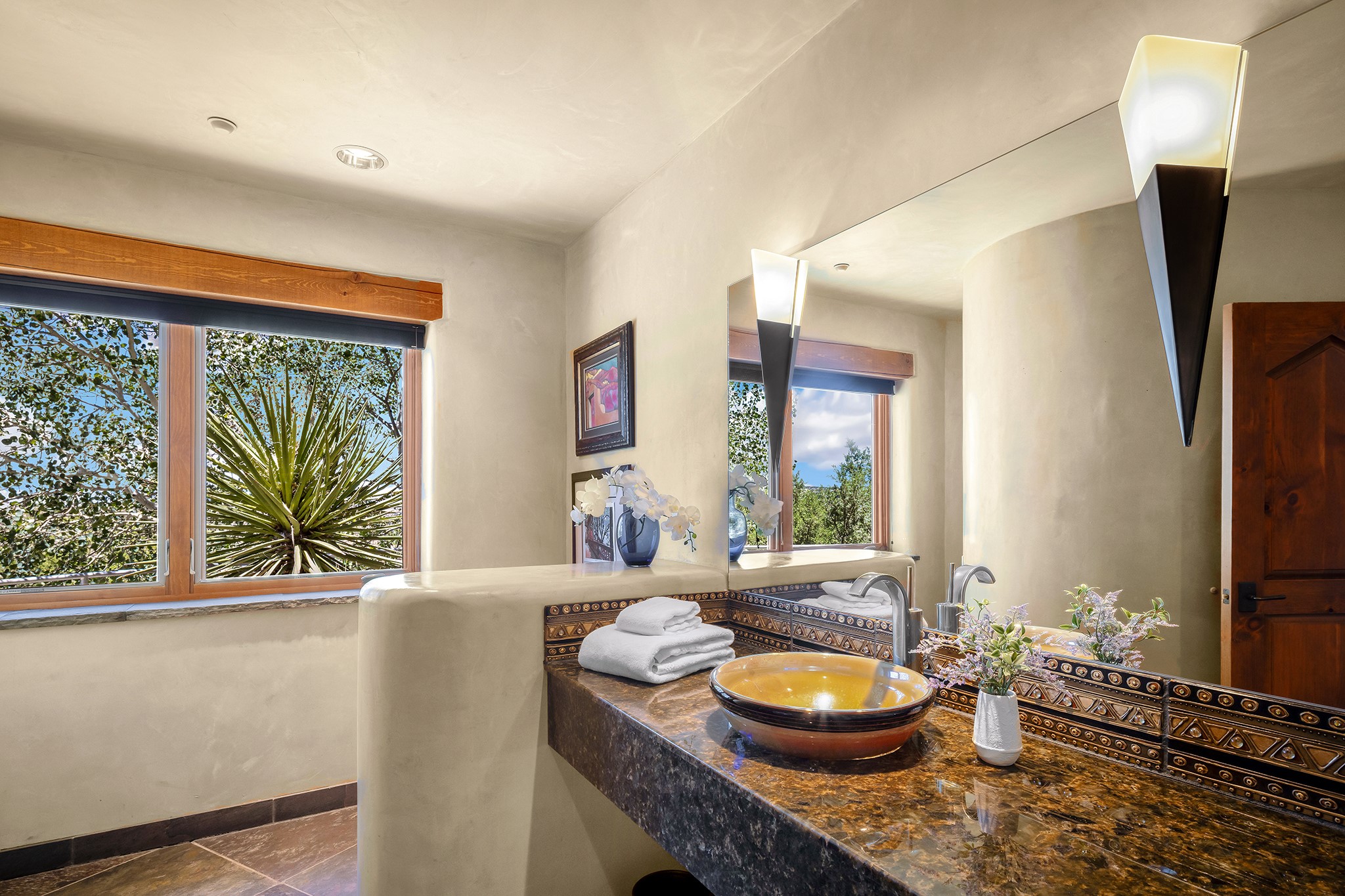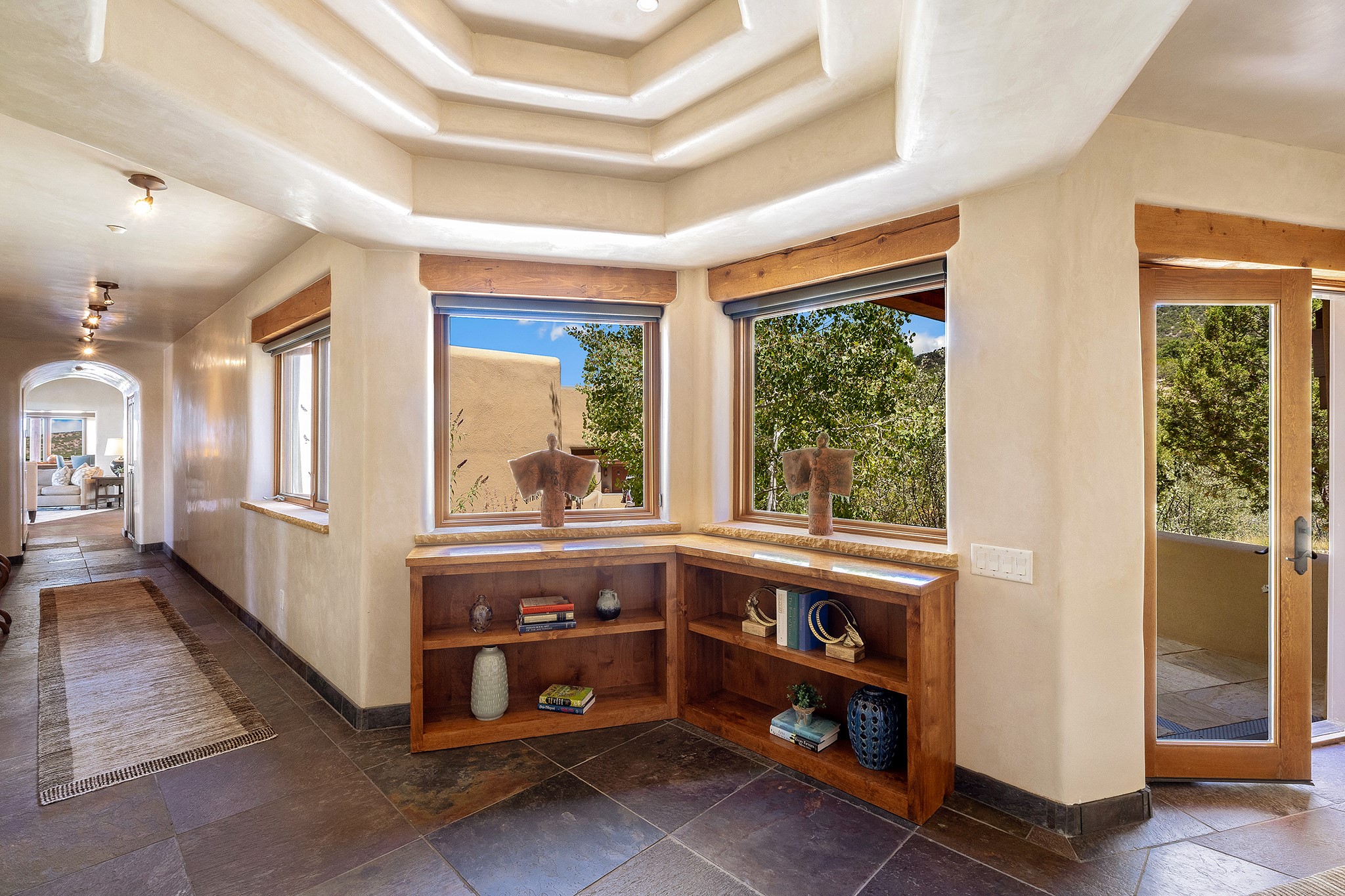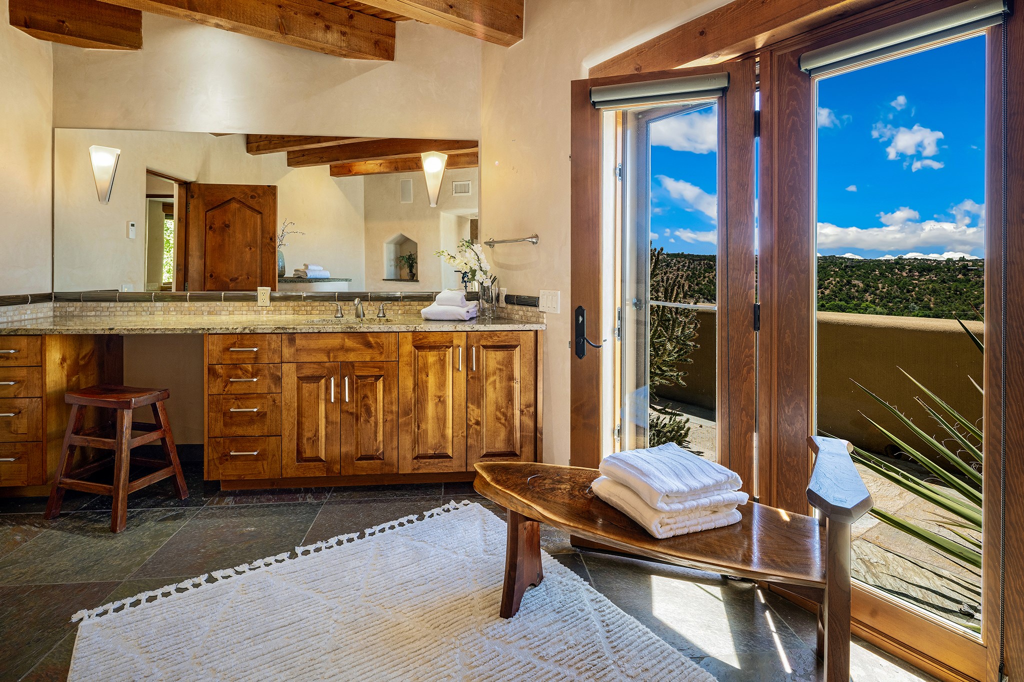 An exceptional Value in Bishop’s Lodge Hills & Villas! Perched above the Tesuque hills on 2.38 acres, 9 Lodge Circle offers a rare combination of panoramic mountain views and a unique Southwestern design—all just minutes from the Plaza. Set within the gated community of Bishop’s Lodge Hills and Villas, this extraordinary property includes a 4,300 sq. ft. main residence and a versatile 1,500 sq. ft. detached studio, with commanding views of both the Jemez and Sangre de Cristo mountain ranges. The main home is a masterclass in design, showcasing a unique architectural blend of contemporary and Southwestern influences. The central living area features disappearing glass doors that open to a sweeping west-facing portal—perfect for soaking in Santa Fe’s golden-hour light. An outdoor cantina with a gas fireplace and built-in grill sets the stage for elegant al fresco entertaining.The chef’s kitchen is equally inspired, with a spacious island, cozy banco, butler’s pantry, dumbwaiter, and an expansive picture window framing the Sangres. A dramatic dining room with a raised octagonal ceiling and fireplace offers a captivating setting for both intimate and grand gatherings. The primary suite is a private sanctuary, complete with a secluded hot tub for sunset views and stargazing. Two guest suites each offer ensuite baths, while a separate office provides quiet space for work or reflection. The detached 1,500 sq. ft. studio—originally a woodworking shop— brimming with potential as a creative studio, gym, or guest quarters. As a bonus, ownership includes social membership privileges at the world-renowned Bishop’s Lodge Resort. With its new price of $3,395,000, this exceptional property presents a compelling value in one of Santa Fe’s most coveted locations—where design, privacy, and inspiration converge.