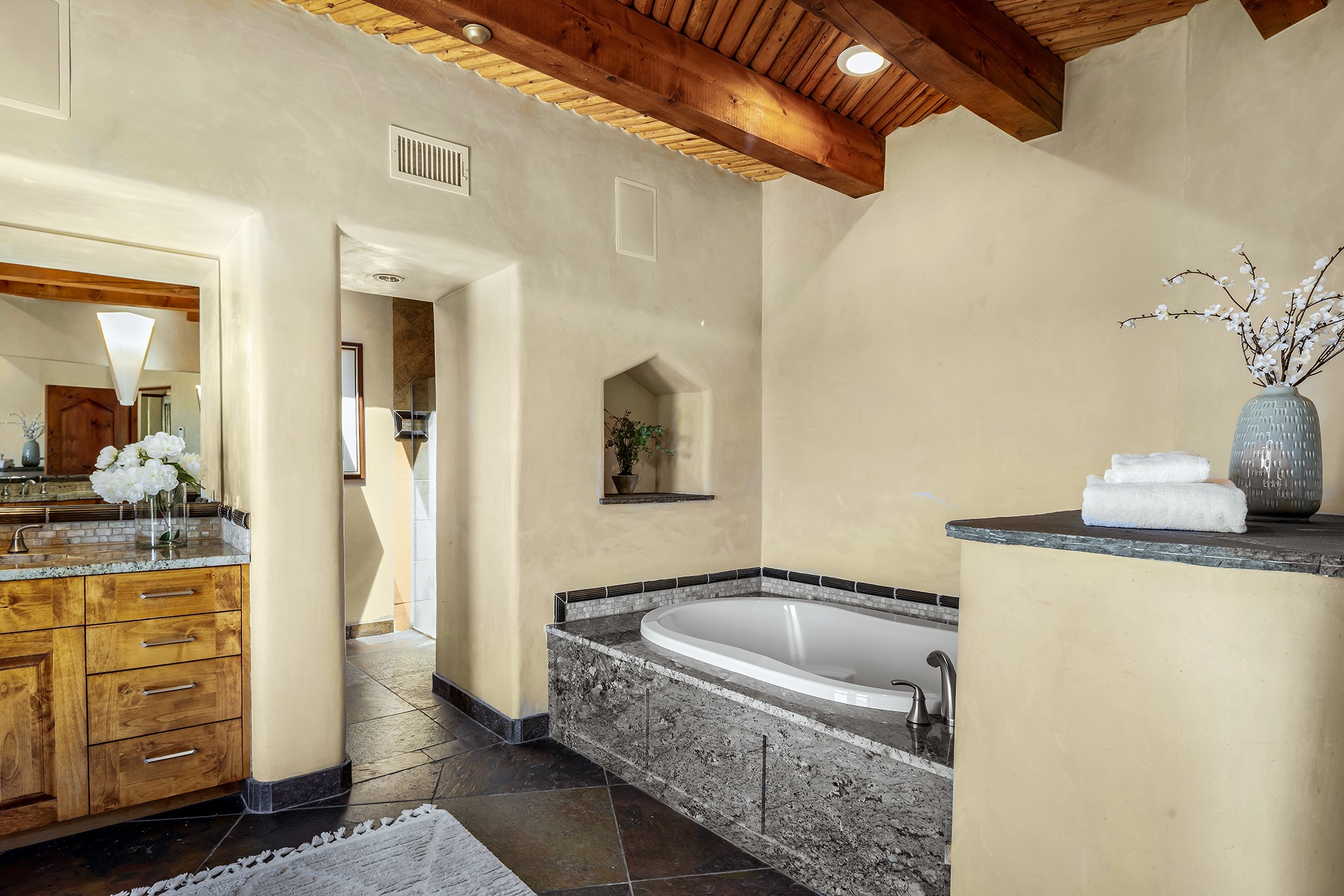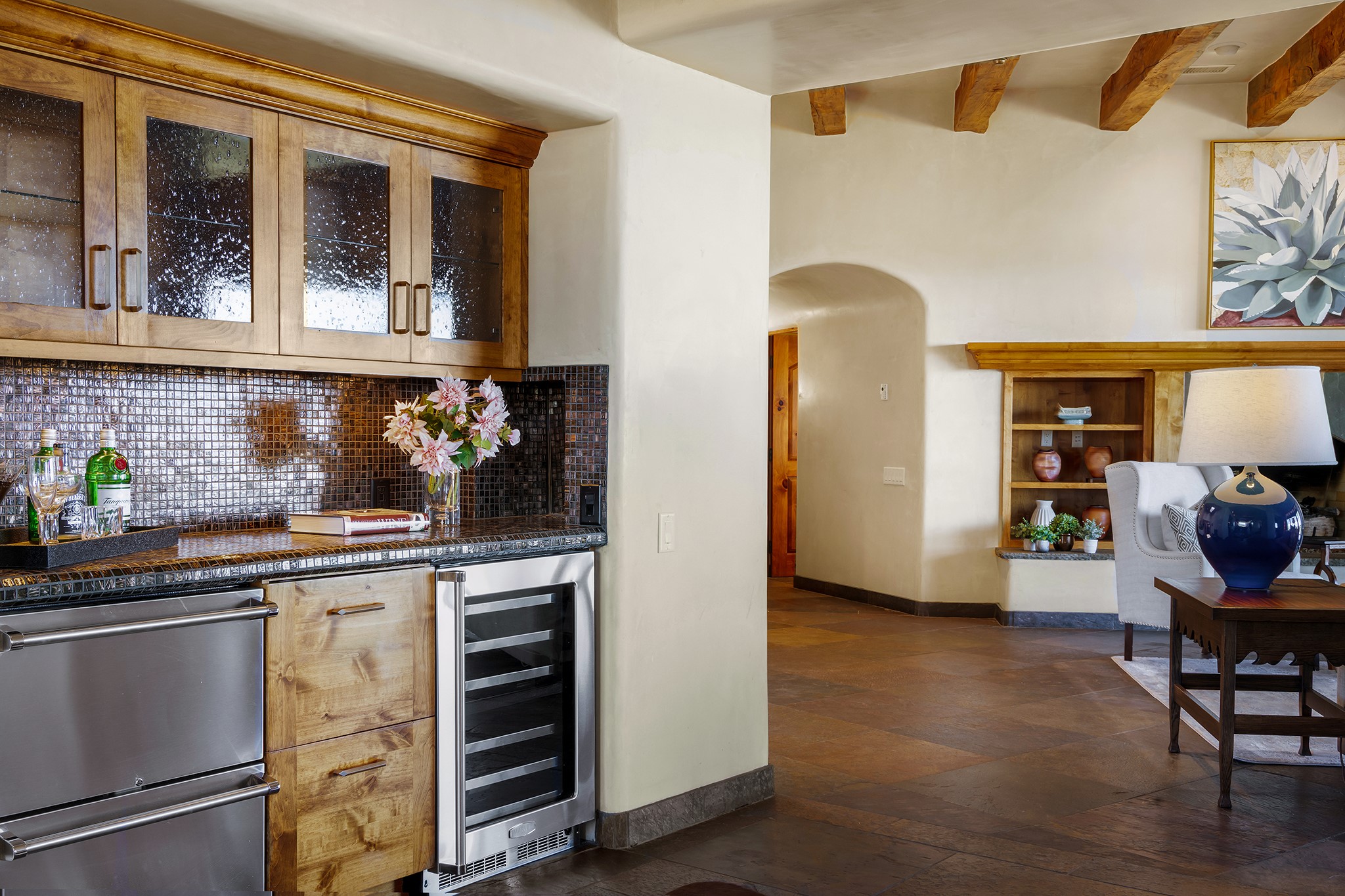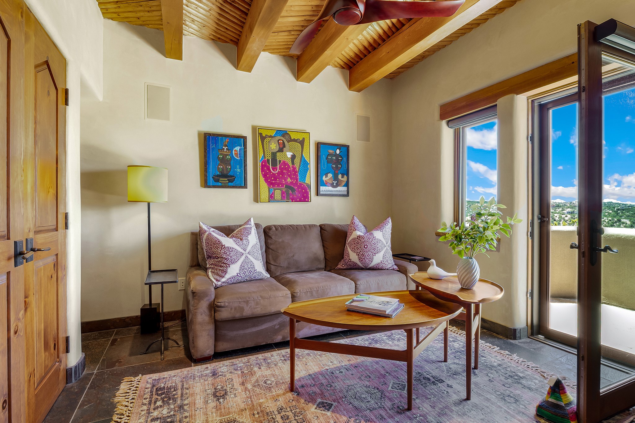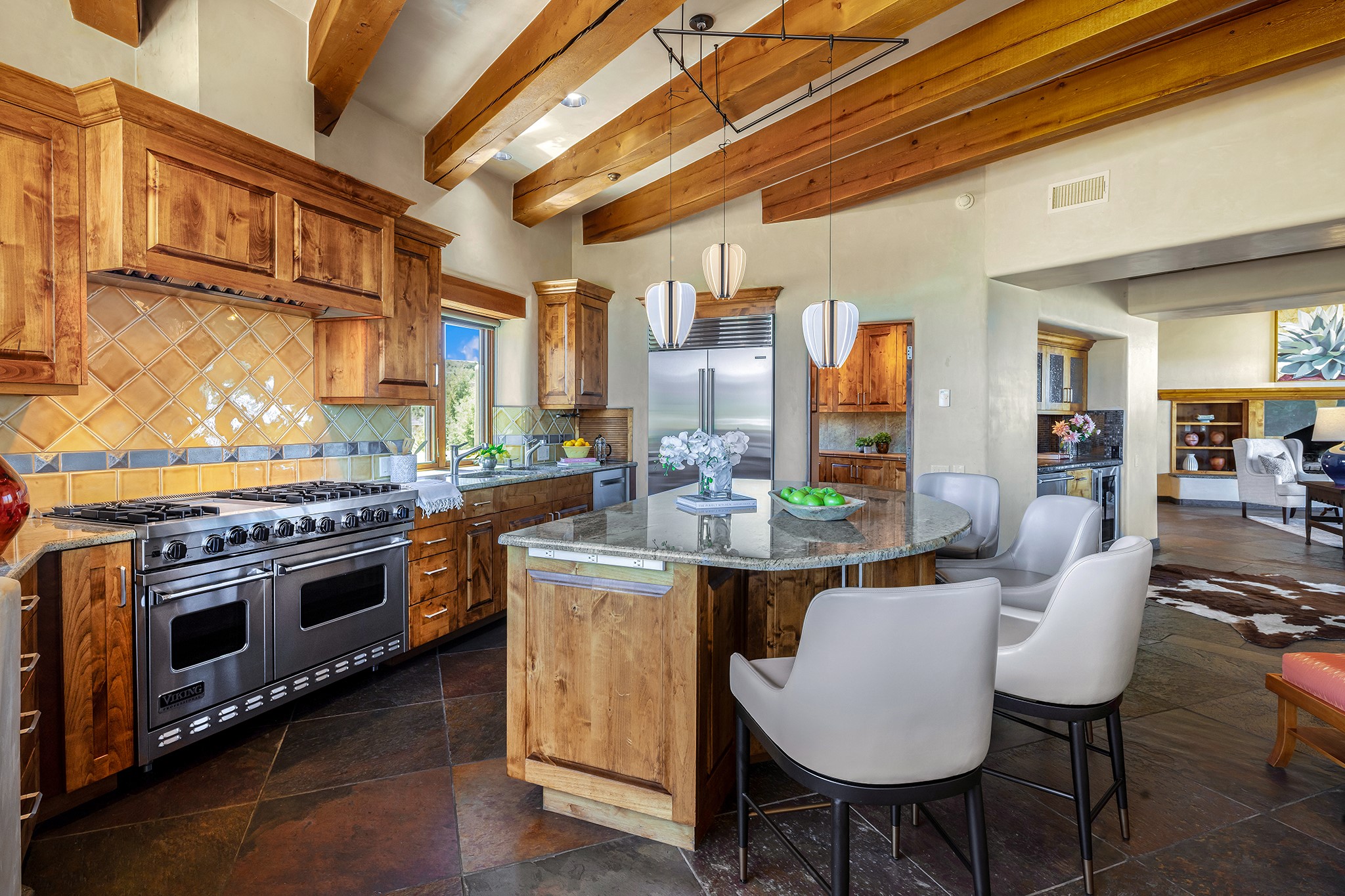 An exceptional Value in Bishop’s Lodge Hills & Villas! Perched above the Tesuque hills on 2.38 acres, 9 Lodge Circle offers a rare combination of panoramic mountain views and a unique Southwestern design—all just minutes from the Plaza. Set within the gated community of Bishop’s Lodge Hills and Villas, this extraordinary property includes a 4,300 sq. ft. main residence and a versatile 1,500 sq. ft. detached studio, with commanding views of both the Jemez and Sangre de Cristo mountain ranges. The main home is a masterclass in design, showcasing a unique architectural blend of contemporary and Southwestern influences. The central living area features disappearing glass doors that open to a sweeping west-facing portal—perfect for soaking in Santa Fe’s golden-hour light. An outdoor cantina with a gas fireplace and built-in grill sets the stage for elegant al fresco entertaining.The chef’s kitchen is equally inspired, with a spacious island, cozy banco, butler’s pantry, dumbwaiter, and an expansive picture window framing the Sangres. A dramatic dining room with a raised octagonal ceiling and fireplace offers a captivating setting for both intimate and grand gatherings. The primary suite is a private sanctuary, complete with a secluded hot tub for sunset views and stargazing. Two guest suites each offer ensuite baths, while a separate office provides quiet space for work or reflection. The detached 1,500 sq. ft. studio—originally a woodworking shop— brimming with potential as a creative studio, gym, or guest quarters. As a bonus, ownership includes social membership privileges at the world-renowned Bishop’s Lodge Resort. With its new price of $3,395,000, this exceptional property presents a compelling value in one of Santa Fe’s most coveted locations—where design, privacy, and inspiration converge.