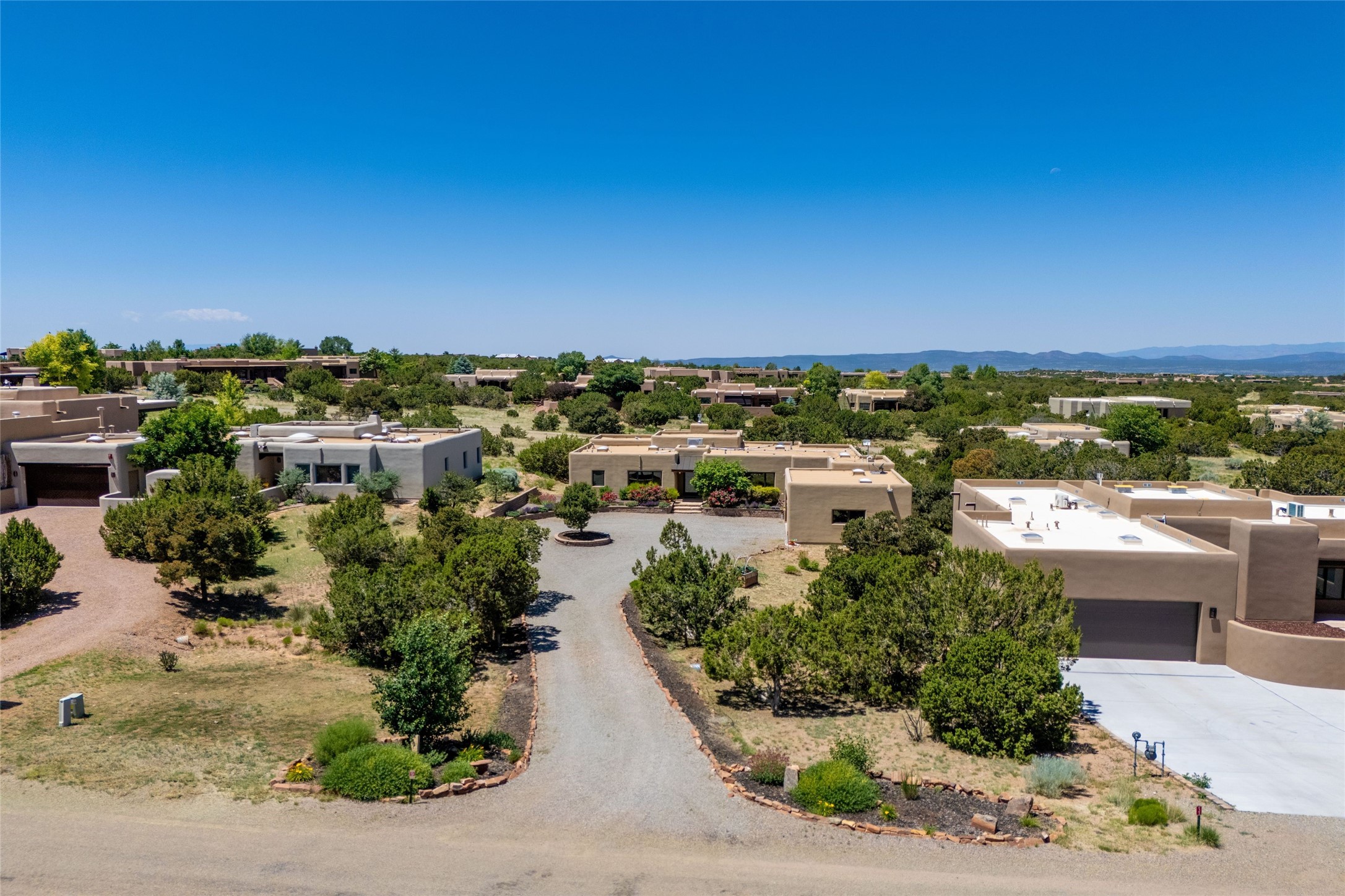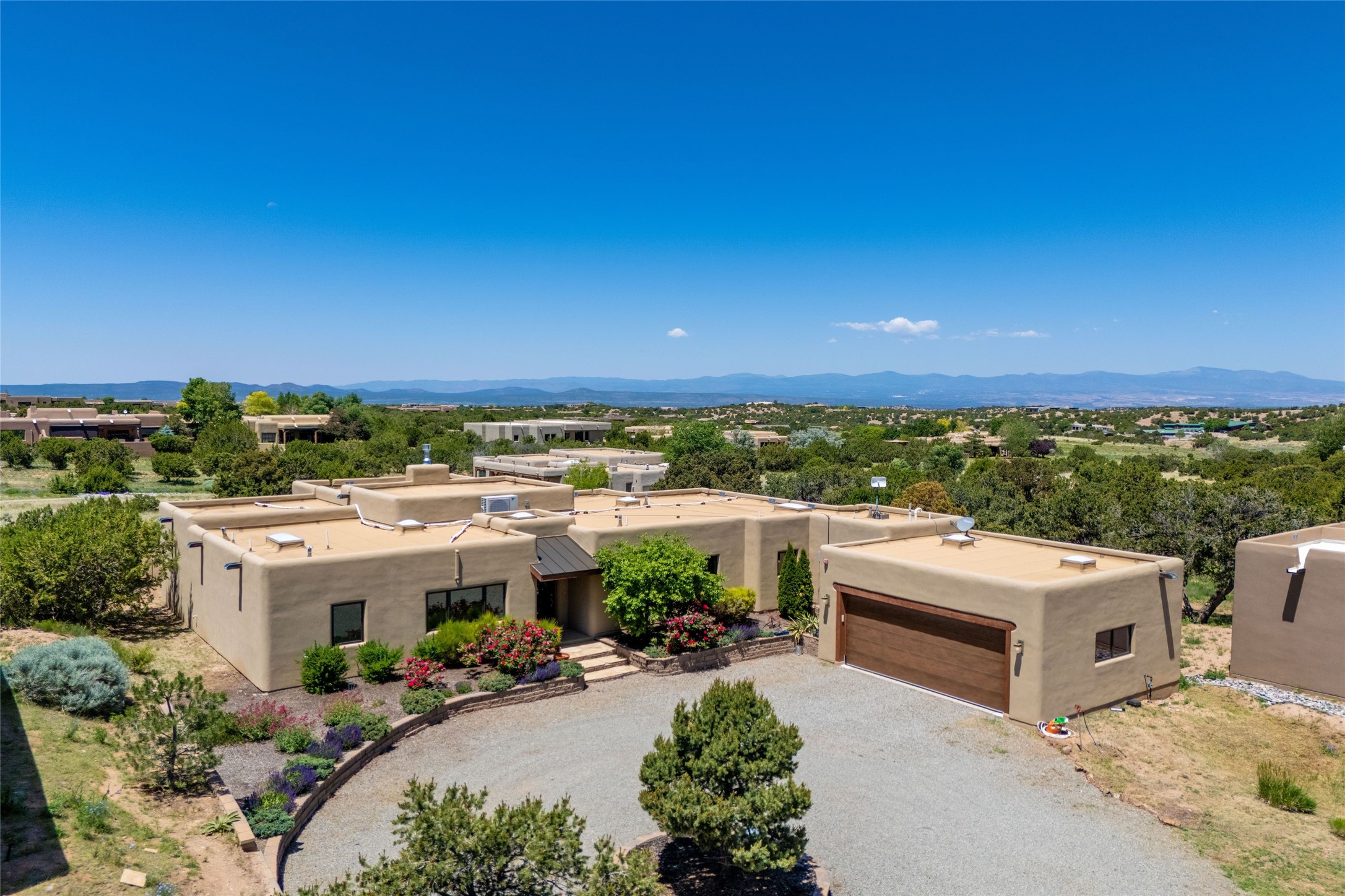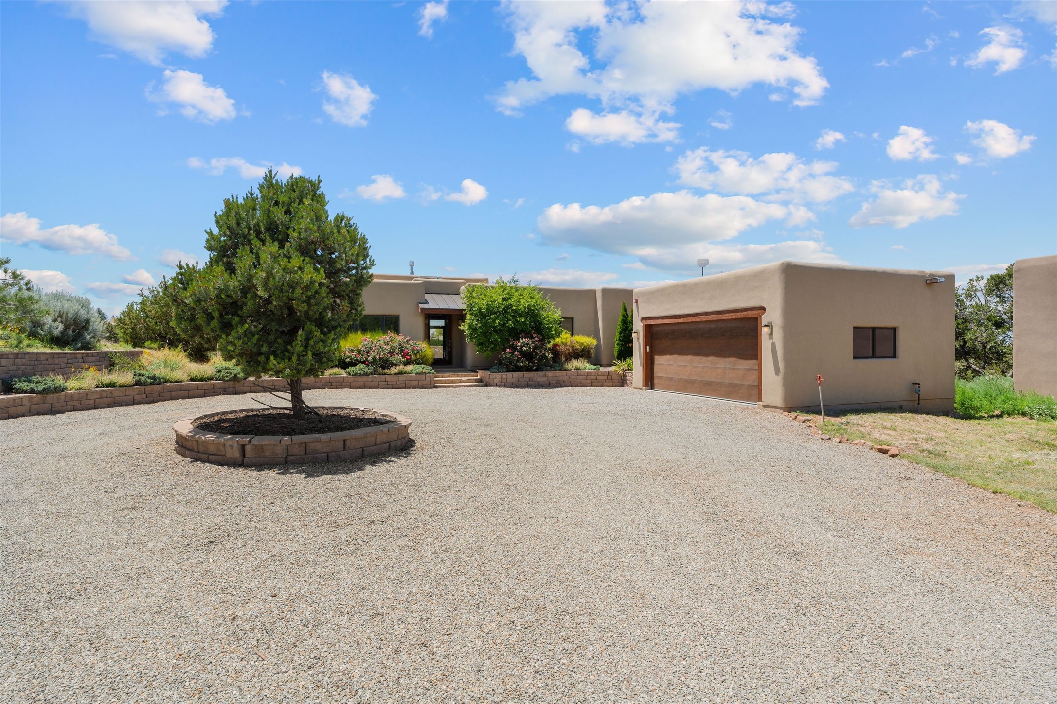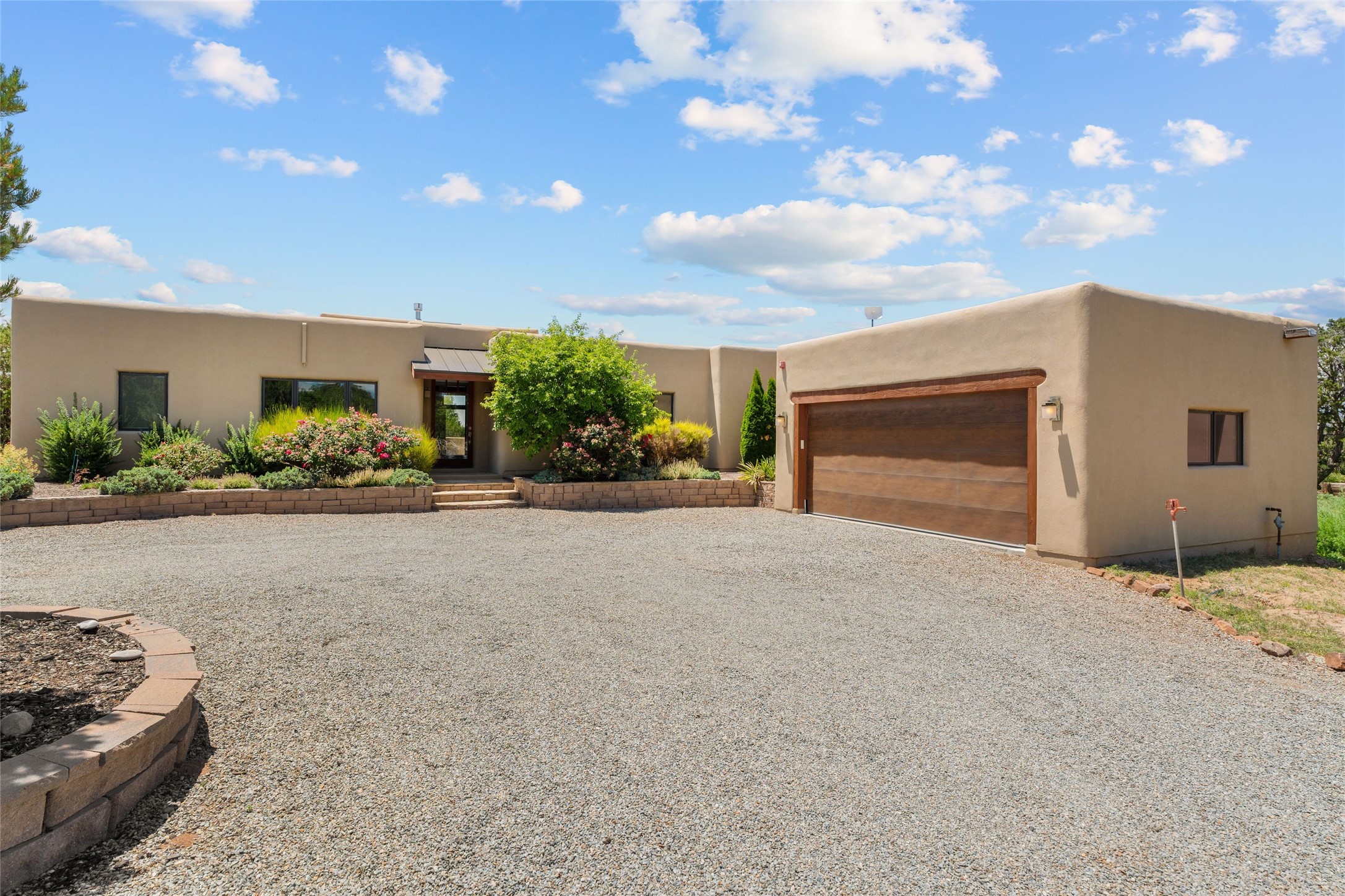 Heartstone community 3-bedroom, 3.5-bath soft contemporary home featuring sleek concrete floors, harmoniously paired with traditional Santa Fe elements, including iconic vigas and beams. Designed for convenience, this single-level property offers a spacious layout with no interior steps, making it accessible and easy to navigate. Enjoy the luxury of two living areas, ideal for relaxation and entertaining friends and family. The large kitchen and dining area provide the perfect backdrop for memorable gatherings. Step outside to the back portal, where a generous backyard awaits, offering sweeping views of the Jemez mountains that elevate outdoor living. In addition, enjoy Sangre de Cristo views from the front. Heartstone is characterized by half-acre lots, thoughtfully arranged around a shared meadow and many acres of permanently dedicated open space, fostering a connection to nature and tranquility. For those who enjoy an active lifestyle, the community is surrounded by a network of trails, granting access to the La Tierra Trails—a multi-use system featuring 25 miles of paths designed for hikers, cyclists, and equestrians alike. The community house serves as a venue for social gatherings and activities, complemented by exercise areas and a media room. Located in the desirable Tano Road area, this residence provides easy access to the vibrant Santa Fe Plaza, the artistic charm of Canyon Road, the Santa Fe's Farmer’s Market, and the renowned Santa Fe Opera.