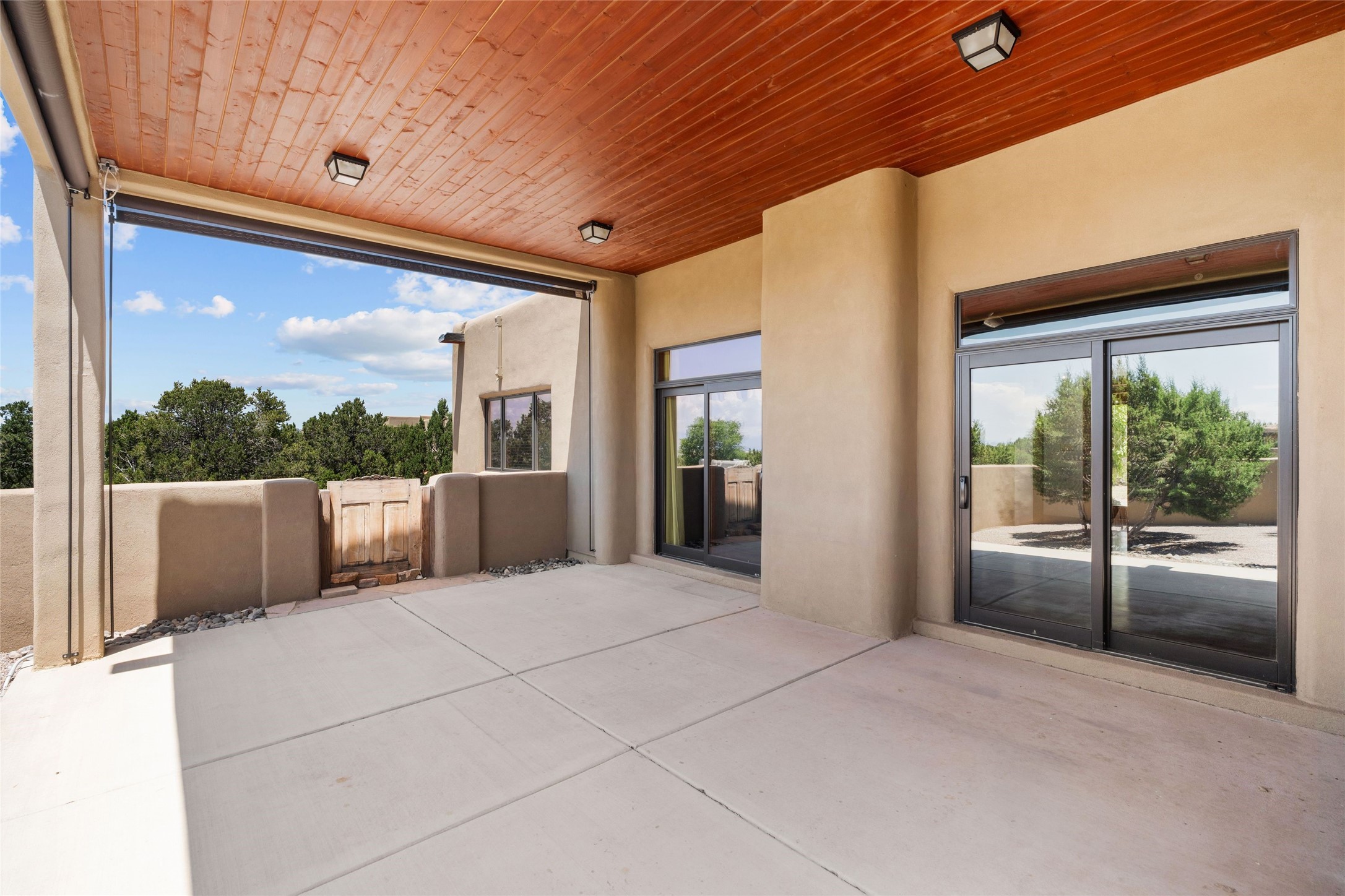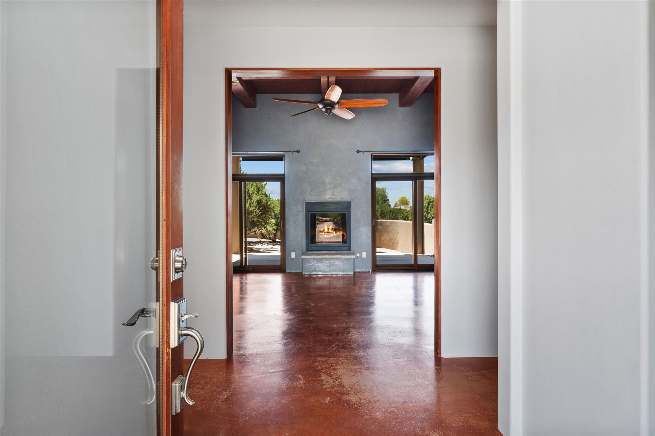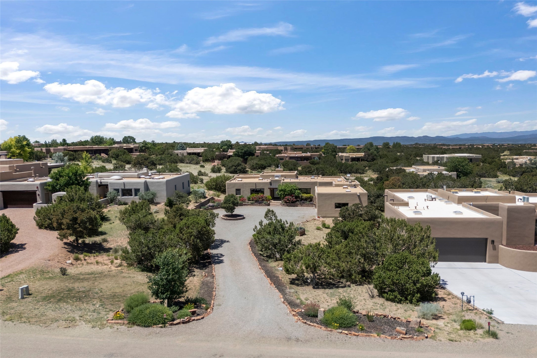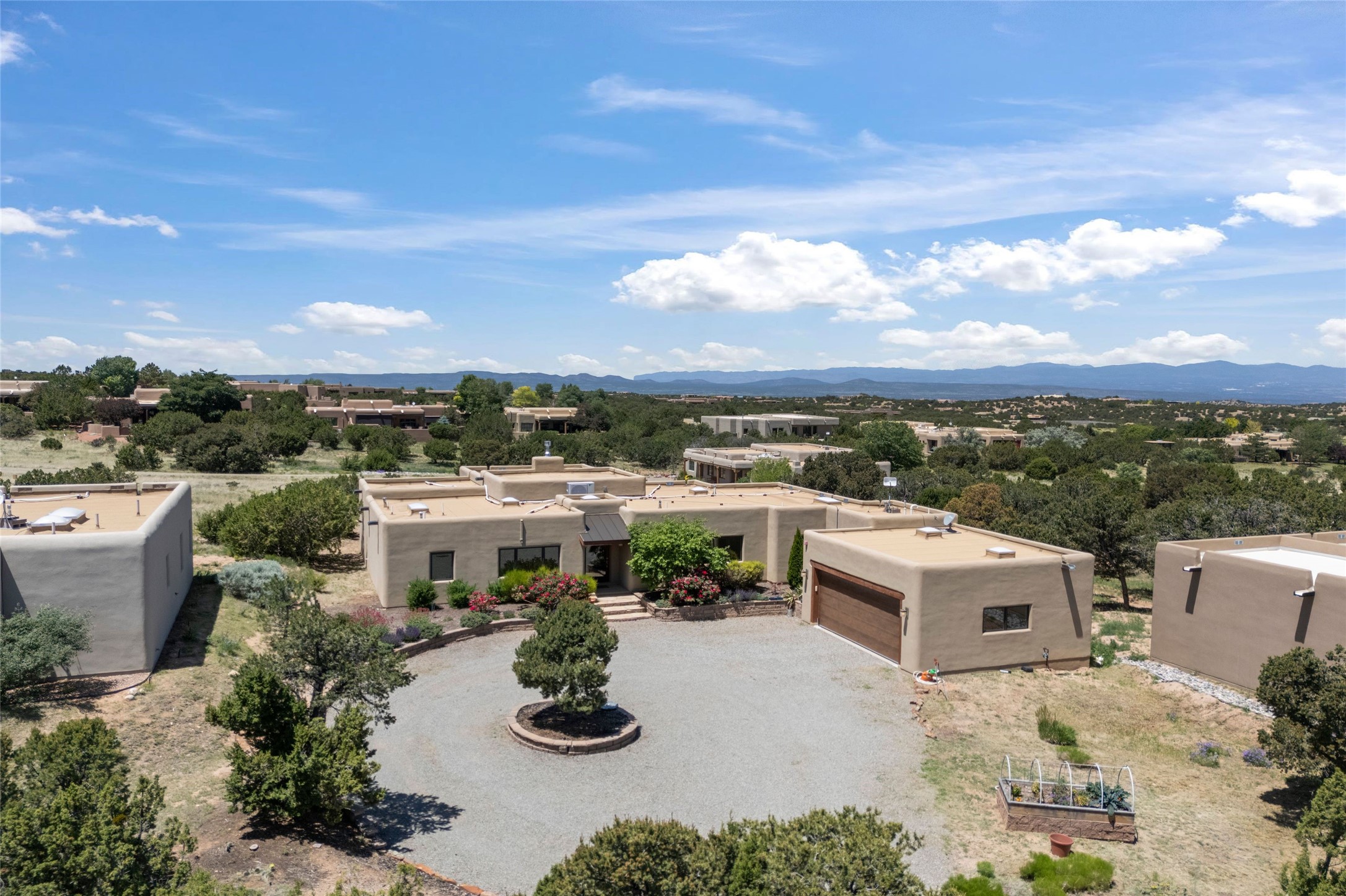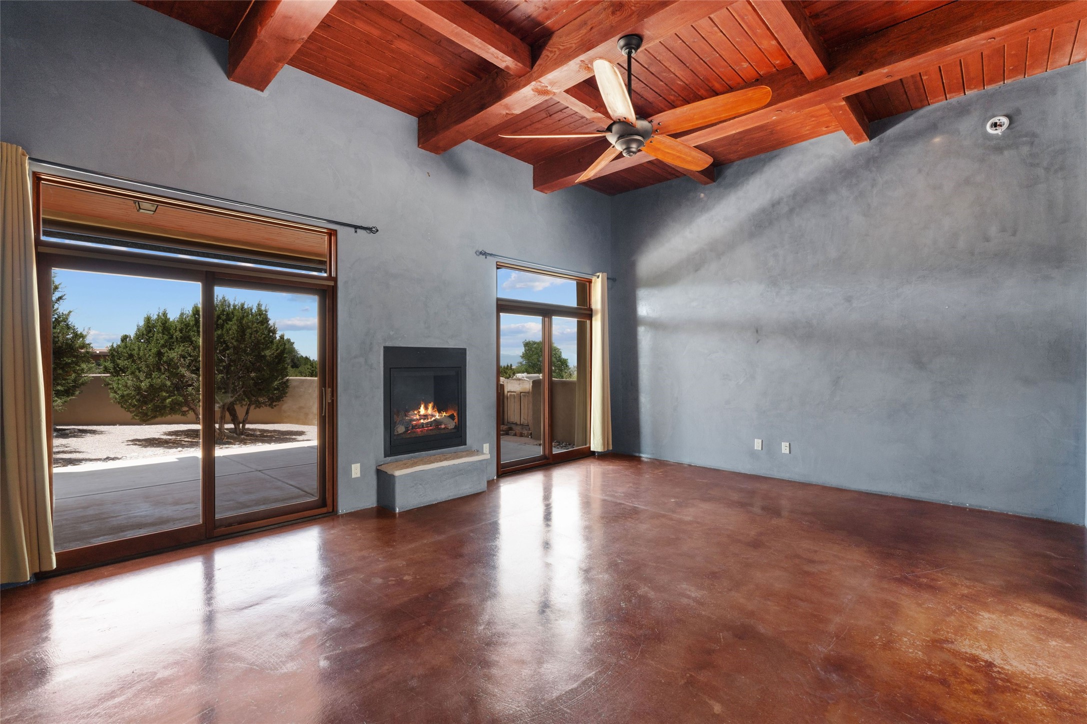 Heartstone community 3-bedroom, 3.5-bath soft contemporary home featuring sleek concrete floors, harmoniously paired with traditional Santa Fe elements, including iconic vigas and beams. Designed for convenience, this single-level property offers a spacious layout with no interior steps, making it accessible and easy to navigate. Enjoy the luxury of two living areas, ideal for relaxation and entertaining friends and family. The large kitchen and dining area provide the perfect backdrop for memorable gatherings. Step outside to the back portal, where a generous backyard awaits, offering sweeping views of the Jemez mountains that elevate outdoor living. In addition, enjoy Sangre de Cristo views from the front. Heartstone is characterized by half-acre lots, thoughtfully arranged around a shared meadow and many acres of permanently dedicated open space, fostering a connection to nature and tranquility. For those who enjoy an active lifestyle, the community is surrounded by a network of trails, granting access to the La Tierra Trails—a multi-use system featuring 25 miles of paths designed for hikers, cyclists, and equestrians alike. The community house serves as a venue for social gatherings and activities, complemented by exercise areas and a media room. Located in the desirable Tano Road area, this residence provides easy access to the vibrant Santa Fe Plaza, the artistic charm of Canyon Road, the Santa Fe's Farmer’s Market, and the renowned Santa Fe Opera.