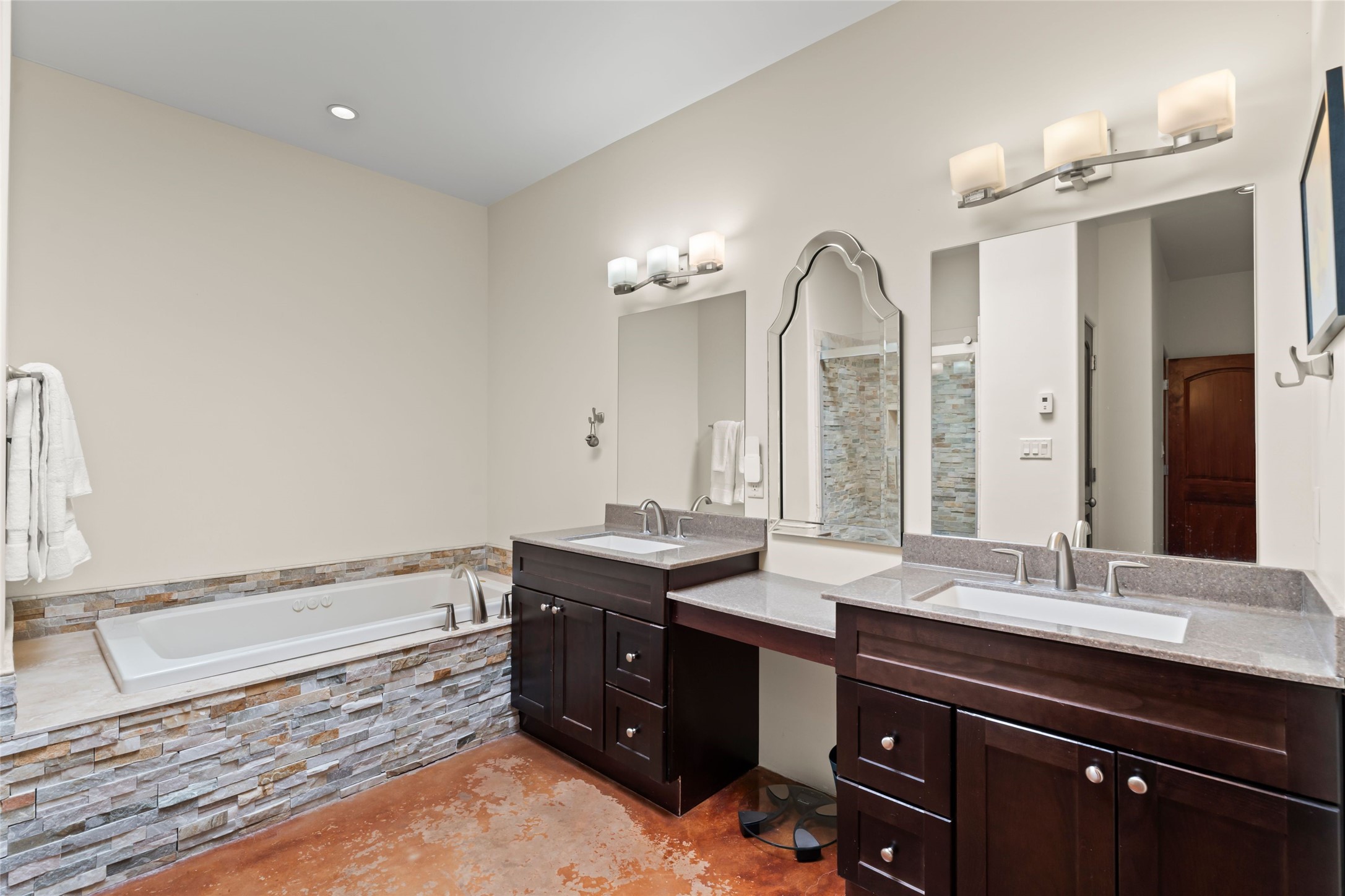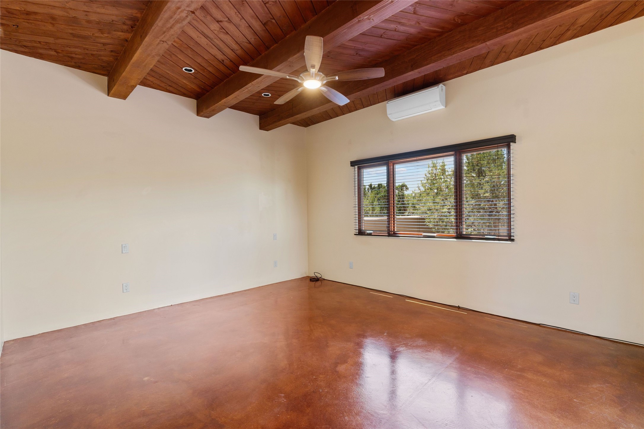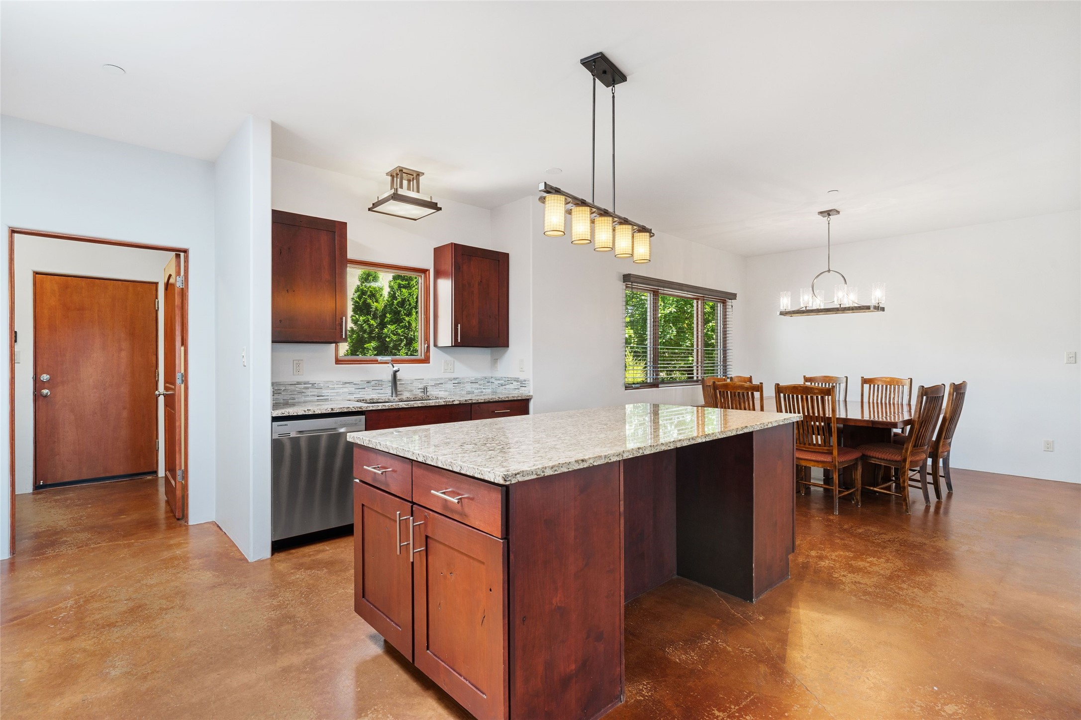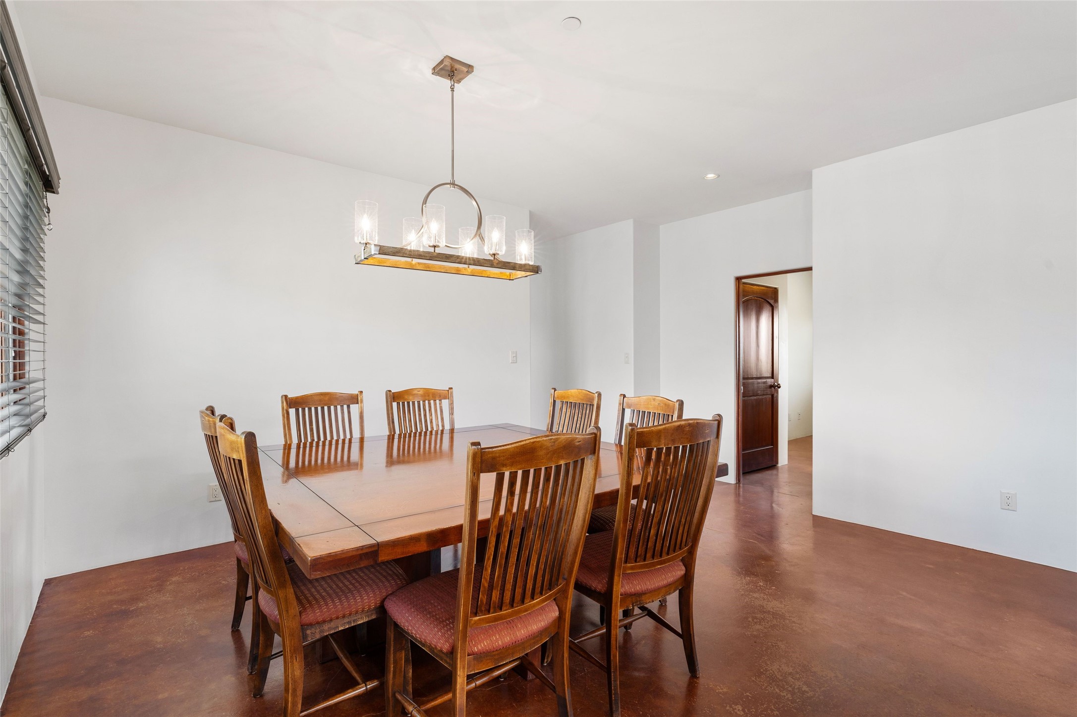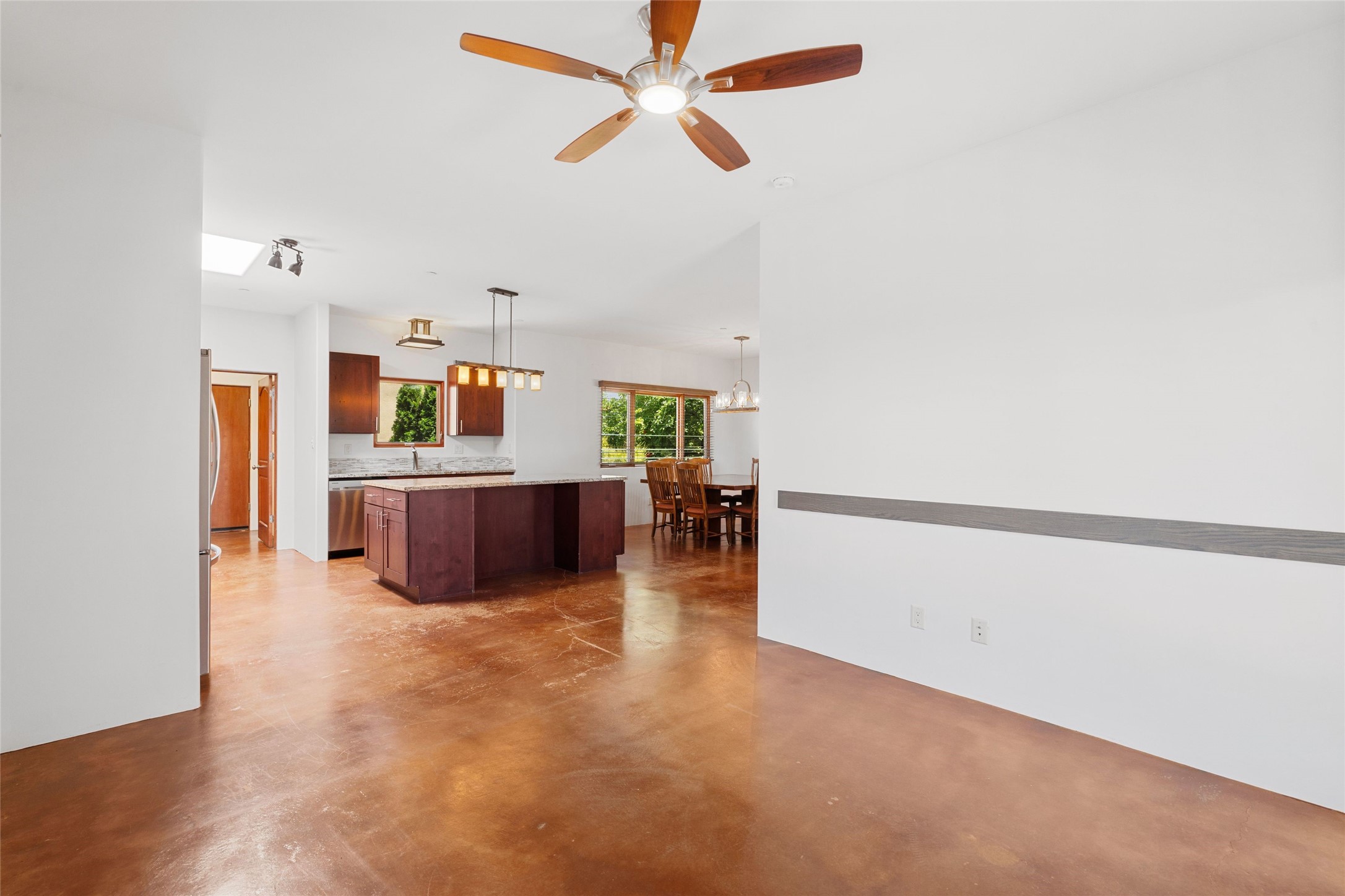 Heartstone community 3-bedroom, 3.5-bath soft contemporary home featuring sleek concrete floors, harmoniously paired with traditional Santa Fe elements, including iconic vigas and beams. Designed for convenience, this single-level property offers a spacious layout with no interior steps, making it accessible and easy to navigate. Enjoy the luxury of two living areas, ideal for relaxation and entertaining friends and family. The large kitchen and dining area provide the perfect backdrop for memorable gatherings. Step outside to the back portal, where a generous backyard awaits, offering sweeping views of the Jemez mountains that elevate outdoor living. In addition, enjoy Sangre de Cristo views from the front. Heartstone is characterized by half-acre lots, thoughtfully arranged around a shared meadow and many acres of permanently dedicated open space, fostering a connection to nature and tranquility. For those who enjoy an active lifestyle, the community is surrounded by a network of trails, granting access to the La Tierra Trails—a multi-use system featuring 25 miles of paths designed for hikers, cyclists, and equestrians alike. The community house serves as a venue for social gatherings and activities, complemented by exercise areas and a media room. Located in the desirable Tano Road area, this residence provides easy access to the vibrant Santa Fe Plaza, the artistic charm of Canyon Road, the Santa Fe's Farmer’s Market, and the renowned Santa Fe Opera.